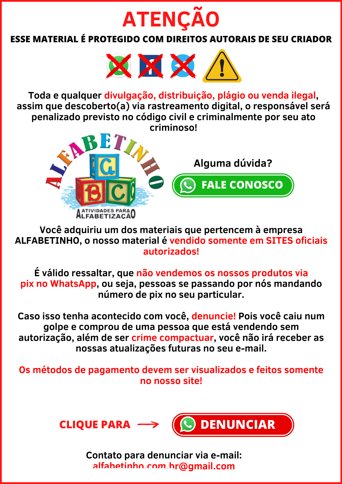ESSE MATERIAL É PROTEGIDO COM DIREITOS AUTORAIS DE SEU CRIADOR Toda e qualquer divulgação, distribuição, plágio ou venda ilegal, assim que descoberto(a) via rastreamento digital, o responsável será penalizado previsto no código civil e criminalmente por seu ato criminoso! CLIQUE PARA Você adquiriu um dos materiais que pertencem à empresa ALFABETINHO, o nosso material é vendido somente em SITES oficiais autorizados! É válido ressaltar, que não vendemos os nossos produtos via pix no WhatsApp, ou seja, pessoas se passando por nós mandando número de pix no seu particular. Caso isso tenha acontecido com você, denuncie! Pois você caiu num golpe e comprou de uma pessoa que está vendendo sem autorização, além de ser crime compactuar, você não irá receber as nossas atualizações futuras no seu e-mail. Os métodos de pagamento devem ser visualizados e feitos somente no nosso site! ATENÇÃO Contato para denunciar via e-mail: alfabetinho.com.br@gmail.com DENUNCIAR FALE CONOSCO Alguma dúvida? Conteúdo licenciado para Gabriel Silva de Assis - 145.147.807-07 https://api.whatsapp.com/send?phone=554497031816&text=Ol%C3%A1!%20Gostaria%20de%20conversar%20um%20assunto. https://api.whatsapp.com/send?phone=554497031816&text=Ol%C3%A1%2C%20poderia%20me%20ajudar%3F%20 Primeiramente gostariamos de agradecer a sua confiança em nosso trabalho. Obrigado! PARABÉNS PELA COMPRA! Escolha uma página que mais gostou desse arquivo e tire uma foto ou grave um vídeo. Poste a foto ou vídeo no seu story e marque nosso Instagram oficial @alfabetinho_ Prontinho, feito isso iremos te encaminhar no seu direct um presente exclusivo, que são: 100 atividades de alfabetização 2023. Quer ganhar um presente exclusivo gratuitamente? Viu como é fácil, mas atenção, se sua conta no Instagram for privada, nós não seremos notificados sobre a sua marcação, ou seja, não saberemos que você marcou a gente, neste caso se sua conta for privada, poste no seu story, marque a gente, tire um print e nos mande no direct. Basta seguir estes 3 passos abaixo: 01 02 03 veja como é simples e fácil ganhar! Conteúdo licenciado para Gabriel Silva de Assis - 145.147.807-07 PROFISSIONAIS QUE ATUAM MAIS DE 15 ANOS NA ÁREA! QUALIDADE E SUPORTE PARA CLIENTES Boas vindas! CONHEÇA OS AUTORES REDE PEDAGÓGICA DE PROFESSORES ESPECIALIZADOS AMOR A EDUCAÇÃO INFANTIL E MATERIAIS EXCLUSIVOS! @redeeduca @alfabetinho_ @educaprofessores Conteúdo licenciado para Gabriel Silva de Assis - 145.147.807-07 https://www.instagram.com/redeeduca/ https://www.instagram.com/alfabetinho_/ https://www.instagram.com/redeeduca/ https://www.instagram.com/alfabetinho_/ https://www.instagram.com/educaprofessores/ https://www.instagram.com/educaprofessores/ https://www.instagram.com/educaprofessores/ 20242024 ANUALANUAL ATIVIDADESATIVIDADES BNCC 2024BNCC 2024 ARTEARTE 4º ANO4º ANO Conteúdo licenciado para Gabriel Silva de Assis - 145.147.807-07 Professora(o): Escola: Data: Aluno(a): Turma: Semestre: Objetivos de aprendizagem e desenvolvimento: Habilidades (EF15AR04) Faça em uma folha, um desenho sobre o Forte São João Patrimônio Histórico de Bertioga e a natureza em sua volta (como a praia e a vegetação), não esqueça de colorir,(pode usar lápis de cor e, giz de cera, tinta guache e outros materiais que você tiver). Observe algumas imagens como referência: Conteúdo licenciado para Gabriel Silva de Assis - 145.147.807-07 Objetivos de aprendizagem e desenvolvimento: Habilidades (EF15AR04) Professora(o): Escola: Data: Aluno(a): Turma: Semestre: A mata Atlântica é aqui. Na época do descobrimento do Brasil, a Mata Atlântica era contínua como a floresta Amazónica e constituía a segunda maior floresta tropical do Brasil. Ela abrangia uma grande área que se estende ao longo de 17 estados brasileiros. Hoje em dia, já perdemos uma grande parte dessa floresta, que por muitos séculos foi a casa de tantos animais, plantas e comunidades. Em Bertioga, nós temos o Parque estadual da Restinga de Bertioga (PERB) que ocupa mais de 90% de área preservada no município. E mesmo um privilégio nossa cidade, não é mesmo? A praia de Itaguaré, por exemplo, é uma parte intocada da natureza na nossa cidade, porque está protegida por uma lei municipal de preservação ambiental. Além de praias lindas, temos também muitos rios que cortam e enriquecem Bertioga. São muitas as belezas e atrações para quem gosta de natureza e tranquilidade e está disposto a caminhar em trilhas. Preservar a natureza é cuidar da casa e preservar a vida. Agora leia um trecho da música do Arnaldo Antunes e reflita sobre essa letra. Depois na folha a seguir, faça uma ilustração sobre ela e a importância de cuidar da nossa Terra. "Na nossa casa Na nossa casa amor-perfeito é mato E o teto estrelado também tem luar A nossa casa até parece um ninho Vem um passarinho pra nos acordar Na nossa casa passa um rio no meio E o nosso leito pode ser o mar A nossa casa é onde a gente está A nossa casa é em todo lugar A nossa casa é onde a gente está A nossa casa é em todo lugar..." Conteúdo licenciado para Gabriel Silva de Assis - 145.147.807-07 Objetivos de aprendizagem e desenvolvimento: Habilidades (EF15AR04) Professora(o): Escola: Data: Aluno(a): Turma: Semestre: ILUSTRANDO... "A importância de cuidar da nossa terra" Conteúdo licenciado para Gabriel Silva de Assis - 145.147.807-07 Professora(o): Escola: Data: Aluno(a): Turma: Semestre: Objetivos de aprendizagem e desenvolvimento: Habilidades (EF15AR04) TANGRAM Vamos montar figuras com o tangram? Recorte as sete partes e crie o seu desenho. Depois cole aqui Conteúdo licenciado para Gabriel Silva de Assis - 145.147.807-07 Professora(o): Escola: Data: Aluno(a): Turma: Semestre: Objetivos de aprendizagem e desenvolvimento: Habilidades (EF15AR04) • Procure em revistas uma figura que tenha pessoas ou família e faça um esboço no seu caderno. • Escolha uma figura, recorte-a em tiras e formas retangul