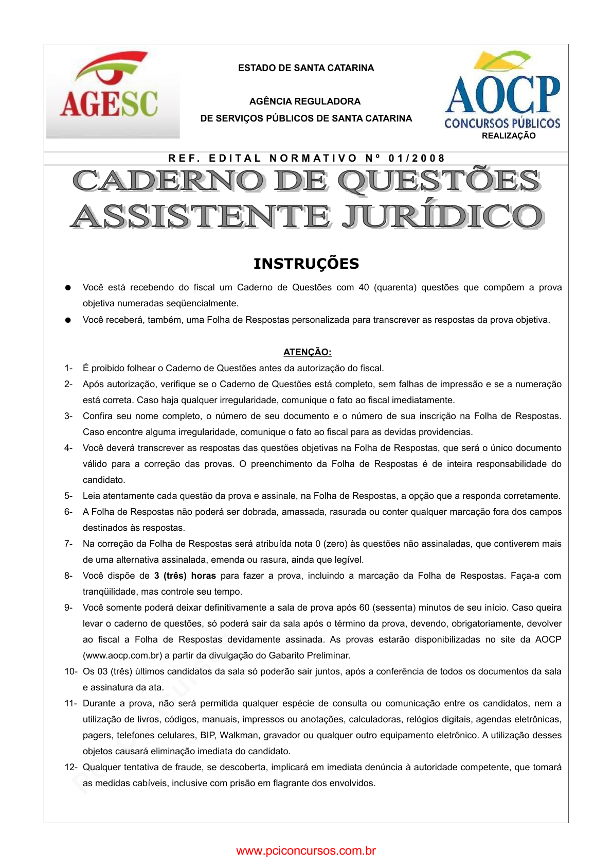 pcimarkpci MDAwMDowMDAwOjAwMDA6MDAwMDowMDAwOmZmZmY6Yzk1OToyZjk5:TW9uLCAyNiBGZWIgMjAyNCAwMzowNDowOCAtMDMwMA== www.pciconcursos.com.br ESTADO DE SANTA CATARINA AGÊNCIA REGULADORA DE SERVIÇOS PÚBLICOS DE SANTA CATARINA REALIZAÇÃO R E F . E D I T A L N O R M A T I V O N º 0 1 / 2 0 0 8 INSTRUÇÕES ● Você está recebendo do fiscal um Caderno de Questões com 40 (quarenta) questões que compõem a prova objetiva numeradas seqüencialmente. ● Você receberá, também, uma Folha de Respostas personalizada para transcrever as respostas da prova objetiva. ATENÇÃO: 1- É proibido folhear o Caderno de Questões antes da autorização do fiscal. 2- Após autorização, verifique se o Caderno de Questões está completo, sem falhas de impressão e se a numeração está correta. Caso haja qualquer irregularidade, comunique o fato ao fiscal imediatamente. 3- Confira seu nome completo, o número de seu documento e o número de sua inscrição na Folha de Respostas. Caso encontre alguma irregularidade, comunique o fato ao fiscal para as devidas providencias. 4- Você deverá transcrever as respostas das questões objetivas na Folha de Respostas, que será o único documento válido para a correção das provas. O preenchimento da Folha de Respostas é de inteira responsabilidade do candidato. 5- Leia atentamente cada questão da prova e assinale, na Folha de Respostas, a opção que a responda corretamente. 6- A Folha de Respostas não poderá ser dobrada, amassada, rasurada ou conter qualquer marcação fora dos campos destinados às respostas. 7- Na correção da Folha de Respostas será atribuída nota 0 (zero) às questões não assinaladas, que contiverem mais de uma alternativa assinalada, emenda ou rasura, ainda que legível. 8- Você dispõe de 3 (três) horas para fazer a prova, incluindo a marcação da Folha de Respostas. Faça-a com tranqüilidade, mas controle seu tempo. 9- Você somente poderá deixar definitivamente a sala de prova após 60 (sessenta) minutos de seu início. Caso queira levar o caderno de questões, só poderá sair da sala após o término da prova, devendo, obrigatoriamente, devolver ao fiscal a Folha de Respostas devidamente assinada. As provas estarão disponibilizadas no site da AOCP (www.aocp.com.br) a partir da divulgação do Gabarito Preliminar. 10- Os 03 (três) últimos candidatos da sala só poderão sair juntos, após a conferência de todos os documentos da sala e assinatura da ata. 11- Durante a prova, não será permitida qualquer espécie de consulta ou comunicação entre os candidatos, nem a utilização de livros, códigos, manuais, impressos ou anotações, calculadoras, relógios digitais, agendas eletrônicas, pagers, telefones celulares, BIP, Walkman, gravador ou qualquer outro equipamento eletrônico. A utilização desses objetos causará eliminação imediata do candidato. 12- Qualquer tentativa de fraude, se descoberta, implicará em imediata denúncia à autoridade competente, que tomará as medidas cabíveis, inclusive com prisão em flagrante dos envolvidos. www.pciconcursos.com.br pcimarkpci MDAwMDowMDAwOjAwMDA6MDAwMDowMDAwOmZmZmY6Yzk1OToyZjk5:TW9uLCAyNiBGZWIgMjAyNCAwMzowNDowOCAtMDMwMA== www.pciconcursos.com.br FOLHA PARA ANOTAÇÃO DAS RESPOSTAS DO CANDIDATO QUESTÃO 1 2 3 4 5 6 7 8 9 10 11 12 13 14 15 16 17 18 19 20 RESP. QUESTÃO 21 22 23 24 25 26 27 28 29 30 31 32 33 34 35 36 37 38 39 40 RESP. www.pciconcursos.com.br pcimarkpci MDAwMDowMDAwOjAwMDA6MDAwMDowMDAwOmZmZmY6Yzk1OToyZjk5:TW9uLCAyNiBGZWIgMjAyNCAwMzowNDowOCAtMDMwMA== www.pciconcursos.com.br C O N H E C I M E N T O E S P E C Í F I C O 1. Em relação ao Princípio da Impessoalidade, assinale a alternativa INCORRETA. a) Toda a atuação da Administração deve visar o interesse público. b) Qualquer ato administrativo praticado com o objetivo diverso da satisfação do interesse público será anulável por desvio de poder. c) A impessoalidade da atuação administrativa impede que o ato administrativo seja praticado visando o interesse do agente ou de terceiros. d) O ato administrativo deve ater-se à vontade da lei. e) O princípio da impessoalidade veda que o agente público valha-se das atividades desenvolvidas pela Administração para obter promoção pessoal. 2. Assinale a alternativa que apresenta um caso em que o contrato regido pela Lei 8 666/93 pode ser alterado unilateralmente pela Administração, com as devidas justificativas. a) Quando houver modificação do projeto ou das especificações, para melhor adequação técnica aos seus objetivos. b) Quando for conveniente a substituição da garantia de execução. c) Quando for necessária a modificação do regime de execução da obra ou serviço, bem como do modo de fornecimento, em face de verificação técnica da inaplicabilidade dos termos contratuais originários. d) Quando for necessária a modificação da forma de pagamento, por imposição de circunstâncias supervenientes, mantido o valor inicial atualizado, vedada a antecipação do pagamento, com relação ao cronograma financeiro fixado, sem a correspondente contraprestação de fornecimento de bens ou execução de obra ou serviço. e) Para restabelecer a relação que as partes pactuaram inicialmente entre os encargos do contratado e a retribuição da administração para a justa remuneração da obra, serviço ou fornecimento, objetivando a manutenção do equilíbrio econômico- financeiro inicial do contrato, na hipótese de sobrevirem fatos imprevisíveis, ou previsíveis, porém, de conseqüências incalculáveis, retardadores ou impeditivos da execução do ajustado, ou, ainda, em caso de força maior, caso fortuito ou fato do príncipe, configurando área econômica extraordinária e extracontratual. 3. A respeito da Responsabilidade Civil Objetiva da Administração Pública, assinale a alternativa INCORRETA. a) A responsabilidade civil objetiva aplica-se às pessoas jurídicas de direito público, incluindo a Administração Di