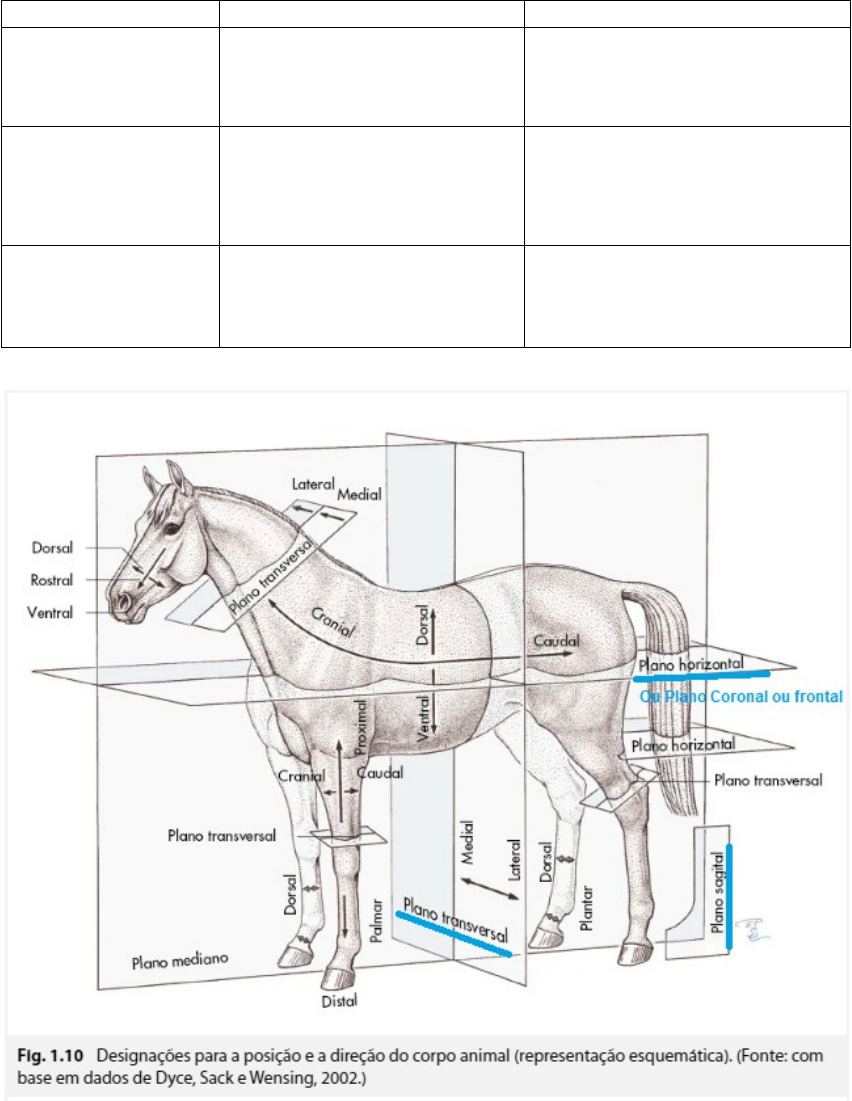 Tabela: eixos e movimentos de cada plano de divisão do corpo animal Planos Eixos Movimentos Sagital Perpendicular (90º) ao plano frontal, dividindo o corpo em duas partes, uma direita e outra esquerda O eixo perpendicular ao plano é o látero-lateral Os movimentos que ocorrem neste plano são flexão e extensão Coronal ou frontal perpendicular (90º) ao plano mediano, dividindo o corpo em partes anterior, ou ventral e posterior, ou dorsal. O eixo perpendicular ao plano frontal é o antero-posterior Os movimentos que ocorrem neste plano incluem os movimentos de adução e de abdução Transverso Perpendicular (90º) ao plano Sagital, dividindo o corpo ao meio, em parte ou cranial e caudal O eixo perpendicular ao plano transversal é o longitudinal Os movimentos que ocorrem neste plano incluem os movimentos de adução e de abdução e de rotação image1.png