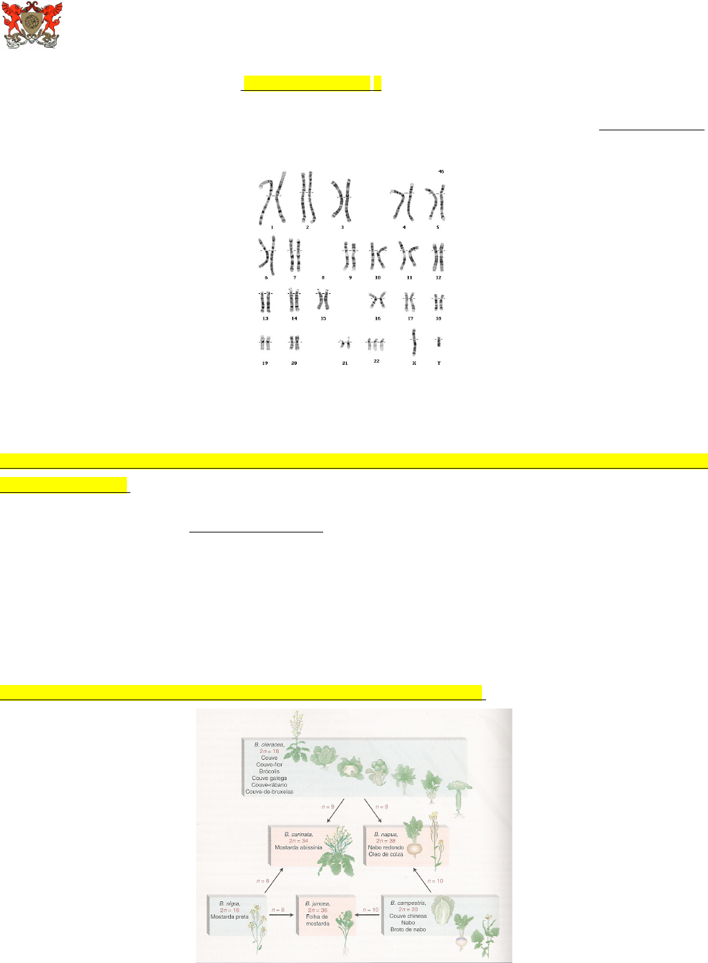 1 MINISTÉRIO DA EDUCAÇÃO, UNIVERSIDADE FEDERAL DE VIÇOSA DEPARTAMENTO DE BIOLOGIA GERAL Campus Universitário – Viçosa, MG – 36570-900 – Telefone: (31) 3612-5028 - E-mail: dbg@ufv.br BIO 240 – Genética, Lista de Exercícios 1, Prof. Wellington Ronildo Clarindo Questão 01 – Observe o cariograma humano abaixo. Com base nas informações acerca de ANEUPLOIDIAS, responda: (a) represente a ploidia do cariograma, mostrando entre parênteses os cromossomos envolvidos nas alterações. (b) quais os tipos de alterações apresentadas nesse cariograma? (c) o indivíduo produz células reprodutivas viáveis? Por quê? Orientação – as respostas têm como base o cariograma humano tipo selvagem – 2n = 2x = 46 cromossomos (XY). Questão 02 – Com base na ORIGEM EUPLOIDE, como podem ser classificadas as espécies B. carinata, B. napus, B. juncea? (a) Essas três espécies podem ser consideradas organismos anfidiploides? Por quê? (b) Descreva o mecanismo que possibilitou a formação dessas três espécies. (c) De acordo com a figura, couve, couve-flor, brócolis, couve galega, couve-rábano e couve-de-bruxelas possuem nome específico de B. oleracea e o mesmo número cromossômico. Sendo assim, quais os possíveis fatores que desencadeiam as diferenças fenotípicas observadas entre elas? Orientação – as respostas têm como base a alopoliploidia e as mutações. 2 Questão 03 – Aponte e conceitue UM FENÔMENO GENÉTICO que resultou na diferenciação dos cromossomos sexuais humanos X/Z e Y/W. Orientação – durante as aulas, nós estamos apontando os fatores genéticos que interferem na diversidade genética e fenotípica. Questão 04 – O exame genético identificou que um indivíduo do sexo feminino possui 45% de células X0 e 55% de células XXX. (a) Com base nos conceitos sobre ANEUPLOIDIA, como essas células podem ser classificadas? (b) Qual fenômeno genético originou as células X0 e as células XXX? (c) A variação genética foi herdada? Por quê? Orientação – as respostas têm como base o cariograma humano tipo selvagem – 2n = 2x = 46 cromossomos (XY). Questão 05 – Bronélia estuda citogeneticamente cinco espécies crípticas de abelhas. A figura abaixo mostra o cariótipo e o arranjo das regiões cromossômicas (as letras indicam as porções cromossômicas idênticas entre todas as cinco espécies) identificadas por meio da técnica de bandeamento G. Descreva a sequência das alterações cromossômicas que possibilitaram a diferenciação de cada espécie. Orientação – todas as mudanças envolveram alterações cromossômicas estruturais. Questão 06 – Suzuki induziu a produção de plantas triploides de mamão e observou que esses organismos produzem apenas 13,78% de células reprodutivas viáveis (n = ?x). Com o auxílio da figura abaixo, responda: por que a produção de células reprodutiva viáveis é baixa em organismos triploides? Orientação – a resposta deve seguir o pareamento de a segregação Mendeliana. 3 Questão 07 Um indivíduo apresenta o seguinte genótipo para três características: Aa para deficiência da ADLH2 (cromossomo 1q24.12), y para disgenesia gonadal (cromossomo Yp1.11), e G para G6PD-favismo (cromossomo Xq28). Considerando a imagem acima, faça um esquema representando os cromossomos com a localização dos genes: (a) de uma célula somática em G2. (b) de um meiócito em metáfase II. (c) de um espermatozoide. Orientação – semelhante ao esquema feito no quadro e à dinâmica realizada no jardim do ECS. Questão 08 – Uma planta de Rumex acetosa apresenta o seguinte genótipo: Ll (cromossomo 1q12.2), Aa (cromossomo 1q24.12), y (cromossomo Yp1.11) e H (cromossomo Xq28). Faça um esquema representando os cromossomos com a localização dos genes: (a) de uma célula somática em G1. (b) de um meiócito em anáfase II. (c) de um núcleo reprodutivo do grão de pólen. (d) de uma célula do endosperma, considerando que a oosfera que originou a planta apresentava o genótipo L a H. Orientação – semelhante ao esquema feito no quadro e à dinâmica realizada no jardim do ECS. Questão 09 – O gene cdt4 relacionado à hipertensão e doença arterial coronariana possui dois enhancers, um na região -100 a -175 e outro na região -400 a -510. Além disso, os dados evidenciaram que o gene possui 7 íntrons e 9 éxons. Faça um esquema, com LEGENDA, mostrando o gene cdt4, os produtos da transcrição e da tradução desse gene. Orientação – semelhante ao esquema feito no quadro no primeiro dia do tema “Do Gene ao Polipeptídeo”. 4 Questão 10 – Com base nas sequências do DNA abaixo e na tabela do código genético, indique a sequência de aminoácidos do peptídeo formado a partir do: (a) alelo selvagem: 5’-TTCACAGATGGCTGAACATCACATTGTTAGATAAGGTAT-3’ (b) alelo mutante: 5’-TTCACAGATGGCTGAACATCCCATTGTTAGATAAGGTAT-3’ Orientação – semelhante aos esquemas feitos no quadro durante o debate do tema “Do Gene ao Polipeptídeo”. Questão 11 – As bibliografias da disciplina BIO 240 reportam informações que nos permitem compreender a estrutura dos cromossomos. Assim, em no máximo 10 linhas, descreva a organização dos cromossomos. Questão 12 – Estruture um esquema, com LEGENDA, mostrando um gene de eucarioto e de um gene de procarioto, os produtos da transcrição e da tradução. Orientação – resposta nos arquivos PDF do tema “Do Gene ao Polipeptídeo”. Questão 13 – A cor da pele em humanos é uma característica física complexa na qual a proteína transportadora associada à membrana (MATP) desempenha um papel importante, pois ela está envolvida no processamento intracelular e no tráfego de proteínas melanossômicas. Mutações no gene matp localizado no cromossomo 5p13.2 causam albinismo oculocutâneo tipo 4, enquanto outros polimorfismos (mutações) são conhecidos por terem um papel na variação normal da pigmentação. Duas mutações para o gene matp foram identifi