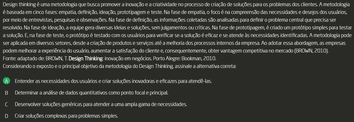 Design thinking é uma metodologia que busca promover a inovação e a criatividade no processo de criação de soluções para os problemas dos clientes. A metodologia é baseada em cinco fases: empatia, definição, ideação, prototipagem e teste. Na fase de empatia, foco é na compreensão das necessidades e desejos dos usuários, por meio de entrevistas, pesquisas e observações. Na fase de definição, as informações coletadas são analisadas para definir problema central que precisa ser resolvido. Na fase de ideação, a equipe gera diversas ideias e soluções, sem julgamentos ou críticas. Na fase de prototipagem, é criado um protótipo simples para testar a solução. E, na fase de teste, protótipo é testado com usuários para verificar se a solução é eficaz e se atende às necessidades identificadas. A metodologia pode ser aplicada em diversos setores, desde a criação de produtos e serviços até a melhoria dos processos internos da empresa. Ao adotar essa abordagem, as empresas podem melhorar a experiência do usuário, aumentar a satisfação do cliente e, consequentemente, obter vantagem competitiva no mercado (BROWN, 2010). Fonte: adaptado de: BROWN, T. Design Thinking: inovação em negócios. Porto Alegre: Bookman, 2010. Considerando exposto e principal objetivo da metodologia do Design Thinking, assinale a alternativa correta: A Entender as necessidades dos usuários e criar soluções inovadoras e eficazes para atendê-las. B Determinar a análise de dados quantitativos como ponto focal e principal. Desenvolver soluções genéricas para atender a uma ampla gama de necessidades. D Criar soluções complexas para problemas simples.
