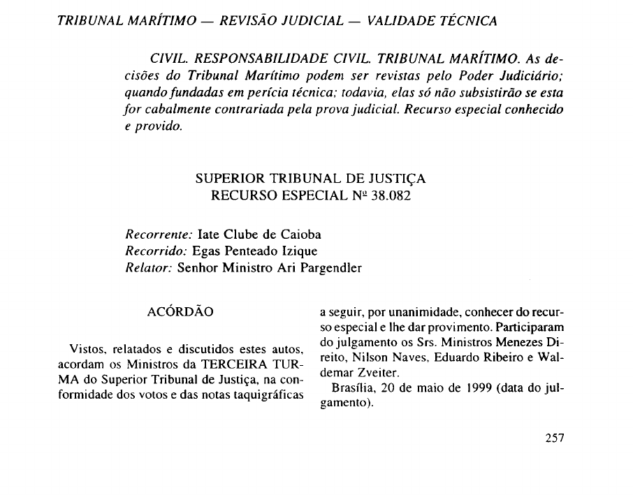 suficientemente examinado por ocaslao do julgamento das ADIMCs. n!!s 1.776, relatada pelo Ministro Sepúlveda Pertence, e 1.777, da relatoria do Ministro Sydney Sanches, ambas julgadas na Sessão de 18.03.98, cujos acórdã os ainda não foram publicados. Registro que a Súmula 339 estabelece que não cabe ao Poder Judiciário, que não tem função legislativa, aumentar vencimentos de servidores públicos, sob fundamento de iso nomia. 6. Ante o exposto, tendo em vista os prece dentes e acolhendo o parecer do Ministério Público Federal, julgo procedente a ação para, confirmando a liminar, declarar a inconstitu cionalidade da Resolução n!! 62, de 29 de maio de 1996, do Tribunal de Contas da União, atribuindo a esta decisão de mérito o efeito ex tunc. EXTRATO DE ATA AÇÃO DIRETA DE INCONSTITUCIO- NALIDADE N!! 1.782-2 Proced.: Distrito Federal Relator: Min. Maurício Corrêa Reqte.: Procurador-Geral da República Reqdo.: Tribunal de Contas da União Decisão: O Tribunal, por unanimidade, jul- gou procedente a ação direta para declarar a inconstitucionalidade da Resolução n!! 62, de 29/5/1996, do Tribunal de Contas da União. Votou o Presidente. Ausentes, justificada mente, o Senhor Ministro Celso de Mello, e, neste julgamento, o Senhor Ministro Carlos Velloso (Presidente). Presidiu o julgamento o Senhor Ministro Marco Aurélio (Vice-Presi dente). Plenário, 09.9.1999. TRIBUNAL MARÍTIMO - REVISÃO JUDICIAL - VALIDADE TÉCNICA CIVIL. RESPONSABILIDADE CIVIL. TRIBUNAL MARÍTIMO. As de cisões do Tribunal Marítimo podem ser revistas pelo Poder Judiciário; quando fundadas em perícia técnica; todavia, elas só não subsistirão se esta for cabalmente contrariada pela prova judicial. Recurso especial conhecido e provido. SUPERIOR TRIBUNAL DE JUSTIÇA RECURSO ESPECIAL N!! 38.082 Recorrente: Iate Clube de Caioba Recorrido: Egas Penteado Izique Relator: Senhor Ministro Ari Pargendler ACÓRDÃO Vistos, relatados e discutidos estes autos, acordam os Ministros da TERCEIRA TUR MA do Superior Tribunal de Justiça, na con formidade dos votos e das notas taquigráficas a seguir, por unanimidade, conhecer do recur so especial e lhe dar provimento. Participaram do julgamento os Srs. Ministros Menezes Di reito, Nilson Naves, Eduardo Ribeiro e Wal demar Zveiter. Brasília, 20 de maio de 1999 (data do jul gamento). 257 MINISTRO Carlos Alberto Menezes Direi to, Presidente MINISTRO Ari Pargendler, Relator RELATÓRIO O Exmo. Sr. Ministro Ari Pargendler Egas Penteado Izique propôs ação ordinária contra o Iate Clube de Caiobá, para vê-lo condenado a indenizar-lhe pela perda do bar co que estava sob a guarda deste (fi. 02/09). Os fatos foram assim relatados no Tribunal a quo: "Noticiam os autos que no dia 12 de feve reiro de 1985, por volta das 16:00 horas, em frente ao late Clube de Caiobá, baía de Gua ratuba Paraná, a lancha "Consull/", de pro priedade de Egas Pellfeado Izique, teve uma explosão seguida de incêndio. O acidente ocorreu logo após o garagista do late Clube, Luiz Vieira de Aguiar, ter colocado a lancha em funcionamento para recolhê-Ia à gara gem. A embarcação teve o seu casco de fibra destruído e terminou por naufragar" (fi. 261). A Egrégia 4â Câmara Cível do Tribunal de Justiça do Estado do Paraná, Relator o emi nente Desembargador José Meger, manteve a sentença de procedência do pedido, em acór dão assim ementado: "Ação ordinária de indenização. Explosão de barco junto ao late Clube de Caiobá. Após o incêndio a embarcação veio a naufragar. Prejuízo total. Despacho saneador. Agravo retido. Perícia e audiência realizadas. Sen tença de procedência do pedido, face a inte gral responsabilidade do Clube pela Indeni zação, com base nos arts. 159 c/c o art. 1.521, 11/, ambos do Código Civil. Apelação. Agravo retido reputado como renunciado nos termos do art. 522, § lI!. do CPC, e man tida a decisão de li!. grau, por maioria de votos. A perícia realizada não conseguiu apurar a causa determinante da explosão do barco. Entretanto, a responsabilidade civil indireta da empresa ou comitellfe pela guarda da em barcação, bem coma por ato de seus empre gados ou prepostos, ficou sobejamente com provada 110 bojo dos autos. O garagista ou 258 manobrista do barco não era habilitado. Núo padece sombra de dúvida que as pessoas que manobram embarcações são responsáveis pe los danos causados a terceiros e pelo Cll/lI primellfo dos dispositivos do Regulamento. No caso, ficou caracterizada a culpa in eli gendo por parte do late Clube de Caiobá e a culpa do preposto do mesmo na modalidade de negligência, imprudência e imperícia. Comprovado está que o late Clube fez má escolha de manobrista imperito para função. Restou, assim, clara a responsabilidade indi reta do réu, por ato de seu empregado. VER BA HONORÁRIA ADVOCATíCIA. No tocan te à verba honorária advocatícia fixada em 20% (vínte por cento) sobre o valor da con denação, não se apresenta exagerada, por isso desmerece alteração a sentença, tam bém, nesta parte. Sentença bem lançada. Agravo retido tido como renunciado. Apela ção, impro~'imento, mas por maioria de vo tos" (fi. 259/260). Ficou vencido o eminente Desembargador Wilson Reback, de cujo voto se transcreve o seguinte tópico: "No que concerne ao Tribunal Marítimo, impossível olvidar os preceitos da Lei ni!. 2.180/59, cujo art. 18 preceitua que suas de cisões referentes aos acidentes e fatos da na vegação 'têm valor probatório e se presumem certas', somente podendo ser desconstituídas por provas em processo judicial, conforme ressalva o mesmo artigo. E, 110 caso, a deci são do Tribunal Marítmo não foi desconsti tuída, fundamentando-se a dOllfa maioria - que muito respeito merece - em presunções e ilações jurídicas impertinentes à espécie. Assim, à falta de prova de culpa do preposto do apelante, e considerando inexistir, na es pécie, responsabilidade objetiva dele, a con clusão mais lógica e