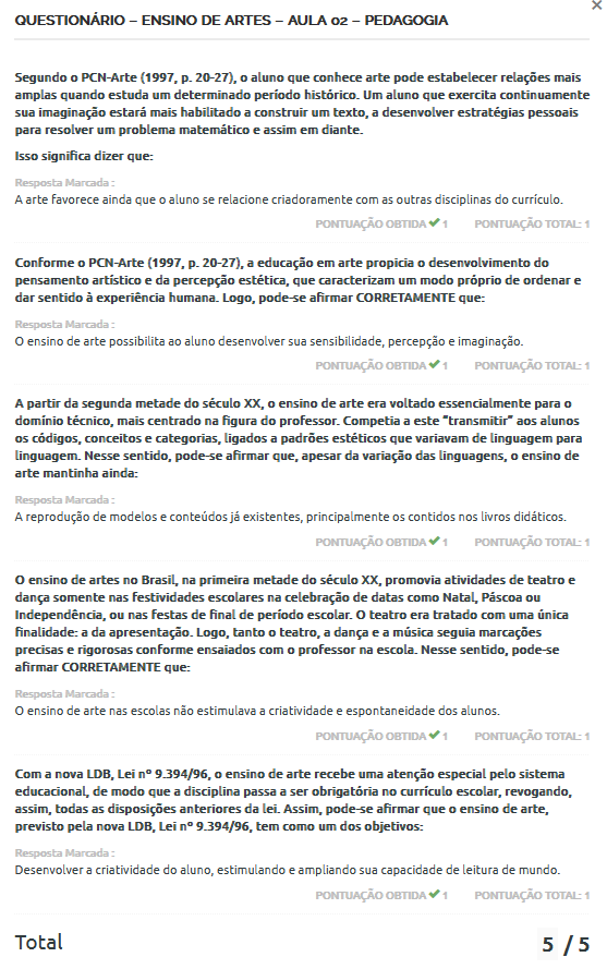 QUESTIONÁRIO - ENSINO DE ARTES - AULA 02 - PEDAGOGIA Segundo PCN-Arte (1997, p. 20-27), o aluno que conhece arte pode estabelecer relações mais amplas quando estuda um determinado histórico. Um aluno que exercita continuamente sua imaginação estará mais habilitado a construir um texto, a desenvolver estratégias pessoais para resolver um problema e assim em diante. Isso significa dizer que: Resposta Marcada : A arte favorece ainda que aluno se relacione criadoramente com as outras disciplinas do PONTUAÇÃO OBTIDA 1 PONTUAÇÃO 1 Conforme PCN-Arte (1997, p. 20-27), a educação em arte propicia o desenvolvimento do pensamento artistico e da percepção estética, que caracterizam um modo próprio de ordenar e dar sentido à experiência humana. Logo, pode-se afirmar CORRETAMENTE que: Resposta Marcada : O ensino de arte possibilita ao aluno desenvolver sua sensibilidade, percepção e imaginação. PONTUAÇÃO OBTIDA 1 PONTUAÇÃO TOTAL A partir da segunda metade do século XX, ensino de arte era voltado essencialmente para domínio técnico, mais centrado na figura do professor. Competia a este "transmitir" aos alunos os códigos, conceitos e categorias, ligados a padrões estéticos que variavam de linguagem para linguagem. Nesse sentido, pode-se afirmar que, apesar da variação das linguagens, ensino de arte mantinha ainda: Resposta Marcada : A reprodução de modelos e já existentes, principalmente os contidos nos livros didáticos. PONTUAÇÃO OBTIDA 1 PONTUAÇÃO TOTAL 1 ensino de artes no Brasil, na primeira metade do século XX, promovia atividades de teatro e dança somente nas festividades escolares na celebração de datas como Natal, Páscoa ou Independência, ou nas festas de final de período O teatro era tratado com uma finalidade: a da apresentação. Logo, tanto teatro, a dança e a musica seguia marcações precisas e rigorosas conforme ensajados com o professor na escola. Nesse sentido, pode-se afirmar CORRETAMENTE que: Resposta Marcada ensino de arte nas escolas não estimulava a criatividade e espontaneidade dos alunos. PONTUAÇÃO OBTIDA PONTUAÇÃO TOTAL 1 Com a nova LDB, Lei n° 9.394/96, ensino de arte recebe uma atenção especial pelo sistema educacional, de modo que a disciplina passa a ser no escolar, revogando, assim, todas as disposições anteriores da Assim, pode-se afirmar que o ensino de arte, previsto pela nova LDB, Lei 9.394/96, tem como um dos objetivos: Resposta Marcada Desenvolver a criatividade do aluno, estimulando e ampliando sua capacidade de leitura de mundo. PONTUAÇÃO OBTIDA PONTUAÇÃO TOTAL 1 Total 5 /5