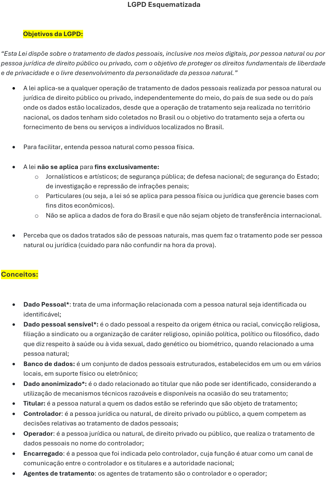 LGPD Esquematizada Objetivos da LGPD: “Esta Lei dispõe sobre o tratamento de dados pessoais, inclusive nos meios digitais, por pessoa natural ou por pessoa jurídica de direito público ou privado, com o objetivo de proteger os direitos fundamentais de liberdade e de privacidade e o livre desenvolvimento da personalidade da pessoa natural.” • A lei aplica-se a qualquer operação de tratamento de dados pessoais realizada por pessoa natural ou jurídica de direito público ou privado, independentemente do meio, do país de sua sede ou do país onde os dados estão localizados, desde que a operação de tratamento seja realizada no território nacional, os dados tenham sido coletados no Brasil ou o objetivo do tratamento seja a oferta ou fornecimento de bens ou serviços a indivíduos localizados no Brasil. • Para facilitar, entenda pessoa natural como pessoa física. • A lei não se aplica para fins exclusivamente: o Jornalísticos e artísticos; de segurança pública; de defesa nacional; de segurança do Estado; de investigação e repressão de infrações penais; o Particulares (ou seja, a lei só se aplica para pessoa física ou jurídica que gerencie bases com fins ditos econômicos). o Não se aplica a dados de fora do Brasil e que não sejam objeto de transferência internacional. • Perceba que os dados tratados são de pessoas naturais, mas quem faz o tratamento pode ser pessoa natural ou jurídica (cuidado para não confundir na hora da prova). Conceitos: • Dado Pessoal*: trata de uma informação relacionada com a pessoa natural seja identificada ou identificável; • Dado pessoal sensível*: é o dado pessoal a respeito da origem étnica ou racial, convicção religiosa, filiação a sindicato ou a organização de caráter religioso, opinião política, político ou filosófico, dado que diz respeito à saúde ou à vida sexual, dado genético ou biométrico, quando relacionado a uma pessoa natural; • Banco de dados: é um conjunto de dados pessoais estruturados, estabelecidos em um ou em vários locais, em suporte físico ou eletrônico; • Dado anonimizado*: é o dado relacionado ao titular que não pode ser identificado, considerando a utilização de mecanismos técnicos razoáveis e disponíveis na ocasião do seu tratamento; • Titular: é a pessoa natural a quem os dados estão se referindo que são objeto de tratamento; • Controlador: é a pessoa jurídica ou natural, de direito privado ou público, a quem competem as decisões relativas ao tratamento de dados pessoais; • Operador: é a pessoa jurídica ou natural, de direito privado ou público, que realiza o tratamento de dados pessoais no nome do controlador; • Encarregado: é a pessoa que foi indicada pelo controlador, cuja função é atuar como um canal de comunicação entre o controlador e os titulares e a autoridade nacional; • Agentes de tratamento: os agentes de tratamento são o controlador e o operador; • Tratamento: é toda operação efetuada com dados pessoais, como as relacionadas a coleta, produção, classificação, recepção, acesso, utilização, transmissão, reprodução, processamento, distribuição, arquivamento, armazenamento, avaliação ou controle de informações, transferência, difusão ou extração. Princípios: • Finalidade: Tratar os dados para propósitos legítimos, específicos, explícitos e informados ao titular; • Adequação: Compatibilidade do tratamento com as finalidades informadas; • Necessidade: Limitação do tratamento ao mínimo necessário para realização de suas finalidades; • Livre acesso: Garantia aos titulares de consulta facilitada e gratuita sobre a forma e duração do tratamento, bem como sobre a integralidade de seus dados pessoais; • Qualidade dos dados: Garantia, aos titulares, de exatidão, clareza, relevância e atualização dos dados, conforme a necessidade e para cumprimento da finalidade de seu tratamento; • Transparência: Informação clara, precisa e acessível sobre a realização do tratamento e os respectivos agentes de tratamento; • Segurança: Utilização de medidas técnicas e administrativas aptas a proteger os dados pessoais de acessos não autorizados e de situações acidentais ou ilícitas; • Prevenção: Adoção de medidas para prevenir a ocorrência de danos em virtude do tratamento de dados pessoais; • Não discriminação: Impossibilidade de realização do tratamento para fins discriminatórios ilícitos ou abusivos; • Responsabilização e prestação de contas: Demonstração, pelo agente, da adoção de medidas eficazes e capazes de comprovar a observância e o cumprimento das normas de proteção de dados pessoais. Fundamentos: Respeito à privacidade. Autodeterminação informativa. Liberdade de expressão, de informação, de comunicação e opinião. Inviolabilidade da intimidade, da honra e da imagem. Desenvolvimento econômico, tecnológico e da inovação. Livre iniciativa, livre concorrência e defesa do consumidor. Direitos humanos, livre desenvolvimento da personalidade, dignidade e exercício da cidadania pelas pessoas naturais. Direitos dos Titulares: Os titulares dos dados possuem uma série de direitos assegurados pela LGPD, tais como: • Confirmação da existência de tratamento de dados; • Acesso aos dados; • Correção de dados incompletos, inexatos ou desatualizados; • Anonimização, bloqueio ou eliminação de dados desnecessários ou tratados em desconformidade; • Portabilidade dos dados a outro fornecedor de serviço ou produto, respeitados os segredos comercial e industrial; • Eliminação dos dados pessoais tratados com o consentimento do titular; • Informação das entidades públicas e privadas com as quais o controlador realizou uso compartilhado de dados; • Informação sobre a possibilidade de não fornecer consentimento e sobre as consequências da negativa. Estrutura de Governança e Fiscalização: Para garantir o cumprimento