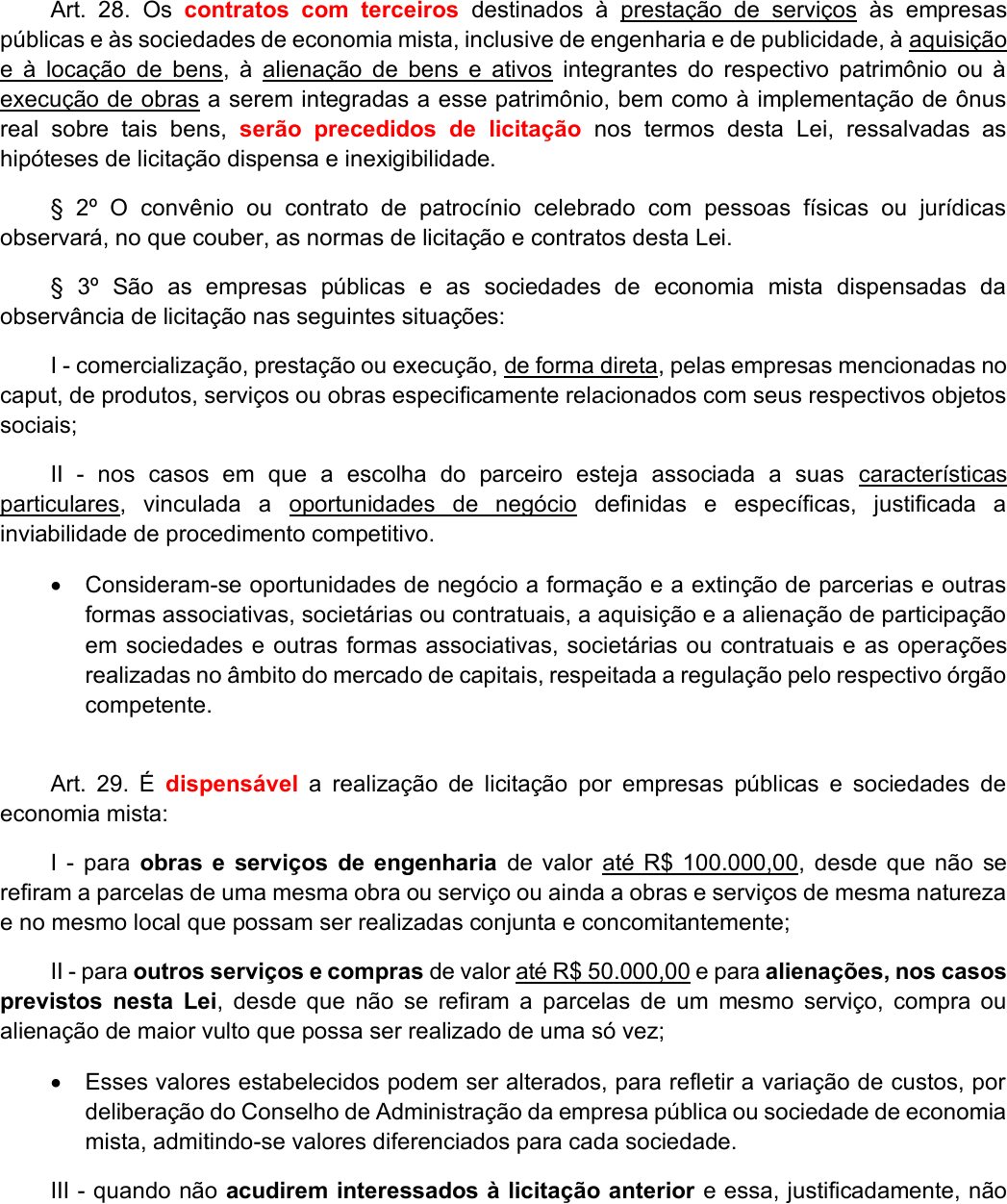 LICITAÇÕES Da Exigência de Licitação e dos Casos de Dispensa e de Inexigibilidade Art. 28. Os contratos com terceiros destinados à prestação de serviços às empresas públicas e às sociedades de economia mista, inclusive de engenharia e de publicidade, à aquisição e à locação de bens, à alienação de bens e ativos integrantes do respectivo patrimônio ou à execução de obras a serem integradas a esse patrimônio, bem como à implementação de ônus real sobre tais bens, serão precedidos de licitação nos termos desta Lei, ressalvadas as hipóteses de licitação dispensa e inexigibilidade. § 2º O convênio ou contrato de patrocínio celebrado com pessoas físicas ou jurídicas observará, no que couber, as normas de licitação e contratos desta Lei. § 3º São as empresas públicas e as sociedades de economia mista dispensadas da observância de licitação nas seguintes situações: I - comercialização, prestação ou execução, de forma direta, pelas empresas mencionadas no caput, de produtos, serviços ou obras especificamente relacionados com seus respectivos objetos sociais; II - nos casos em que a escolha do parceiro esteja associada a suas características particulares, vinculada a oportunidades de negócio definidas e específicas, justificada a inviabilidade de procedimento competitivo. • Consideram-se oportunidades de negócio a formação e a extinção de parcerias e outras formas associativas, societárias ou contratuais, a aquisição e a alienação de participação em sociedades e outras formas associativas, societárias ou contratuais e as operações realizadas no âmbito do mercado de capitais, respeitada a regulação pelo respectivo órgão competente. Art. 29. É dispensável a realização de licitação por empresas públicas e sociedades de economia mista: I - para obras e serviços de engenharia de valor até R$ 100.000,00, desde que não se refiram a parcelas de uma mesma obra ou serviço ou ainda a obras e serviços de mesma natureza e no mesmo local que possam ser realizadas conjunta e concomitantemente; II - para outros serviços e compras de valor até R$ 50.000,00 e para alienações, nos casos previstos nesta Lei, desde que não se refiram a parcelas de um mesmo serviço, compra ou alienação de maior vulto que possa ser realizado de uma só vez; • Esses valores estabelecidos podem ser alterados, para refletir a variação de custos, por deliberação do Conselho de Administração da empresa pública ou sociedade de economia mista, admitindo-se valores diferenciados para cada sociedade. III - quando não acudirem interessados à licitação anterior e essa, justificadamente, não puder ser repetida sem prejuízo para a empresa pública ou a sociedade de economia mista, bem como para suas respectivas subsidiárias, desde que mantidas as condições preestabelecidas; IV - quando as propostas apresentadas consignarem preços manifestamente superiores aos praticados no mercado nacional ou incompatíveis com os fixados pelos órgãos oficiais competentes; V - para a compra ou locação de imóvel destinado ao atendimento de suas finalidades precípuas, quando as necessidades de instalação e localização condicionarem a escolha do imóvel, desde que o preço seja compatível com o valor de mercado, segundo avaliação prévia; VI - na contratação de remanescente de obra, de serviço ou de fornecimento, em consequência de rescisão contratual, desde que atendida a ordem de classificação da licitação anterior e aceitas as mesmas condições do contrato encerrado por rescisão ou distrato, inclusive quanto ao preço, devidamente corrigido; • Na hipótese de nenhum dos licitantes aceitar a contratação nos termos do inciso VI do caput, a empresa pública e a sociedade de economia mista poderão convocar os licitantes remanescentes, na ordem de classificação, para a celebração do contrato nas condições ofertadas por estes, desde que o respectivo valor seja igual ou inferior ao orçamento estimado para a contratação, inclusive quanto aos preços atualizados nos termos do instrumento convocatório. VII - na contratação de instituição brasileira incumbida regimental ou estatutariamente da pesquisa, do ensino ou do desenvolvimento institucional ou de instituição dedicada à recuperação social do preso, desde que a contratada detenha inquestionável reputação ético- profissional e não tenha fins lucrativos; VIII - para a aquisição de componentes ou peças de origem nacional ou estrangeira necessários à manutenção de equipamentos durante o período de garantia técnica, junto ao fornecedor original desses equipamentos, quando tal condição de exclusividade for indispensável para a vigência da garantia; IX - na contratação de associação de pessoas com deficiência física, sem fins lucrativos e de comprovada idoneidade, para a prestação de serviços ou fornecimento de mão de obra, desde que o preço contratado seja compatível com o praticado no mercado; X - na contratação de concessionário, permissionário ou autorizado para fornecimento ou suprimento de energia elétrica ou gás natural e de outras prestadoras de serviço público, segundo as normas da legislação específica, desde que o objeto do contrato tenha pertinência com o serviço público. XI - nas contratações entre empresas públicas ou sociedades de economia mista e suas respectivas subsidiárias, para aquisição ou alienação de bens e prestação ou obtenção de serviços, desde que os preços sejam compatíveis com os praticados no mercado e que o objeto do contrato tenha relação com a atividade da contratada prevista em seu estatuto social; XII - na contratação de coleta, processamento e comercialização de resíduos sólidos urbanos recicláveis ou reutilizáveis, em áreas com sistema de coleta seletiva de lixo, efetuados por associações ou cooperativas formadas exclusivamente por pessoas físicas de 