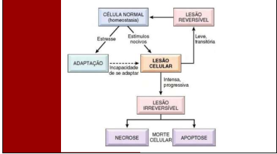NORMAL LESÃO REVERSIVEL Estresse Estimulos nocivos ADAPTAÇÃO LESÃO incapacidade CELULAR de se adaptar progressiva LESÃO MORTE NECROSE CELULAR APOPTOSE