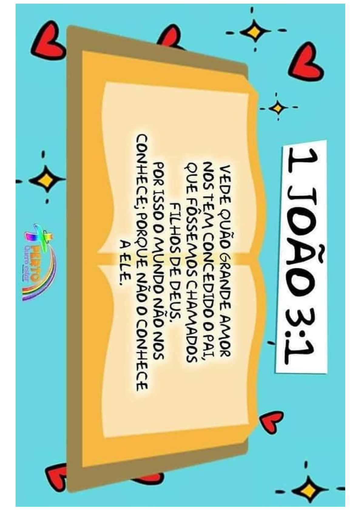 <p>1 JOÃO 3:1 VEDE QUÃO GRANDE AMOR NOS TEM CONCEDIDO PAI, QUE CHAMADOS FILHOS DE DEUS. POR ISSO MUNDO NÃO NOS CONHECE; PORQUE NÃO CONHECE A ELE.</p><p>1 JOÃO 3:1 VEDE QUÃO GRANDE AMOR NOS TEM CONCEDIDO PAI, QUE FÔSSEMOS CHAMADOS BiBlia FILHOSDE DEUS. POR ISSO MUNDO NÃO NOS CONHECE; PORQUE NÃO CONHECE A ELE. Da PERTO BiBlia BiBlia Conhecido como Pai da Era muito trabalhador, fé. Certa vez Deus pediu 0 seu filho Isaque como sacrifício, mas sempre encontrava e obedeceu! um tempo para ficar Mas Deus proveu um cordeiro! com seus filhos! representa os pais que amam os seus filhos, mas amam a Deus acima de TUDO! Da BiBlia BiBlia JO JAIRO Era um homem temente a Deus! Jairo amava a sua filha! Todos os dias orava pelos Certa vez, ela ficou muito doente, seus filhos! e Jairo foi até Jesus para que Ele curasse sua menina. Ele representa os papais que são os verdadeiros Jairo representa pais que fazem lar! de tudo para que seus filhos estejam bem! Da PERTO BiBlia maior Papai ZACARIAS topos é Foi 0 papai de João Batista. Aquele que deveria preparar 0 caminho para Senhor. Com certeza, Zacarias criou 0 seu filho de maneira que ele servisse a Deus de todo coração!</p>
