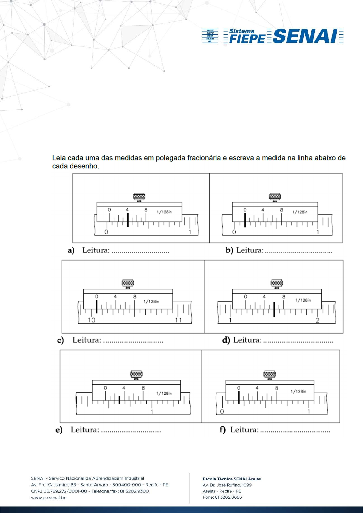 <p>Unidade Curricular: Fundamentos da Instrumentação</p><p>Docente: Bruno Farias</p><p>Aluno: __________________________________________</p><p>Turma: __________________________________________</p><p>Lista de Exercício – Paquímetro em polegada fracionária</p>