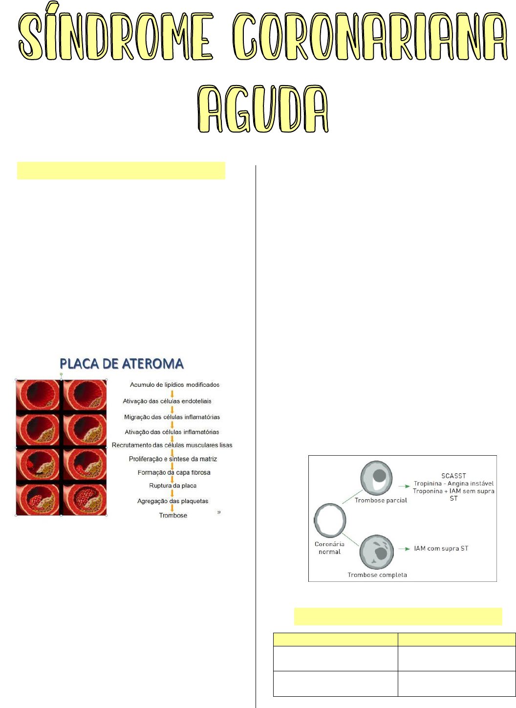 <p>Alanne Paula I 7E</p><p>DEFINIÇÃO</p><p>➞ Tipo de doença cardiovascular mais</p><p>prevalente em adultos – causada principalmente</p><p>pelo acúmulo de placas de gordura na túnica</p><p>íntima do vaso;</p><p>➞ A aterosclerose é caracterizada pelo acúmulo</p><p>de lipídeos, elementos fibrosos e inflamatórios,</p><p>especialmente de resposta à injúria endotelial</p><p>vascular, podendo resultar da interação de várias</p><p>forças, incluindo anormalidades metabólicas e</p><p>nutricionais:</p><p>➞ A Síndrome Coronariana aguda (SCA) é o</p><p>processo que ocorre devido à desproporção</p><p>entre oferta e demanda de oxigênio ao miocárdio,</p><p>gerando um cenário propício para a isquemia,</p><p>geralmente em consequência de ruptura de uma</p><p>placa de ateroma presente nas artérias coronárias</p><p>e trombose secundária;</p><p>➞ Diante disso, o sintoma preponderante desse</p><p>quadro consiste na dor precordial, também</p><p>chamada de angina, geralmente descrita como</p><p>sensação em aperto no tórax, retroesternal, de início</p><p>súbito, aos mínimos esforços ou em repouso;</p><p>➞ O processo de ruptura da placa</p><p>aterosclerótica pode resultar na:</p><p> SCACSST:</p><p>o Formação de um trombo oclusivo</p><p>da luz do vaso, tipicamente</p><p>produzindo supradesnivelamento</p><p>de ST no eletrocardiograma;</p><p>o Infarto agudo do miocárdio CSST.</p><p> SCASSST:</p><p>o Formação de um trombo não</p><p>oclusivo, mas que obstrui a luz do</p><p>vaso, reproduzindo (ou não)</p><p>infradesnivelamento de ST no</p><p>eletrocardiograma;</p><p>o Angina instável ou infarto agudo do</p><p>miocárdio SSST.</p><p>FATORES DE RISCO:</p><p>MODIFICÁVEIS NÃO-MODIFICÁVEIS</p><p>Dislipidemia;</p><p>Idade;</p><p>Hipertensão arterial;</p><p>Sexo;</p><p>Alanne Paula I 7E</p><p>Diabetes Mellitus;</p><p>História familiar de</p><p>DAC;</p><p>Síndrome metabólica;</p><p>História familiar de</p><p>Doença</p><p>Aterosclerótica.</p><p>Obesidade;</p><p>Tabagismo e etilismo;</p><p>Sedentarismo.</p><p>ANGINA ESTÁVEL X INSTÁVEL:</p><p>➞ ESTÁVEL:</p><p> Síndrome cardíaca caracterizada por dor ou</p><p>desconforto em qualquer região do tórax,</p><p>epigástrio, mandíbula, ombro, dorso ou</p><p>MMSS;</p><p> Tipicamente desencadeada ou agravada</p><p>com atividade física ou estresse emocional</p><p>– normalmente curta e alivia com repouso;</p><p> Acomete portadores de DAC com</p><p>comprometimento de pelo menos uma nas</p><p>artérias coronárias;</p><p>➞ INSTÁVEL:</p><p> Denominada de “angina pré-infarto”;</p><p> Interrupção parcial do fluxo sanguíneo</p><p>(isquemia) - surge repentinamente;</p><p> Os sintomas aumentam de frequência e</p><p>gravidade, podem não ser aliviados com</p><p>repouso nem com uso de nitratos.</p><p>INFARTO AGUDO DO MIOCÁRDIO (IAM):</p><p>➞ Causado por oclusão TOTAL da artéria</p><p>coronária;</p><p>➞ Os mecanismos envolvidos incluem a rotura da</p><p>placa aterosclerótica com formação de trombo</p><p>oclusivo no local;</p><p>➞ Ocorre destruição permanente de uma área</p><p>miocárdica;</p><p>➞ Dor torácica >20min;</p><p>➞ Níveis séricos de troponina acima do percentil</p><p>99.</p><p>Derivação ➞ Parede ➞ Artéria</p><p>QUADRO CLÍNICO SCA:</p><p>➞ Angina> com sensação de aperto na região do</p><p>tórax, podendo irradiar para o epigástrio,</p><p>mandíbula, ombro, dorso ou MMSS;</p><p>➞ Pode haver sensação de parestesia no membro</p><p>superior esquerdo;</p><p>➞ O paciente geralmente não associará a dor aos</p><p>movimentos respiratórios e não indicará um ponto</p><p>específico doloroso, porque a dor isquêmica</p><p>consiste em uma dor visceral, a qual não envia</p><p>sinais neurológicos de dor localizada, mas sim de</p><p>dor difusa;</p><p>➞ Pode acontecer taquipneia, náuseas, vômitos, bem</p><p>como elevação da PA;</p><p>➞ Pacientes diabéticos podem ter manifestações</p><p>atípicas, sem presença de dor torácica;</p><p>➞ Sinal de Levine:</p><p> Paciente levemente curvado devido à</p><p>dor anginosa e com o punho na região</p><p>do coração.</p><p>EXAMES DIAGNÓSTICOS:</p><p>➞ ELETROCARDIOGRAMA DE 12 DERIVAÇÕES:</p><p>Alanne Paula I 7E</p><p> Deve ser realizado em até 10min, para auxiliar</p><p>de forma precisa na classificação;</p><p> Se houver disponibilidade, o ECG deve ser</p><p>realizado antes da chegada ao serviço</p><p>de emergência, uma vez que o supra de ST</p><p>pode leva-lo ao atendimento prioritário.</p><p> Avaliar se há a presença de supra ou</p><p>infra de ST;</p><p> IAMCSST:</p><p>O supra de ST é tão grave porque consiste no</p><p>sinal elétrico de um coração cujo ramo coronário</p><p>está obstruído por completo (geralmente),</p><p>configurando o IAMCSST!</p><p> A ausência de supra de ST, e presença de</p><p>infra, quando compatível com SCA,</p><p>configura 2 possíveis quadros: infarto sem</p><p>supra de ST ou angina instável;</p><p> IAMSST:</p><p>No IAMSST, o eletro pode apresentar uma onda</p><p>T apiculada, em segundos ou minutos após o</p><p>início do quadro.</p><p>➞ MARCADORES BIOLÓGICOS:</p><p> No momento da chegada, devem ser</p><p>dosados os níveis séricos dos marcadores</p><p>de necrose do miocárdio;</p><p>ENZIMAS INÍCIO DE</p><p>ELEVAÇÃO</p><p>NORMALIZAÇÃO</p><p>CK- MB</p><p>3-6h</p><p>3 a 4 dias</p><p>MIOGLOBINA</p><p>1-3h</p><p><24h</p><p>TROPONINA</p><p>3-6h</p><p>3 semanas</p><p> Nos casos de angina instável – marcador</p><p>negativo.</p><p>➞ ECOCARDIOGRAFIA TRANSESOFÁGICA:</p><p> Para avaliar a função ventricular, detectar</p><p>a presença de movimento hipocinético e</p><p>acinético da parede, para determinar a</p><p>frequência de ejeção da (FE)</p><p>Alanne Paula I 7E</p><p>TRATAMENTO:</p><p>➞ O tratamento inicial inclui repouso e</p><p>monitoramento via ECG;</p><p>➞ TROMBOLÍTICOS – fibrinólise;</p><p>➞ A dor anginosa deve ser tratada com morfina,