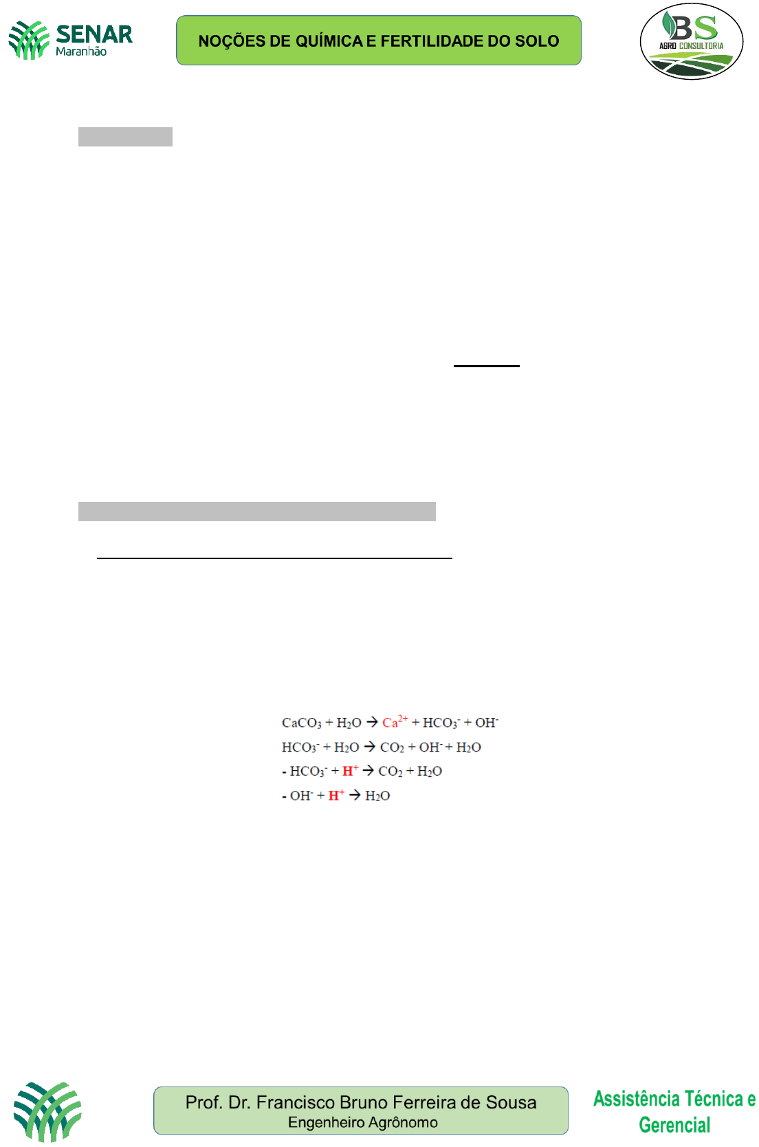 CORREÇÃO DA ACIDEZ DO SOLO 1. Calagem A acidez é a primeira característica do solo que deve ser levada em consideração em uma área a ser cultivada. Os solos brasileiros apresentam na sua grande maioria, valores de pH inferiores a 5,5, gerando condições inadequadas ao desenvolvimento de plantas. Além da ocorrência natural da acidez do solo, o próprio cultivo tende a acentuar o problema devido a absorção de cátions pelas raízes das plantas, como também, pela aplicação ao solo de fertilizantes acidificantes. A correção da acidez do solo, também denominada calagem, tem por finalidade corrigir a acidez proveniente do H+, precipitar Al+++ e fornecer Ca++ e Mg++ para as plantas, agindo assim como corretivo de condições adversas do solo e também como fertilizante. A calagem proporciona um maior crescimento do sistema radicular, uma maior absorção de água e nutrientes, e por conseguinte, um aumento na produtividade. 2. Compreendendo as finalidades da calagem 1) Corrigir a acidez do solo, pela neutralização do H+ Mecanismos de neutralização da acidez pelo calcário (Vitti, Domeniconi, 2010): A pequena dissolução dos carbonatos (CaCO3 e MgCO3), que ocorre em presença de água (H2O) e gás carbônico (CO2), é suficiente para desencadear uma série de reações, representadas a seguir, que resultam na neutralização da acidez do solo: A hidroxila (OH-) reage com o íon H+ da solução do solo, formando água (H2O). O bicarbonato (HCO3 -) reage também com o H+, originando CO2 e H2O. É importante destacar que a neutralização da acidez ocorre por meio dos ânions (OH- e HCO3 -), que são os receptores de prótons (H+), sem os quais a eliminação da acidez não seria possível. À medida que as reações se processam, o Ca e Mg do corretivo vão ocupando os pontos de troca onde estavam o alumínio e o hidrogênio. 2) Corrigir a toxidez do Al e de Mn por reações de precipitação desses elementos. 3) Adicionar Ca e Mg ao solo, e todos os reflexos do aumento da disponibilidade desses nutrientes; 4) Diminuir a lixiviação de Ca, Mg e K 5) Diminuir a fixação do fósforo; 6) Diminuir a toxidez do alumínio, manganês e eventualmente o ferro; 7) Propiciar condições para melhor crescimento do sistema radicular aumentando absorção de água e nutrientes para as plantas. Para que o calcário produza os efeitos desejáveis, é necessário haver umidade suficiente no solo para sua reação. A velocidade de reação do calcário depende do grau de acidez do solo, da granulometria do corretivo e do grau de intimidade da mistura do calcário com o solo (Raij, 2011). 3. Classificação dos corretivos de acidez Há uma série de materiais que podem ser utilizados como corretivos, entretanto os principais são: óxidos, hidróxidos, silicatos e CARBONATOS. O carbonatos são os mais utilizados pois são encontrados em maiores quantidades e por isso são mais baratos. Os corretivos de acidez são classificados como: a) Calcário: pode ser tradicional, filler ou calcinado. Calcário tradicional é o produto obtido pela moagem da rocha calcária. Seus constituintes são carbonato de cálcio (CaCO3) e carbonato de magnésio (MgCO3). Calcário Filler é a matéria-prima obtida através da moagem fina de calcário, basalto, materiais carbonáticos, etc. O calcário libera Ca2+, Mg2+ e CO3 2-; a base química, isto é, o componente que proporciona a formação de OH- é o CO3 2- (e posteriormente o HCO3 -); o CO3 2- é uma base fraca, isto é, a reação de formação de OH- é relativamente lenta e parcial; e o OH- produzido neutralizará o H+ da solução, responsável pela sua acidez. Calcário calcinado é produto obtido industrialmente pela calcinação parcial do calcário. Apresenta-se na forma de pó fino. Sua ação neutralizante é devida à base forte OH- e a base fraca CO3 2-. b) Cal virgem agrícola: produto obtido industrialmente pela calcinação ou queima completa do calcário. Seus constituintes são o óxido de cálcio (CaO) e o óxido de magnésio (MgO) e se apresenta como pó fino. A cal virgem libera Ca2+, Mg2+, OH- e calor; a liberação de OH- é imediata e total, o que confere à cal virgem o caráter de base forte; e o OH- produzido neutralizará o H+ da solução do solo, responsável pela sua acidez. c) Cal hidratada agrícola ou cal extinta: produto obtido industrialmente pela hidratação da cal virgem. Seus constituintes são o hidróxido de cálcio - Ca(OH)2 - e o hidróxido de magnésio - Mg(OH)2 - e também se apresenta na forma de pó fino. A ação neutralizante da cal hidratada é muito semelhante à da cal virgem: a cal virgem “se hidrata” no solo utilizando água nele contida, enquanto a cal hidratada é hidratada industrialmente. d) Escória básica de siderurgia (Wutke & Gargantini, 1962): subproduto da indústria do ferro, do aço e papel. Seus constituintes são o silicato de cálcio (CaSiO3) e o silicato de magnésio (MgSiO3) ação neutralizante da escória é muito semelhante à do calcário: neste caso, a base química é o SiO3 2- que também é fraca, mas é mais forte que a base CO3 2-. e) Carbonato de cálcio: produto obtido pela moagem de margas (depósitos terrestres de carbonato de cálcio), corais e sambaquis (depósitos marinhos de carbonato de cálcio, também denominados de calcários marinhos). Sua ação neutralizante é semelhante à do carbonato de cálcio dos calcários. 4. Características de um calcário que definem sua qualidade Quatro são as características que têm sido utilizadas para avaliar a qualidade de um calcário: O poder neutralizante, a reatividade, o poder relativo de neutralização total e o teor de nutrientes, especialmente, os de cálcio e magnésio. Poder Neutralizante – PN O poder de neutralização de um corretivo é dado pela quantidade de ácido que o mesmo é capaz de neutralizar, o que depende de sua natureza química e do grau de pureza. Os diferentes constituintes do calcário têm 