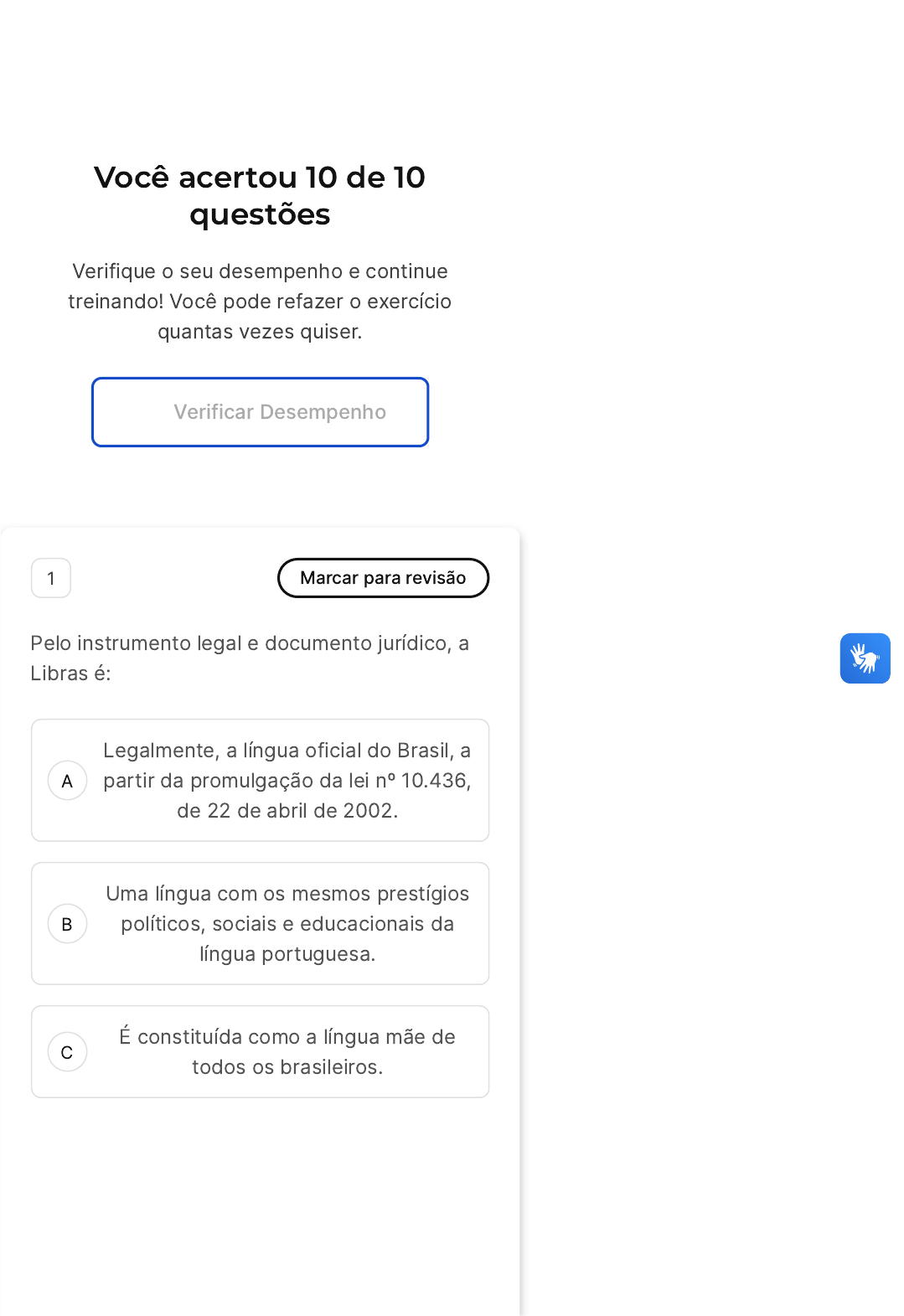 Você acertou 10 de 10 questões Verifique o seu desempenho e continue treinando! Você pode refazer o exercício quantas vezes quiser. Verificar Desempenho A B C 1 Marcar para revisão Pelo instrumento legal e documento jurídico, a Libras é: Legalmente, a língua oficial do Brasil, a partir da promulgação da lei nº 10.436, de 22 de abril de 2002. Uma língua com os mesmos prestígios políticos, sociais e educacionais da língua portuguesa. É constituída como a língua mãe de todos os brasileiros. D E A B Uma língua reconhecida legalmente, a partir da promulgação da lei nº 10.436, de 24 de abril de 2002. Poderá substituir a língua portuguesa na modalidade escrita. Resposta correta Parabéns, você selecionou a alternativa correta. Confira o gabarito comentado! Gabarito Comentado A resposta correta é: Uma língua reconhecida legalmente, a partir da promulgação da lei nº 10.436, de 24 de abril de 2002. 2 Marcar para revisão O Segundo Congresso Internacional de Educação dos Surdos (ou Congresso de Milão) teve lugar em Milão, na Itália, em setembro de 1880. As decisões tomadas após o congresso foram determinantes para o futuro da educação surda, sento implantada predominantemente a educação: Oralista. Oralidade. Questão 3 de 10 Corretas �10� 1 2 3 4 5 6 7 8 9 10 Exercicio Políticas De Inclusão Do Surdo Sair C D E Oral. Verbalista. Auralista. Resposta correta Parabéns, você selecionou a alternativa correta. Confira o gabarito comentado! Gabarito Comentado Após as decisões do Congresso de Milão, implantou-se, uma filosofia educacional denominada oralismo. A educação oralista passou a seguir as 8 (oito) Resoluções aprovadas nessa conferência, funcionando como uma espécie de "declaração", "orientação" que os governos e seus programas educacionais assumiram, começando a preferir a oralização à língua de sinais de seu país. Os efeitos negativos disso reverberam na história da educação de surdos e seus efeitos resultam no distanciamento social entre surdos e ouvintes. 3 Marcar para revisão Quando debatemos sobre a inclusão social estamos debatendo sobre a inclusão da pessoa surda, neste caso, dentro da educação também. Considerando a crença da inclusão Em branco �0� A B C D E (para todos, com todos e por todos) devemos abraçar a pluralidade humana e compreender: A diversidade linguística. A diversidade social. O valor humano. As condições sociológicas. O preconceito. Resposta correta Parabéns, você selecionou a alternativa correta. Confira o gabarito comentado! Gabarito Comentado A inclusão é para todos, com todos e por todos. Para isso devemos entender que a concepção de diversidade humana é relevante, e nos ajuda a compreender o valor humano, (singular, individual, coletivo, grupal e identitário) para assim combater o preconceito, que é fruto de comportamentos preestabelecidos ante o Outro. 4 Marcar para revisão A B C D E Libras é a sigla da Língua Brasileira de Sinais, uma língua de modalidade gestual-visual onde é possível se comunicar por meio de gestos, expressões faciais e corporais. Sobre a Libras é possível afirmar: Libras é a língua oficial do país, reconhecida legalmente, por meio da Lei nº 10.436, de 24 de abril de 2002. Libras é uma língua universal para todas as pessoas surdas. Libras é uma forma simplificada de comunicação gestual. Libras ainda não é a língua oficial do país, mas sim uma língua com o estatuto reconhecido legalmente, por meio da Lei nº 10.436, de 24 de abril de 2002. Libras é apenas uma forma de comunicação gestual sem gramática ou estrutura definidas. Resposta correta Parabéns, você selecionou a alternativa correta. Confira o gabarito comentado! Gabarito Comentado A Libras não é a língua oficial do país, mas sim uma língua com o estatuto de língua reconhecida legalmente, por meio da Lei nº 10.436, de 24 de abril de 2002. A ausência de descrição da Libras na qualidade de A B C língua oficial de instrução afeta diretamente toda a política linguística educacional e, inclusive, impacta o planejamento linguístico na educação de surdos. Assim, eles ainda permanecem educados na língua de prestígio social e de privilégios jurídicos. 5 Marcar para revisão As políticas inclusivas estão estabelecidas em pilares, atualmente onze pilares, com a finalidade de alcançar a inclusão total. São exemplos destes pilares o conceito de que é inclusivo deve ser para todos, com todos e para todos; o valor humano é o maior objetivo a ser alçando; e o enfrentamento ao preconceito. Está correto afirmar que: São agentes de inclusão e de exclusão apenas educadores e trabalhadores governamentais. A acessibilidade inclusiva é imprescindível para garantir condições plenas de participação na sociedade. O preconceito deve ser relativizado, considerando onde, quando e por quem foi realizado. D E Políticas inclusivas devem favorecer pessoas sem necessidades especiais, pois estas são a maioria da sociedade. A comunidade surda já está estabelecida e, portanto, não há preconceitos a serem enfrentados. Resposta correta Parabéns, você selecionou a alternativa correta. Confira o gabarito comentado! Gabarito Comentado Todas as pessoas, sem exceção, são agentes da inclusão e da exclusão, o preconceito a comunidade surda ainda existe e não deve ser relativizado e as políticas inclusivas estabelecem a equiparação de direitos e de oportunidades, não devendo favorecer a nenhum grupo. 6 Marcar para revisão Dentro das definições de cidadão encontramos o direito à vida, à liberdade, à propriedade, à igualdade perante a lei e o direito de participar no destino da sociedade, votar, ser votado, ter direitos políticos. Pensando sobre os direitos das pessoas surdas, a Lei Brasileira de Inclusão �LBI�, analise as afirmativas abaixo: I. Políticas inclusivas estão em acordo com as políticas linguísticas como mecanismos de garantia dos