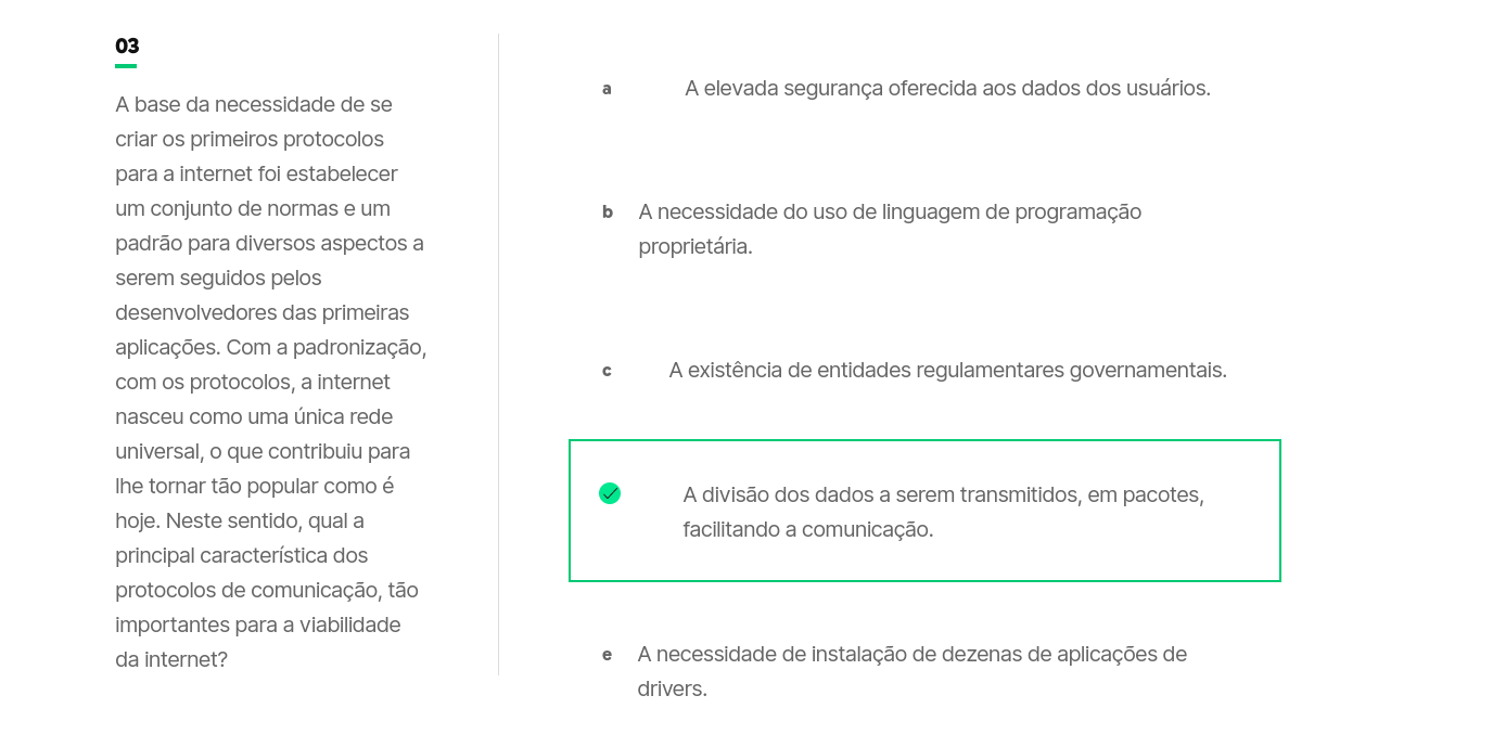 <p>03 a A elevada segurança oferecida aos dados dos usuários. A base da necessidade de se os primeiros protocolos para a internet foi estabelecer um conjunto de normas e um b A necessidade do uso de linguagem de programação padrão para diversos aspectos a proprietária. serem seguidos pelos desenvolvedores das primeiras aplicações. Com a padronização, c A existência de entidades regulamentares governamentais. com os protocolos, a internet nasceu como uma única rede universal, que contribuiu para lhe tornar tão popular como é A divisão dos dados a serem transmitidos, em pacotes, hoje. Neste sentido, qual a facilitando a comunicação. principal característica dos protocolos de comunicação, tão importantes para a viabilidade da internet? e A necessidade de instalação de dezenas de aplicações de drivers.</p>