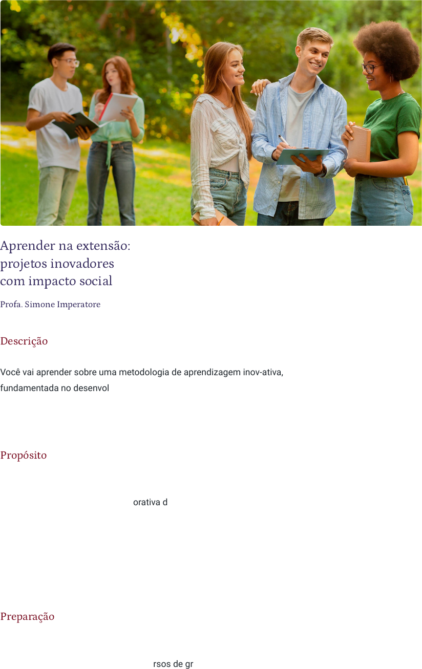 12/03/24, 20:55 Aprender na extensão: projetos inovadores com impacto social https://stecine.azureedge.net/repositorio/00212ge/45853/index.html# 1/42 Aprender na extensão: projetos inovadores com impacto social Profa. Simone Imperatore Descrição Você vai aprender sobre uma metodologia de aprendizagem inov-ativa, fundamentada no desenvolvimento de projetos. Uma nova e desafiante lógica de “aprender-fazendo” em times de trabalho centrados no percurso extensionista. Propósito A aprendizagem em projetos é uma estratégia de trabalho que possibilita uma construção colaborativa de conhecimentos em conexão com o mercado de trabalho e a sociedade e parte da jornada do percurso extensionista. Por meio dela, você desenvolverá competências fundamentais para os profissionais do século XXI, como criatividade, trabalho em equipe, comunicação efetiva, pensamento crítico-reflexivo, consciência social e tomada de decisão responsável. Preparação As instituições de ensino superior foram desafiadas a repensar sua proposta de formação em todos os cursos de graduação a partir do Plano Nacional de Educação vigente (BRASIL, Lei nº 13.005, de 25 de junho de 2014), de forma que, no mínimo, 10% da carga horária de seus currículos seja integralizada por meio de projetos. Mais do que o cumprimento legal, a Yduqs investiu na remodelagem metodológica de seus cursos, potencializando percursos socioformativos (aprender na e com a sociedade). Para orientar esse processo, a instituição segue as diretrizes nacionais da extensão universitária, estabelecidas na 12/03/24, 20:55 Aprender na extensão: projetos inovadores com impacto social https://stecine.azureedge.net/repositorio/00212ge/45853/index.html# 2/42 Resolução do Conselho Nacional de Educação nº 7, de 18 de dezembro de 2018. Objetivos Módulo 1 O desa�o da aprendizagem baseada em projetos Identificar a metodologia de projetos como potencializadora de experiências de aprendizagem colaborativas e aplicadas no percurso extensionista. Módulo 2 O aluno como protagonista do percurso formativo Reconhecer a importância de criar soluções para desafios reais, participar ativamente de discussões em grupo e realizar tarefas que estimulem o pensamento crítico-reflexivo. Introdução A aprendizagem baseada em projetos tem se destacado como uma abordagem inovadora e eficaz no ensino superior, especialmente ao criar experiências de aprendizagem conectadas com o mundo do trabalho e enfrentar os desafios da sociedade contemporânea. Ao combinar teoria e prática de forma integrada, essa metodologia proporciona a oportunidade de construir conhecimentos e habilidades aplicáveis ao contexto profissional, ao mesmo tempo em que aborda questões relevantes e complexas que permeiam a sociedade. 12/03/24, 20:55 Aprender na extensão: projetos inovadores com impacto social https://stecine.azureedge.net/repositorio/00212ge/45853/index.html# 3/42 Nesse sentido, a aprendizagem baseada em projetos busca promover uma formação acadêmica mais contextualizada e aplicada, desafiando os estudantes a trabalharem em projetos que exigem pesquisa, resolução de problemas e tomada de decisões, imergindo em situações reais. Essas experiências não apenas aprimoram o domínio de conhecimentos específicos, mas também desenvolvem habilidades essenciais aos desafios profissionais do século XXI. Além disso, possibilitam que os estudantes, em sua jornada de formação no ensino superior, especialmente vivenciada nos componentes curriculares do percurso extensionista, enfrentem os desafios da sociedade contemporânea, sendo expostos a problemas complexos e multidisciplinares, incentivados a considerar diferentes perspectivas, a refletir sobre questões éticas e a colaborar na busca por soluções sustentáveis. A implementação da aprendizagem baseada em projetos exige que os estudantes assumam uma postura ativa na busca por conhecimento, identificando situações-problema, propondo soluções, planejando e desenvolvendo ações, e avaliando aprendizados e resultados. Este conteúdo explora os desafios dessa abordagem pedagógica, oferecendo insights para um novo percurso de formação que transcende as fronteiras da sala de aula tradicional. Vamos iniciar nossa jornada! Material para download Clique no botão abaixo para fazer o download do conteúdo completo em formato PDF. Download material javascript:CriaPDF() 12/03/24, 20:55 Aprender na extensão: projetos inovadores com impacto social https://stecine.azureedge.net/repositorio/00212ge/45853/index.html# 4/42 1 - O desa�o da aprendizagem baseada em projetos Ao �nal deste módulo, você será capaz de identi�car a metodologia de projetos como potencializadora de experiências de aprendizagem colaborativas e aplicadas no percurso extensionista. Competências pro�ssionais do século XXI A emergência de novas modelagens de aprendizagem Vivemos em uma era de rápidas mudanças e, por isso, é essencial que você esteja preparado para se destacar em um ambiente profissional cada vez mais dinâmico e globalizado. Nesse cenário, muito se tem falado em desenvolvimento de competências, mas você conhece o seu significado? O que são “competências”? Resposta 12/03/24, 20:55 Aprender na extensão: projetos inovadores com impacto social https://stecine.azureedge.net/repositorio/00212ge/45853/index.html# 5/42 O conceito foi proposto por Scott B. Parry (1996), em seu artigo The quest for competencies e, desde então, é utilizado no contexto profissional para descrever as capacidades e qualificações que um indivíduo precisa ter para desempenhar um determinado cargo ou ocupação. Existem dois tipos principais de competências, entenda! São habilidades específicas relacionadas a conhecimentos técnicos, ferramentas, métodos e técnicas necessários para realizar uma tarefa ou função, como: o domínio de um idioma; a habilidade de escrita; o conhecimento de softwares, métodos e/ou 