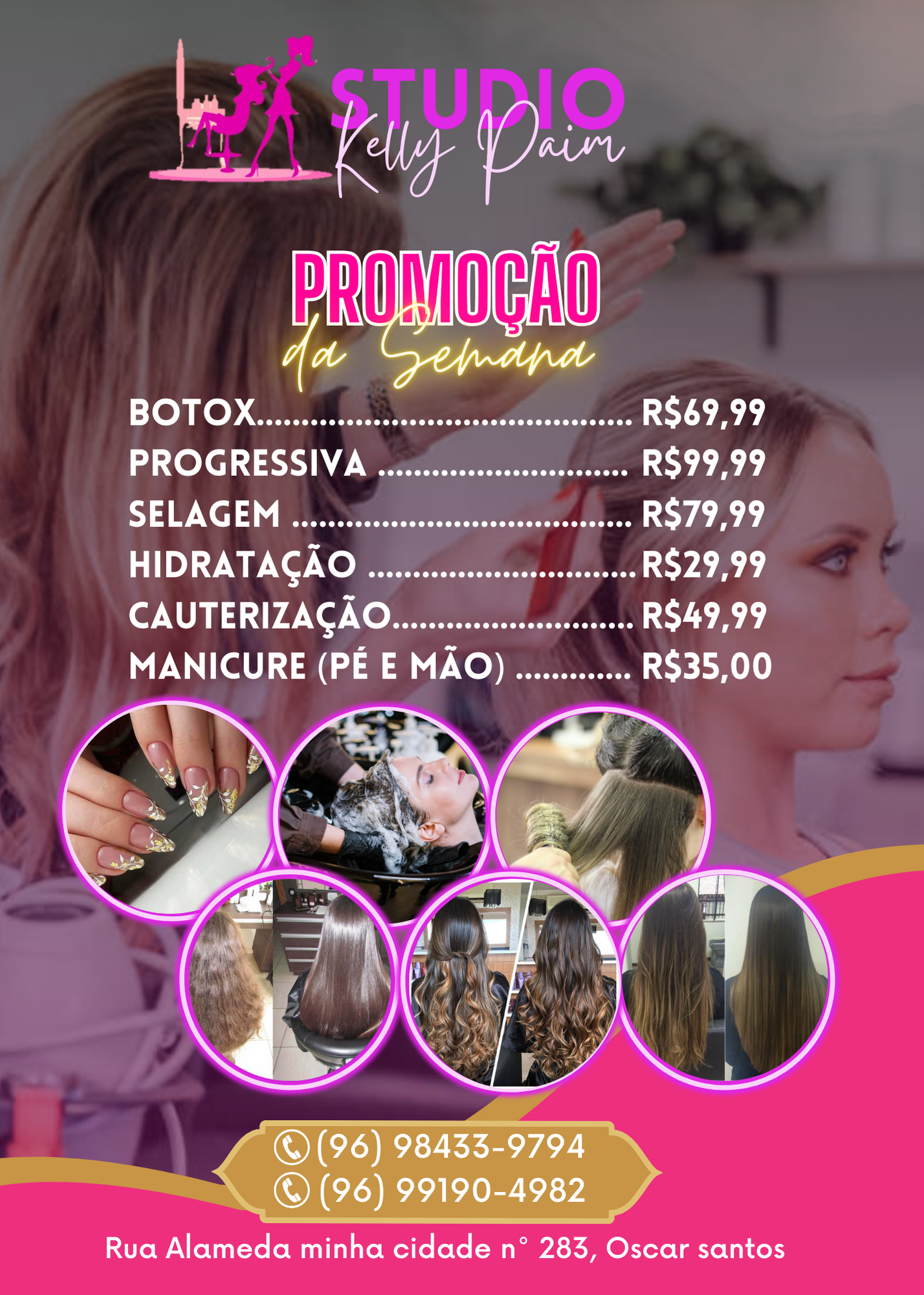 <p>da Semana BOTOX R$69,99 PROGRESSIVA R$99,99 SELAGEM R$79,99 HIDRATAÇÃO R$29,99 CAUTERIZAÇÃO R$49,99 MANICURE (PÉ E MÃO) R$35,00 C (96) 98433-9794 (96) 99190-4982 Rua Alameda minha cidade n° 283, Oscar santos</p>