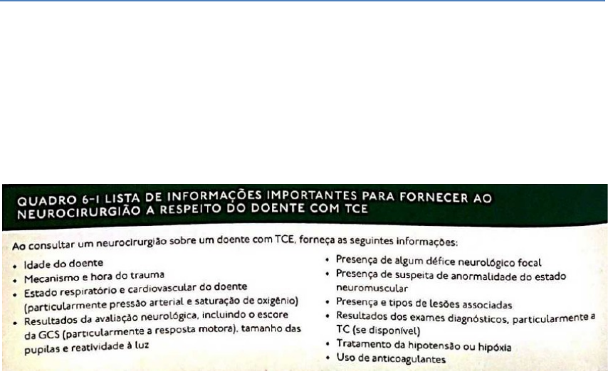 TRAUMA CRANIENCEFÁLICO EPIDEMIOLOGIA · 90% das mortes pré-hospitalares no trauma envolvem lesões cerebrais · 75% dos doentes com lesões cerebrais que recebem cuidados médicos são de traumas leves, 15% moderados e 10% graves -O objetivo principal do tratamento do doente com suspeita de TCE grave é prevenir lesão cerebral secundária ANATOMIA COURO CABELUDO · Devido a sua irrigação abundante, a laceração do couro cabeludo pode levar a choque hemorrágico CRÂNIO · Como sua base é irregular, quando o cérebro se desloca em seu interior(aceleração e desaceleração) ocorre lesões cerebrais · Fossa anterior do crânio aloja os lobos frontais, fossa média os lobos temporais e fossa posterior a porção inferior do tronco cerebral e o cerebelo MENINGES · As meninges revestem o cérebro sendo formadas por 3 camadas: dura-máter, aracnóide e pia-máter · Dura-máter é uma membrana resistente e fibrosa que adere firmemente a superfície interna do crânio. Em locais específicos a dura-máter se divide em 2 superfícies que envolvem grandes seios venosos que permitem a maior parte da drenagem venosa cerebral. Os seios bilaterais transversos e o sigmóide são maiores do lado direito, a laceração desses seios pode gerar hemorragia maciça. Já as artérias meningeas correm no espaço epidural(entre parte interna do crânio e a dura-máter), logo fraturas cranianas acima dessas artérias podem lacerá-las e resultar em hematoma epidural. A artéria meningea media que fica na fossa temporal é a mais lesada e seu hematoma em expansão provocado pela laceração pode levar a evolução rápida e morte. Hematomas epidurais também podem ser decorrente de seios durais e fratura da calota craniana, porem com evolução mais lenta · Aracnoide é fina e transparente. Como ela não está aderida a dura-máter há um espaço entre elas, o espaço subdural. As veias que vão da superfície do cérebro até o os seios venosos da dura-máter podem romper no espaço subdural no trauma, causando hematoma subdural · Pia-máter está firmemente aderida a superfície do cérebro. O LCR preenche o espaço entre aracnóide impermeável e a pia-máter, acolchoando o cérebro e a medula espinhal. Hemorragia nesse espaço, hemorragia subaracnóidea, é acompanhada de contusão cerebral ou trauma de grandes vasos na base do encéfalo ENCÉFALO · O encéfalo compreende o cérebro, cerebelo e tronco(mesencéfalo, ponte e bulbo) · Hemisfério esquerdo: contém os centros de linguagens · Lobo frontal: controla as funções de execução, emoções, funções motoras e área motora da fala · Lobo parietal: função sensorial e orientação espacial · Lobo temporal: funções de memória · Lobo occipital: visão · Mesencéfalo: conte o sistema ativador reticular responsável pelo estado de alerta · Bulbo: centro cardiorespiratório · Cerebelo: coordenação e equilíbrio SISTEMA VENTRICULAR · Sistema de espaços e aquedutos preenchidos por LCR. O LCR é produzido constantemente nos ventrículos é absorvido sobre a superfície do encéfalo COMPARTIMENTOS INTRACRANIANOS · O encéfalo é separado em regiões por divisórias de meninges bem resistentes · O tentório ou tenda do cerebelo divide a cavidade intracraniana em supratentorial e infratentorial. O mesencéfalo e o III nervo passa por uma abertura no tentorio, incisura da tenda do cerebelo. A região do cérebro que geralmente hérnia pela incisura da tenda do cerebelo é a parte medial do lobo temporal, conhecida com uncus. Isso pode causar midríase, pela compressão do III nervo. Pode comprimir também do trato corticoespinhal(piramidal) do mesencéfalo. O quadro seria: dilatação da pupila ipsilateral associado a hemiplegia contralateral FISIOLOGIA PRESSÃO INTRACRANIANA -A pressão intracraniana(PIC) elevada pode reduzir a perfusão cerebral -PIC normal = 10mmHg -PIC>20mmHg são associadas a piores resultados DOUTRINA DE MONRO-KELLIE É conceito que diz que o volume total intracraniano sempre permanece constante.Logo, em casos de aumento do volume intracraniano há um aumento da PIC para fazer com que o volume fique o mesmo já que o crânio é uma caixa rígida não expansível. Para isso o sangue venoso e o LCR podem ser comprimidos para fora do espaço intracraniano.Com isso deslocamento o volume e PIC ficam normais, no entanto ao atingir o limite de deslocamento do LCR e do sangue, há um aumento da PIC FLUXO SANGUÍNEO CEREBRAL PPC(pressão de perfusão cerebral) = PAM(pressão arterial média) – PIC -PAM entre 50-150 mmHg é auto-regulada para manter o FSC(fluxo sanguíneo cerebral) constante(auto-regulação) pressórica -Auto-regulação química: vasos cerebrais se contraem ou dilatam em respostas a PaO2 e PaCO2 · Dessa forma por haver lesões por hipotensão, hipoxemia, hipercapneia CLASSIFICAÇÃO DAS LESÕES CRANIENCEFÁLICAS 1)GRAVIDADE DA LESÃO -O escore na Escala de Coma de Glasgow é usado como medida clinica da gravidade do TCE · TCE LEVE: 13-15 · TCE MODERADO: 9-12 · TCE GRAVE: 3-8 2)MORFOLOGIA O trauma craniencefálico pode incluir fraturas de crânio, lesões intracranianas(pode ser focais ou difusas) como contusões, hematomas, lesões difusas e inchaço resultando de edema e hiperemia FRATURA DE CRÂNIO · Fraturas no crânio podem ocorrer na calota ou na base do crânio · Base de crânio: necessita de TC com janela para osso para verificar. Sinais como equimose periorbital(guaxinim), equimose retroauricular(sinal de Battle), fístula liquórica através do nariz(rinorreia) ou do ouvido(otorreia) e disfunção do 7° e 8°(paralisia fácil e perda da audição) podem ocorrer imediatamente ou dias após o trauma. Casos mais graves podem atravessar o canal carotídeo lesando a carótida · Fratura de calota: para que ocorra necessita de uma alta energia. Ela pode comunicar o couro cabeludo e superfície cerebral se a dura-máter encontrar-se rota LESÕES CEREBRAIS DIFUSAS -Podem ser concussões leve