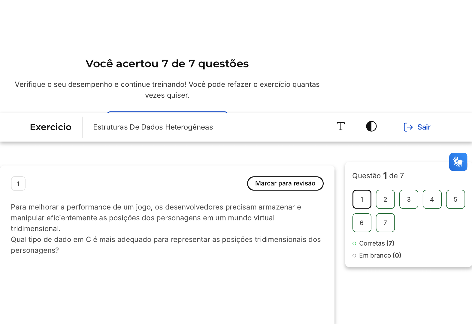 Você acertou 7 de 7 questões Verifique o seu desempenho e continue treinando! Você pode refazer o exercício quantas vezes quiser. Verificar Desempenho 1 Marcar para revisão Para melhorar a performance de um jogo, os desenvolvedores precisam armazenar e manipular eficientemente as posições dos personagens em um mundo virtual tridimensional. Qual tipo de dado em C é mais adequado para representar as posições tridimensionais dos personagens? Questão 1 de 7 Corretas �7� Em branco �0� 1 2 3 4 5 6 7 Exercicio Estruturas De Dados Heterogêneas Sair A B C D E Array de caracteres. Estrutura contendo três floats. Ponteiro para inteiro. Variável do tipo double. Lista ligada de structs. Resposta correta Parabéns, você selecionou a alternativa correta. Confira o gabarito comentado! Gabarito Comentado Uma estrutura contendo três floats é ideal para representar posições tridimensionais, pois permite armazenar as coordenadas x, y, e z de forma organizada e acessível, facilitando o cálculo de movimentos e a renderização gráfica no jogo. A B C D E 2 Marcar para revisão Sobre estruturas de dados, assinale a alternativa CORRETA. Pilhas são tipos de dados abstratos caracterizadas pela política "primeiro a entrar, último a sair". Filas são comumente implementadas sobre arrays ou grafos. Árvores de busca binárias são estruturas nas quais nós filhos possuem valores numericamente inferiores aos dos nós pais. Grafos são estruturas de dados em que cada nó possui um valor e um conjunto de relações unidirecionais com os demais nós. Listas duplamente ligadas são estruturas em que cada nó possui uma referência tanto ao nó que o antecede quanto ao nó que o sucede. Além disso, o último nó da lista também possui uma referência para o primeiro nó da lista. Resposta correta Parabéns, você selecionou a alternativa correta. Confira o gabarito comentado! A B C Gabarito Comentado A alternativa correta é a letra A. As pilhas são estruturas de dados que seguem a política de "primeiro a entrar, último a sair" (também conhecida como LIFO � Last In, First Out). Isso significa que o último elemento que foi adicionado à pilha será o primeiro a ser removido. Essa característica é fundamental para o funcionamento de diversas operações em ciência da computação, como a execução de funções e a análise de expressões matemáticas. 3 Marcar para revisão �IADES/2018� A sigla FIFO refere-se a estruturas de dados do tipo fila. Como é o funcionamento em uma FIFO? O primeiro objeto inserido na fila é o último a ser removido. O primeiro objeto inserido na fila é também o primeiro a ser removido. O último objeto inserido na fila é o primeiro a ser removido. D E O programador irá definir a ordem de entrada e de saída dos objetos em uma FIFO. Uma FIFO e uma LIFO possuem as mesmas características de entrada e de saída dos objetos. Resposta correta Parabéns, você selecionou a alternativa correta. Confira o gabarito comentado! Gabarito Comentado RESPOSTA CORRETA� O primeiro objeto inserido na fila é também o primeiro a ser removido. 4 Marcar para revisão Em um projeto de software para gerenciamento de bibliotecas, utiliza-se a estrutura de dados heterogênea para modelar livros. Cada livro é representado por uma estrutura contendo título, autor, ano de publicação e status de empréstimo. Qual estrutura de dados em C é mais apropriada para armazenar os detalhes de cada livro no projeto descrito? A B C D E Array de inteiros. Lista ligada de caracteres. Estrutura (struct). Ponteiro para void. Matriz bidimensional de floats. Resposta correta Parabéns, você selecionou a alternativa correta. Confira o gabarito comentado! Gabarito Comentado A alternativa correta é a estrutura (struct) porque permite agrupar diferentes tipos de dados (como strings para título e autor, int para ano de publicação, e um booleano para o status de empréstimo), o que é ideal para representar livros em um sistema de gerenciamento de biblioteca. A B C D E 5 Marcar para revisão Em um sistema de gerenciamento de estoque, utiliza-se uma estrutura para armazenar informações dos produtos, como código, descrição, quantidade e preço. É necessário acessar rapidamente essas informações para atualizações frequentes. Como se deve acessar os membros de uma estrutura em C para realizar atualizações? Operador de desreferência. Operador ponto (.). Operador seta (�). Indexação de array. Chamada de função. Resposta correta Parabéns, você selecionou a alternativa correta. Confira o gabarito comentado! Gabarito Comentado A B C O operador ponto (.) é usado para acessar membros de uma estrutura quando se trabalha com uma instância da estrutura. Este método é eficaz para atualizações rápidas em sistemas de gerenciamento de estoque, permitindo a manipulação direta dos dados dos produtos. 6 Marcar para revisão A linguagem C permite alocar (reservar) dinamicamente (em tempo de execução) blocos de memórias utilizando ponteiros. A esse processo dá-se o nome de alocação dinâmica, que faz uso das funções malloc, calloc, realloc e free, disponíveis na biblioteca stdlib.h. Para liberar um bloco de memória previamente alocado, por meio de um único parâmetro de entrada, faz- se uso de qual função? Malloc Calloc Realloc D E Free Clear Resposta correta Parabéns, você selecionou a alternativa correta. Confira o gabarito comentado! Gabarito Comentado Free 7 Marcar para revisão �UFAM/2022� Considere o programa a seguir, elaborado na linguagem ANSI C� #include < stdio.h > int* pa, a; int main() { a = 10; pa = &a; a = 8; printf("%d", a); printf(" %d", *pa); } Assinale a alternativa correta sobre a saída (output) obtida, ao se executar o programa: A B C D E 8 8 10 8 8 10 10 10 9 10 Resposta correta Parabéns, você selecionou a alternativa correta. Confira o gabarito comentado! Gabarito Comentado RESPOSTA CORRETA� 8 8