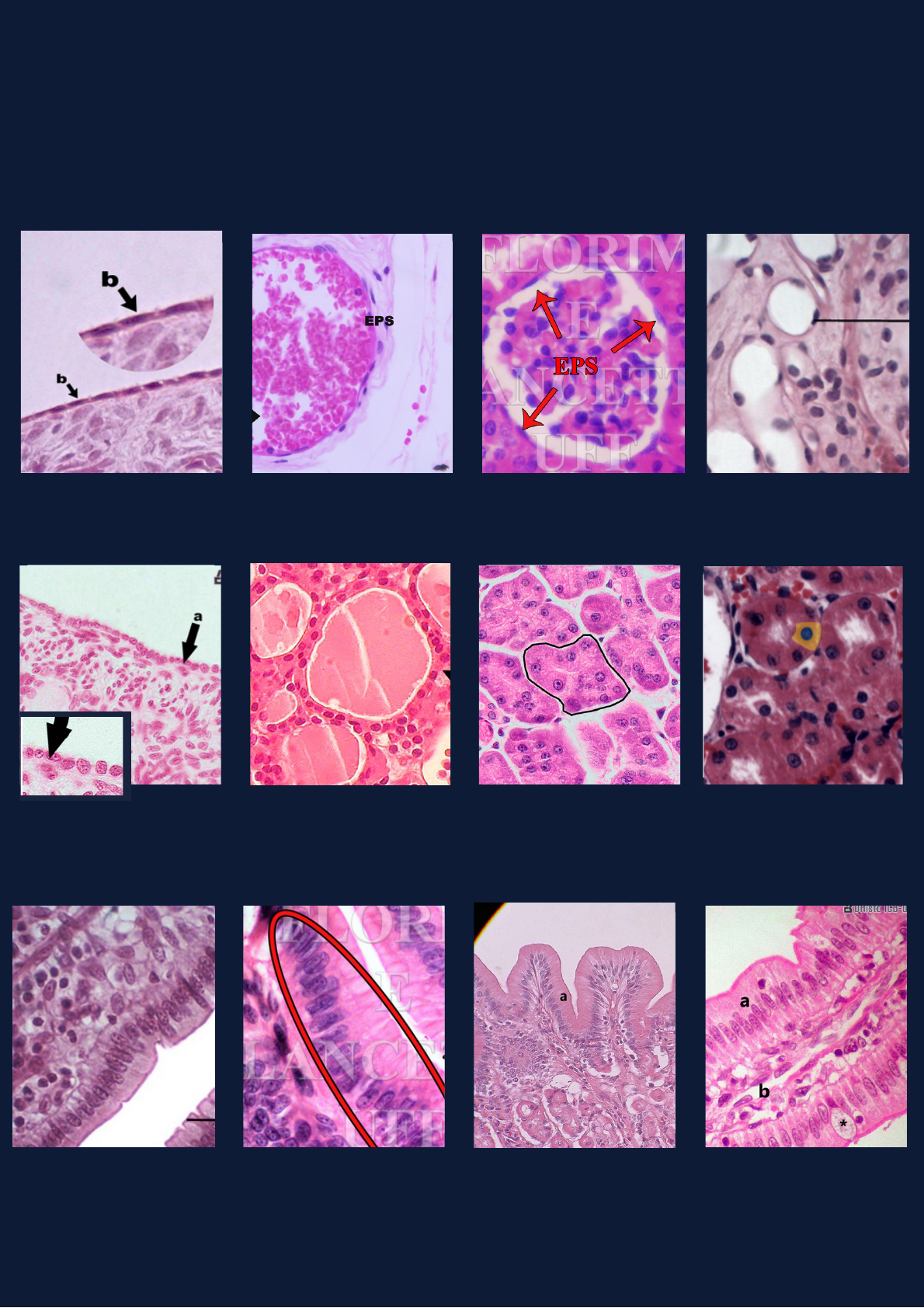 E p i t é l i o d e r e v e s t i m e n t o c ú b i c o s i m p l e s E p i t é l i o d e r e v e s t i m e n t o p a v i m e n t o s o s i m p l e s E p i t é l i o d e r e v e s t i m e n t o p r i s m á t i c o s i m p l e s TECIDO EPITELIAL DE REVESTIMENTO SIMPLES E p i t é l i o p s e u d o e s t r a t i f i c a d o c i l í n d r i c o c i l i a d o Apenas esse: epitelio estratificado cúbico/colunar Só uma camada de células, porém elas apresentam alturas diferentes, o que resulta na distribuição variada de seus núcleos, dando a falsa impressão de estratificação. Epitélio ESTRATIFICADO pavimentoso: Se tem ausência de nucleos na superfície apical, já é uma dica de que é pseudoestratificado!! A presença de cílios só existem em pseudoestratificado e simples. Se tem cilios +nucleo em alturas variadas = pseudoestratificado! D I C A E p i t é l i o E S T R A T I F I C A D O d e T R A N S I Ç Ã O : b e x i g a o b s e r v a r c é l u l a s g l o b o s a s n o á p i c e TECIDO CONJUNTIVO: frouxo /denso O tecido conjuntivo propriamente dito é aquele que segue LOGO ABAIXO ao epitelial. Nesse, vão predominar os fibroblastos e fibras colágenas. FIBROBLASTOS EM AMARELO FIBRÓCITOS EM VERDE - FIBRÓCITOS MAIS DELGADOS PODE SER FROUXO OU DENSO: Tecido conjuntivo frouxo tem bastante células, quase nao vemos fibras. (em verde). Adjacente ao tecido epitelial Em vermelho esta o tecido conjuntivo denso nao modelado. Onde há maior predominio de fibras colágenas. A maioria das celulas sao fibroblastos. F: fibroblasto FC: fibra colagena (em rosa) linha: tecido cnjt frouxo DENSO MODELADO DENSO NÃO MODELADO AQUI A MAIORIA DOS NUCLEOS VISTOS SERÃO DE FIBROBLASTOS fibras em varias direções CONJUNTIVO DENSO EPITÉLIO CONJUNTIVO FROUXO MODELADO NÃO MODELADO Eles se diferem pela diferença na disposição de cleulas e fibras Cartilaginoso estriado epitelio pavimentoso cubico prismático simples pseudoestratificado estratificado conjuntivo frouxo + células - fibras conjuntivo denso modelado não modelado-células, + fibras fibras na mesma direção fibras ordenadas aleatoriamente ver adipócitos e nucleos na periferia (circulos brancos de gordura)Adiposo hialina elastica pericondrio - nas extremidades condroblastos - na periferia condrocitos - dentro da lacuna grupos isógenos - celulas com condrócitos repartidas sla Se tem ausência de nucleos na superfície apical Se tem cilios +nucleo em alturas variadas Ósseo: desgastado descalcificado sistema de Havers - canal central + lamelas ósseas Lacunas Osteoblastos/ Osteócitos Canalículos Osteoclasto Periósteo Canal de volkman a matriz extracelular da cartilagem é basófila e se cora em tons de azul!! a matriz extracelular óssea é eosinófila ou acidófila e se cora em vermelho ou rosa ! Muscular liso esqueletico cardíaco estriação transversal - núcleo periferico apenas uma camada de células Varias camadas. a mais apical classifica estriação menos visivel - Núcleos em posição central nas células - presença de discos intercalares e ramificações Nervoso pericários - dentritos - axionios - sinapses - subst. branca/cinzenta - perineuro - endoneuro - epineuro - feixe nervoso/fibra nervosa/ nervo Cartilaginoso estriado epitelio pavimentoso cubico prismático simples pseudoestratificado estratificado conjuntivo frouxo + células - fibras conjuntivo denso modelado não modelado-células, + fibras fibras na mesma direção fibras ordenadas aleatoriamente ver adipócitos e nucleos na periferia (circulos brancos de gordura)Adiposo hialina elastica pericondrio - nas extremidades condroblastos - na periferia condrocitos - dentro da lacuna grupos isógenos - celulas com condrócitos repartidas sla Se tem ausência de nucleos na superfície apical Se tem cilios +nucleo em alturas variadas Ósseo: desgastado descalcificado sistema de Havers - canal central + lamelas ósseas Lacunas Osteoblastos/ Osteócitos Canalículos Osteoclasto Periósteo Canal de volkman a matriz extracelular da cartilagem é basófila e se cora em tons de azul!! a matriz extracelular óssea é eosinófila ou acidófila e se cora em vermelho ou rosa ! Muscular liso esqueletico cardíaco estriação transversal - núcleo periferico apenas uma camada de células Varias camadas. a mais apical classifica estriação menos visivel - Núcleos em posição central nas células - presença de discos intercalares e ramificações Nervoso pericários - dentritos - axionios - sinapses - subst. branca/cinzenta - perineuro - endoneuro - epineuro - feixe nervoso/fibra nervosa/ nervo TECIDO CONJUNTIVO: Adiposo OS NUCLEOS FICAM NA PERIFERIA DAS CELULAS ADIPÓCITO epitelial TECIDO CONJUNTIVO: Cartilaginoso - hialina células: Condroblasto e condrócito frouxo denso tudo isso é cartilagem Essa cartiagem hialina é revestida nas duas extremidades pelo PERICÔNDRIO (bolinha vermelha) Primeiro é formado condroblastos, pelo pericondrio e depois estes viram condrocitos. Entao vc vai primeiro ver o pericondrio, e ai dps a transição do pericondrio para a cartilagem que tera mto condroblastos e mais adiante vc ja vai conseguir ver condrócitos e grupos isogenos CONDROBLASTOS NA PERIFERIA CONDROCITOS DENTRO DA LACUNA P, pericôndrio; pf, pericôndrio fibroso; pc, pericôndrio celular; CL, condrócito na lacuna; Circulo, grupo isogênico coronal; Retângulo, grupo isogênico axial. pf, pericôndrio fibroso; pc, pericôndrio celular; CL, condrócito na lacuna; Circulo, grupo isogênico coronal; Retângulo, grupo isogênico axial. P, pericôndrio; F, fibroblasto; FC, fibra colágena; pf, pericôndrio fibroso; pc, pericôndrio celular. Cartilagem Elastica pericondrio diferença com a hialina: tem mais fibras condroblastos condrocitos dentro de lacunas Tecido Ósseo: P, pericôndrio; pf, pericôndrio fibroso; pc, pericôndrio celular; CL, condrócito na lacuna; FE, fibra elástica. Lâmina histológica com marcação não específica para fibra elástica. sistema de Havers -