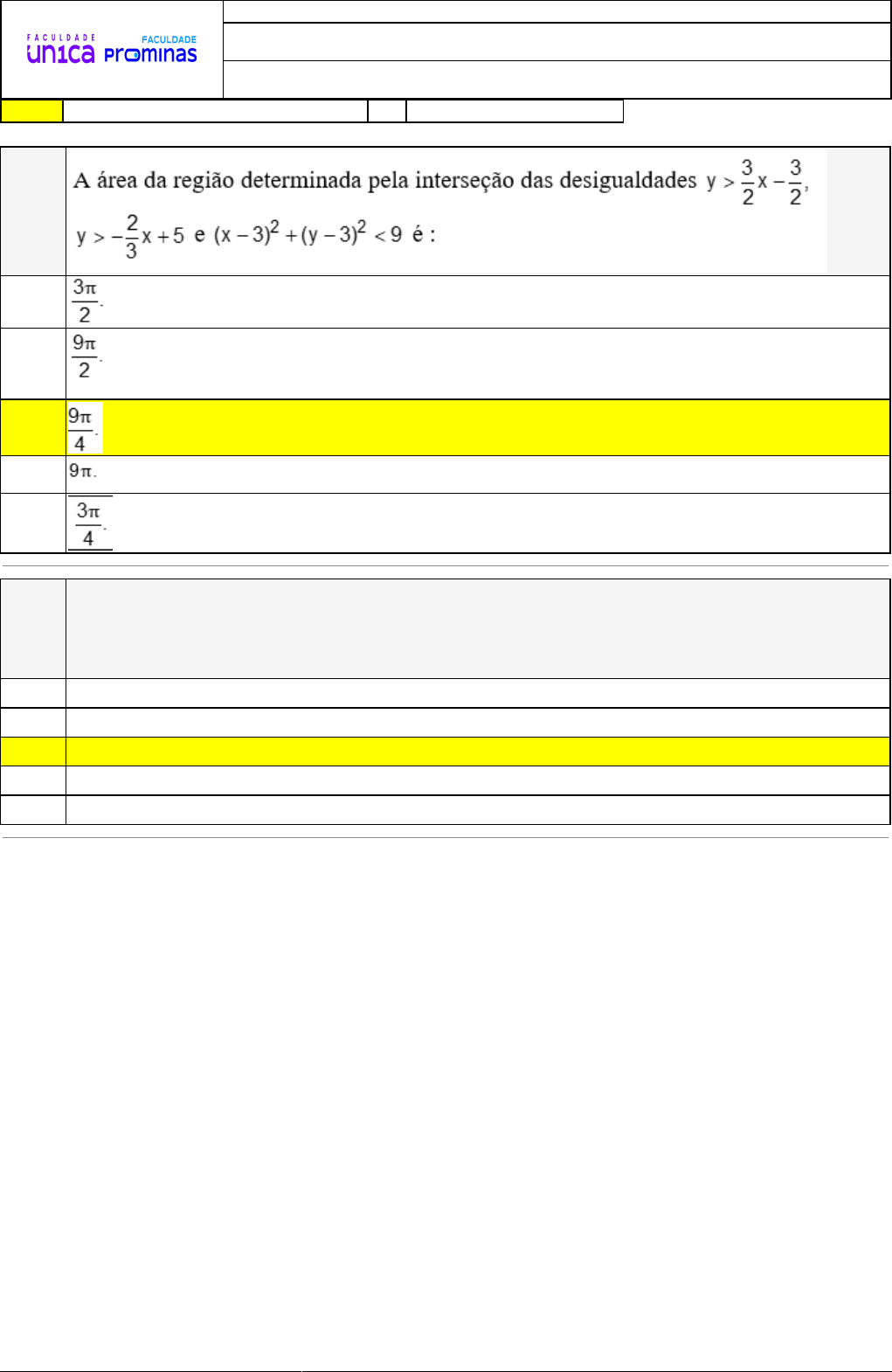 14/08/2024 09:04:17 1/4 REVISÃO DE SIMULADO Nome: ANTONIO FERNANDO DA SILVA SOUTO Disciplina: Geometria Analítica e Álgebra Linear Respostas corretas são marcadas em amarelo X Respostas marcardas por você. Questão 001 A) B) C) D) X E) Questão 002 No plano, com o sistema de coordenadas cartesianas usual, os gráficos das funções reais de variável real f(x) = x2 - 6x + 9 e g(x) = -x2 + 6x -1 são parábolas. Os pontos de interseção dessas parábolas juntamente com seus vértices são vértices de um quadrilátero convexo, cuja medida da área é igual a: A) 20 u.a B) 22 u.a C) 16 u.a D) 18 u.a X E) 24 u.a 14/08/2024 09:04:17 2/4 Questão 003 Sendo dada uma reta r do plano de coordenadas cartesianas, podemos escrevê-la da forma geral ( usando por exemplo a condição de alinhamento de três pontos com o determinante de ordem 3 ), porém, podemos apresentar uma reta na forma reduzida, que seria, de uma forma bem rápida, obtida ao isolarmos a variável y na forma geral Assim então, podemos verificar que o coeficiente de x e nessa forma reduzida será denominado de coeficiente angular e estará relacionado com a inclinação da reta que ele representa ( o coeficiente angular também será cahamado de declividade ) Observando as retas r e s apresentadas no plano cartesiano a seguir, determine então os valores dos coeficientes angulares de cada uma delas A) B) C) D) X E) Questão 004 Uma hipérbole como a apresentada na figura abaixo, tem como equação geral a seguinte expressão algébrica: 14/08/2024 09:04:17 3/4 A) B) C) D) X E) Questão 005 A condição de alinhamento a respeito de três pontos, nos informa que se o determinante que envolve as coordenadas dos pontos for igual a zero, podemos garantir que os pontos apresentados são colineares. Podemos então concluir que se os pontos não estiverem alinhados, obrigatoriamente eles serão vértices de um triângulo qualquer do plano cartesiano. Analisando os pontos A( 3k+2; -1 ), B( 2; 3 ) e C ( -1; 4 ), encontre a condição para que eles sejam vértices de um triângulo ABC. A) k ≠ 3 B) k = -1 C) k ≠ 4 D) k ≠ 0 X E) k ≠ 2 Questão 006 Em um plano cartesiano, seja r a reta de equação x-3y+ 6 = 0 A reta é perpendicular à reta e delimita, com os eixos coordenados, no primeiro quadrante, um triângulo de área A) B) C) D) X E) 14/08/2024 09:04:17 4/4 Questão 007 A) 3 B) 9 C) 1 D) 5 X E) 4 Questão 008 O estudo da geometria analítica possibilita a análise de estruturas geométricas através de equações e normas algébricas, não excluindo totalmente a visualização de tais estruturas geométricas pela sua forma. Com base nessas informações e observando a figura abaixo, julgue as afirmativas a seguir em verdadeiras ou falsas. I – A circunferência apresentada tem centro no ponto C (2; 1). II – A equação geral da circunferência é dada por x2 + y2 + 2x +y – 3 =0. III – A distância do centro da circunferência apresentada até a origem do sistema de coordenadas cartesianas é igual a √5. IV – Ao traçarmos uma reta que passa pelo centro da circunferência e pelo ponto A ( -1; 3), a sua equação geral será dada por 2x +3y -7 = 0. Em relação às afirmativas apresentadas acima, podemos dizer que: A) somente IV está correta. B) todas estão corretas. C) todas são incorretas. D) somente I e IV estão incorretas. X E) somente as afirmativas I, III e IV estão corretas.