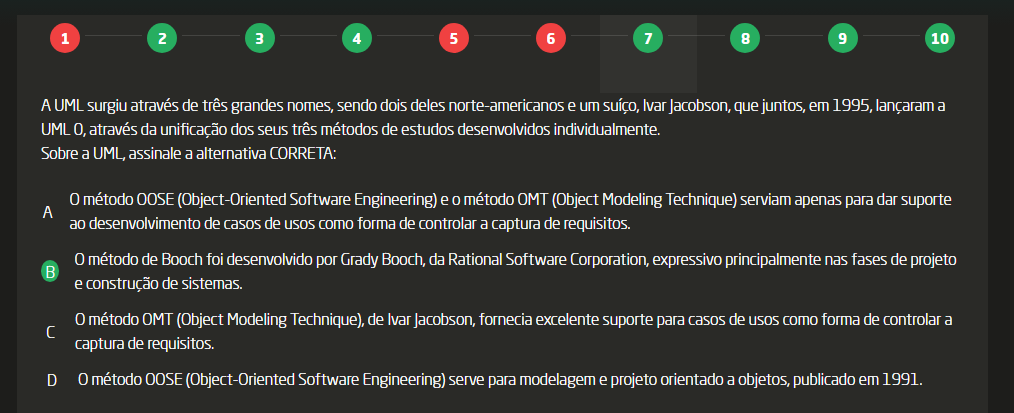 <p>1 2 3 4 5 6 7 8 9 10 A UML surgiu através de três grandes nomes, sendo dois deles norte-americanos e um Ivar Jacobson, que juntos, em 1995, lançaram a UML 0, através da unificação dos seus três métodos de estudos desenvolvidos individualmente. Sobre a UML, assinale a alternativa CORRETA: 0 método OOSE (Object-Oriented Software Engineering) e método OMT (Object Modeling Technique) serviam apenas para dar suporte A ao desenvolvimento de casos de como forma de controlar a captura de requisitos. método de Booch foi desenvolvido por Grady Booch, da Rational Software Corporation, expressivo principalmente nas fases de projeto e construção de sistemas. método OMT (Object Modeling Technique), de Ivar Jacobson, fornecia excelente suporte para casos de usos como forma de controlar a C captura de requisitos. D 0 método OOSE (Object-Oriented Software Engineering) serve para modelagem e projeto orientado a objetos, publicado em 1991.</p>