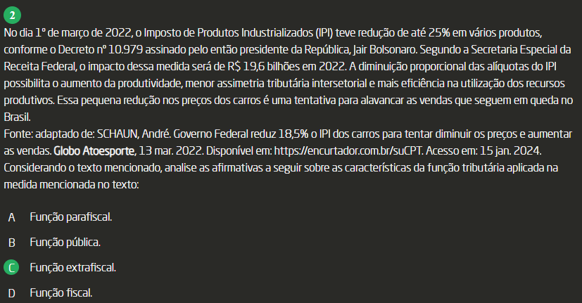 <p>2 No dia 1° de março de 2022, Imposto de Produtos Industrializados (IPI) teve redução de até 25% em vários produtos, conforme Decreto n° 10.979 assinado pelo então presidente da República, Bolsonaro. Segundo a Secretaria Especial da Receita Federal, impacto dessa medida será de bilhões em 2022. A diminuição proporcional das alíquotas do IPI possibilita aumento da produtividade, menor assimetria tributária intersetorial e mais eficiência na utilização dos recursos produtivos. Essa pequena redução nos preços dos carros é uma tentativa para alavancar as vendas que seguem em queda no Brasil. Fonte: adaptado de: SCHAUN, André. Governo Federal reduz 18,5% IPI dos carros para tentar diminuir os preços e aumentar as vendas. Globo Atoesporte, 13 mar. 2022. Disponível em: Acesso em: 15 jan. 2024. Considerando texto mencionado, analise as afirmativas a seguir sobre as características da função tributária aplicada na medida mencionada no texto: A Função parafiscal. B Função pública. C Função extrafiscal. D Função fiscal.</p>