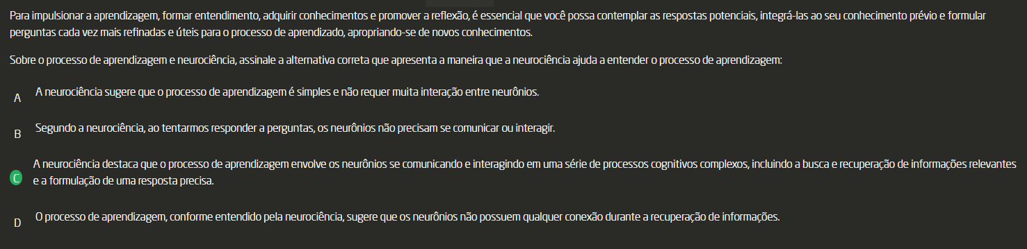 <p>Para impulsionar a aprendizagem, formar entendimento, adquirir conhecimentos e promover a reflexão, é essencial que você possa contemplar as respostas potenciais, integrá-las ao seu conhecimento prévio e formular perguntas cada vez mais refinadas e úteis para processo de aprendizado, apropriando-se de novos conhecimentos. Sobre processo de aprendizagem e neurociência, assinale a alternativa correta que apresenta a maneira que a neurociência ajuda a entender processo de aprendizagem: A A neurociência sugere que processo de aprendizagem é simples e não requer muita interação entre neurônios. B Segundo a neurociência, ao tentarmos responder a perguntas, os neurônios não precisam se comunicar ou interagir. A neurociência destaca que processo de aprendizagem envolve os neurônios se comunicando e interagindo em uma série de processos cognitivos complexos, incluindo a busca e recuperação de informações relevantes e a formulação de uma resposta precisa. D 0 processo de aprendizagem, conforme entendido pela neurociência, sugere que neurônios não possuem qualquer conexão durante a recuperação de informações.</p>