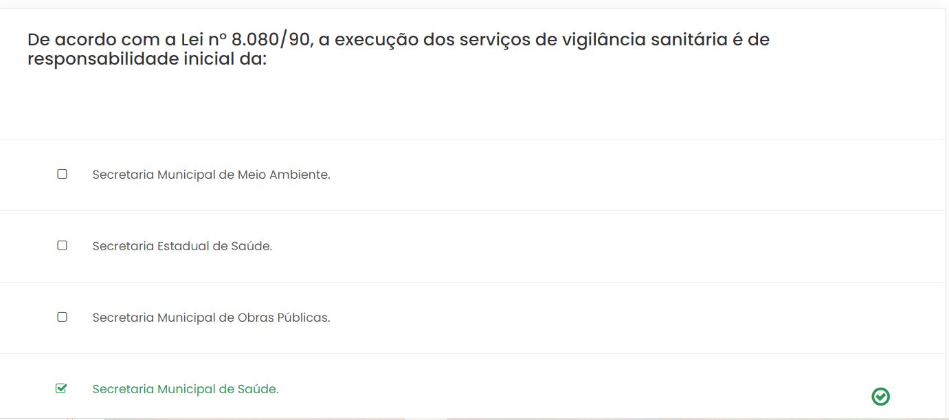 <p>De acordo com a Lei n° 8.080/90, a execução dos serviços de vigilância sanitária é de responsabilidade inicial da: Secretaria Municipal de Meio Ambiente. Secretaria Estadual de Secretaria Municipal de Obras Públicas. Secretaria Municipal de Saúde.</p>