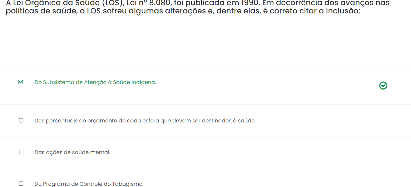 <p>A Lei Organica da (LOS), Lei n° 8.080, foi publicada em 1990. Em dos avanços nas políticas de saúde, a LOS sofreu algumas alterações e, dentre elas, é correto citar a inclusão: Do Subsistema de Atenção à Saúde indígena. Dos percentuais do orçamento de cada esfera que devem ser destinados à saúde Das ações de saúde Do Programa de Controle do Tabagismo.</p>