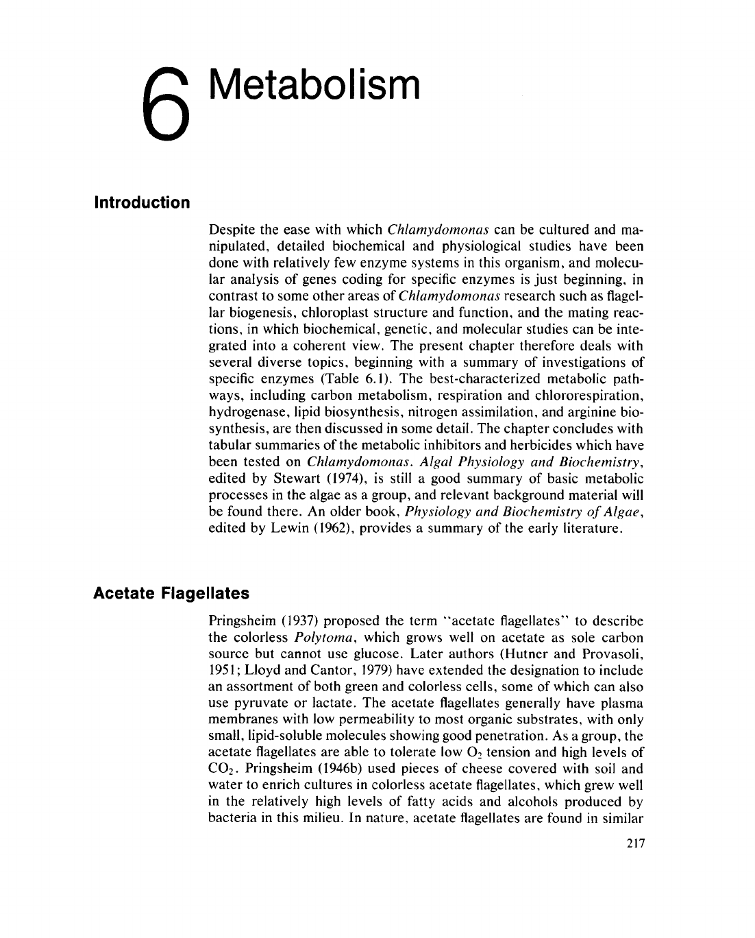 6 Metabolism Introduction Despite the ease with which Chlamydomonas can be cultured and ma- nipulated, detailed biochemical and physiological studies have been done with relatively few enzyme systems in this organism, and molecu- lar analysis of genes coding for specific enzymes is just beginning, in contrast to some other areas of Chlamydomonas research such as flagel- lar biogenesis, chloroplast structure and function, and the mating reac- tions, in which biochemical, genetic, and molecular studies can be inte- grated into a coherent view. The present chapter therefore deals with several diverse topics, beginning with a summary of investigations of specific enzymes (Table 6.1). The best-characterized metabolic path- ways, including carbon metabolism, respiration and chlororespiration, hydrogenase, lipid biosynthesis, nitrogen assimilation, and arginine bio- synthesis, are then discussed in some detail. The chapter concludes with tabular summaries of the metabolic inhibitors and herbicides which have been tested on Chlamydomonas. Algal Physiology and Biochemistry, edited by Stewart (1974), is still a good summary of basic metabolic processes in the algae as a group, and relevant background material will be found there. An older book, Physiology and Biochemistry of Algae, edited by Lewin (1962), provides a summary of the early literature. Acetate Flagellates Pringsheim (1937) proposed the term "acetate flagellates" to describe the colorless Polytoma, which grows well on acetate as sole carbon source but cannot use glucose. Later authors (Hutner and Provasoli, 1951 ; L loyd and Cantor, 1979) have extended the designation to include an assortment of both green and colorless cells, some of which can also use pyruvate or lactate. The acetate flagellates generally have plasma membranes with low permeability to most organic substrates, with only small, lipid-soluble molecules showing good penetration. A s a group, the acetate flagellates are able to tolerate low 0 2 tension and high levels of C 0 2 . Pringsheim (1946b) used pieces of cheese covered with soil and water to enrich cultures in colorless acetate flagellates, which grew well in the relatively high levels of fatty acids and alcohols produced by bacteria in this milieu. In nature, acetate flagellates are found in similar 217 218 6. Metabolism EC number Enzyme Reference EC 1.1.1.1 Alcohol dehydrogenase Grondai et al. (1983); Kreuzberg et al. (1987) EC 1.1.1.3 Homoserine dehydrogenase Vincze and Dénes (1968, 1973) EC 1.1.1.25 Shikimic acid dehydrogenase Berlyn et al. (1970) EC 1.1.1.26 Glyoxylate reductase Hess and Tolbert (1967a); Zelitch and Day (1968); Bruin et al. (1970); Husic and Tolbert (1987a) EC 1.1.1.26? "Glycolate oxidase" Zelitch and Day (1968) EC 1.1.1.27 Lactate dehydrogenase Kreuzberg et al. (1987); Husic and Tolbert (1987b) EC 1.1.1.28 D-lactate dehydrogenase D. W. Husic and Tolbert (1985) EC 1.1.1.29 Hydroxypyruvate reductase (glycerate dehy- Stabenau (1974); Husic and Tolbert (1987a) drogenase) EC 1.1.1.37 Malate dehydrogenase Thomas and Delcarpio (1971); Frankel and Jones (1980) EC 1.1.1.42 Isocitrate dehydrogenase Hess and Tolbert (1967a); Ramaley and Hudock (1973); Foo and Badour (1977) EC 1.1.1.43 Phosphogluconate dehydrogenase Herbert et al. (1979); Hipkin and Cannons (1985); Klein (1986) EC 1.1.1.49 Glucose-6-phosphate dehydrogenase Herbert et al. (1979); Hipkin and Cannons (1985); Klein (1986) EC 1.1.99.14 Glycolate dehydrogenase Nelson and Tolbert (1969, 1970); Bruin et al. (1970); Cooksey (1971); Paul and Volcani (1976); Husic and Tolbert (1987b) EC 1.2.1.10 Aldehyde dehydrogenase Kreuzberg et al. (1987) EC 1.2.1.- Glyceraldehyde-3-phosphate dehydrogenase Hudock and Bart (1969) EC 1.2.1.12 Glyceraldehyde-3-phosphate dehydrogenase Klein (1986) ( N A D ) EC 1.2.1.13 Glyceraldehyde-3-phosphate dehydrogenase Klein (1986) (NADP) EC 1.2.1.37 Xanthine dehydrogenase Fernandez and Cârdenas (1981a); Pérez- Vicente et al. (1988) EC 1.2.1.38 Acetylglutamyl-phosphate reductase Strijkert and Sussenbach (1969) EC 1.2.4.1 Pyruvate dehydrogenase Kreuzberg et al. (1987) EC 1.4.1.1 Alanine dehydrogenase Kates and Jones (1964c, 1967); Frankel and Jones (1980) EC 1.4.1.3 Glutamate dehydrogenase Kates and Jones (1964c, 1967); Hudock and Bart (1967); Kivic et al. (1969); Thomas and Delcarpio (1971); Frankel and Jones (1980); Paul and Cooksey (1981a); Culli- more and Sims (1981a) EC 1.4.1.14 Glutamate synthase ( N A D H ) Cullimore and Sims (1981a,b): Marquez et al. (1984, 1986a) EC 1.4.7.1 Glutamate synthase (ferredoxin) Cullimore and Sims (1981a,b); Marquez et al. (1984, 1986a,b); Galvân et al. (1984) EC 1.6.6.2 Nitrate reductase Barea and Cârdenas (1975); Franco et al. (1984a); also see text EC 1.7.3.3 Urate oxidase Pineda et al. (1984a,b) EC 1.7.7.1 Nitrite reductase Barea and Cârdenas (1975); Florencio and Vega(1982, 1983a) T a b l e 6.1 E n z y m e s R e p o r t e d or Charac te r i zed f rom Chlamydomonas 8 Acetate Flagellates T a b l e 6.1 {continued) 219 EC number Enzyme Reference EC 1.9.3.1 Cytochrome c oxidase Klein (1986); Husic and Tolbert (1987b) EC 1.11.1.6 Catalase Bruin et al. (1970); Chua (1971); Stabenau (1974); Paul and Volcani (1976); Klein (1986) EC 1.11.1.- Ascorbate peroxidase Kow et al. (1982) EC 1.14.11.2 Prolyl hydroxylase Blankenstein et al. (1986) EC 1.18.3.1 Hydrogenase Roessler and Lien (1984a-c); see text EC 2.1.1.45 Thymidylate synthase Vandiver and Fites (1979) EC 2.1.2.1 Serine hydroxymethyl transferase Bruin et al. (1970) EC 2.1.3.2 Aspartate carbamoyltransferase Kates and Jones (1967) EC 2.1.3.3 Ornithine carbamoyltransferase Kates and Jones (1967); Strijkert and Sussen- bach (1969); Holden and Morris (1970) EC 2.2.1.1 Transketolase Salvucci and Ogren (1985) EC 2.3.1.8 Phosphotransacetylase Kreuzberg et al. (1987) EC 2.3.1.15 Glycerophosphate acyltransferase Jelsema et al. (1982); Michaels et al. (1983) EC 2.3.1.35 Glutamate acetyltransferase Staub and Dénes (1966); Dénes (1971c) EC 2.3.1.