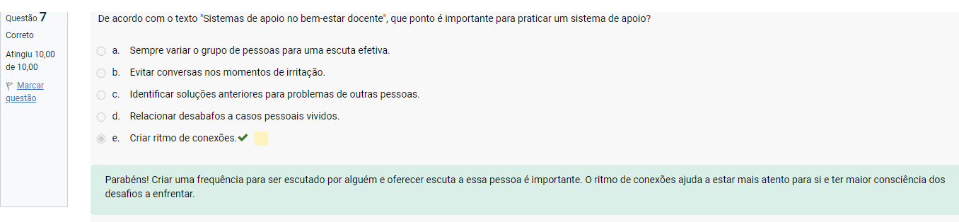<p>ão 7 De acordo com texto "Sistemas de apoio no bem-estar docente", que ponto é importante para praticar um sistema de apoio? to a. Sempre grupo de pessoas para uma escuta 00 b. Evitar conversas nos momentos de irritação. rcar io Identificar soluções anteriores para problemas de outras pessoas. d. Relacionar desabafos a casos pessoais e. Criar ritmo de Criar uma frequência para ser escutado por alguém e oferecer escuta a essa pessoa é importante. o ritmo de conexões ajuda a estar mais atento para si e ter maior consciência dos desafios a</p>