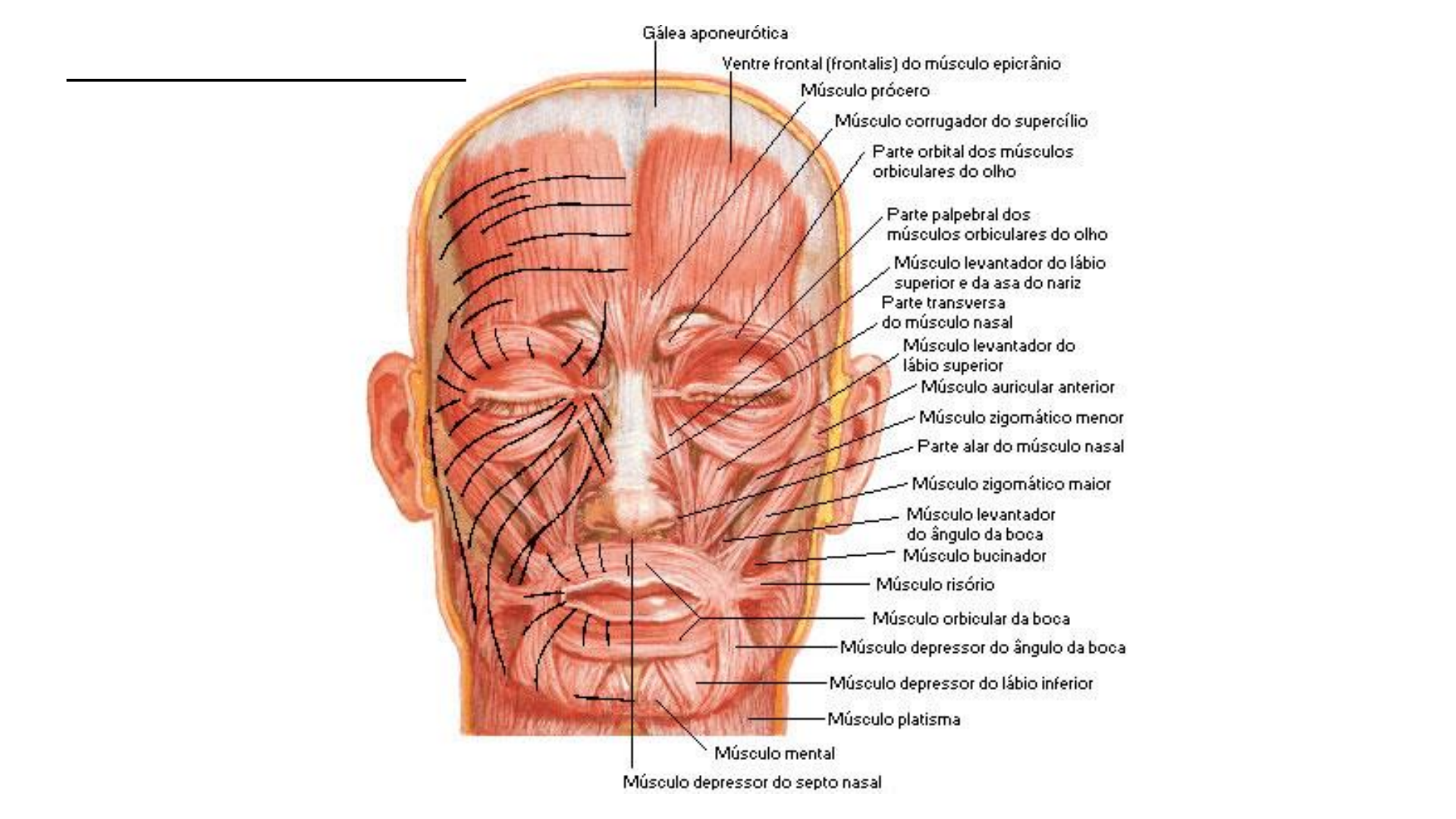 <p>MÚSCULO DA MÍMICA</p><p>VENTRE FRONTAL</p><p>ORIGEM: aponeurose epicrânica</p><p>INSERÇÃO: pele e tela subcutânea dos</p><p>supercílios e da fronte.</p><p>INERVAÇÃO: nervo facial (motora), N.</p><p>supratroclear e supraorbital (sensitiva).</p><p>AÇÃO: eleva as pálpebras e enruga a fronte;</p><p>movimenta o escalpo; eleva as sobrancelhas.</p><p>VENTRE OCCIPTAL</p><p>ORIGEM: linha nucal suprema</p><p>INSERÇÃO: gálea aponeurótica</p><p>INERVAÇÃO: nervo facial – Ramo auricular</p><p>posterior.</p><p>AÇÃO: retrai o couro cabeludo; aumenta a</p><p>eficácia do ventre frontal.</p><p>ANTERIOR</p><p>ORIGEM: porção anterior da</p><p>fáscia temporal.</p><p>INSERÇÃO: saliência na frente da</p><p>hélix.</p><p>INERVAÇÃO: nervo facial – ramo</p><p>temporal.</p><p>AÇÃO: traciona o pavilhão da</p><p>orelha para frente e para cima.</p><p>SUPERIOR</p><p>ORIGEM: fáscia da zona temporal</p><p>INSERÇÃO: tendão plano na</p><p>parte superior da superfície</p><p>craniana do pavilhão da orelha.</p><p>INERVAÇÃO: nervo facial – ramo</p><p>temporal.</p><p>AÇÃO: traciona o pavilhão da</p><p>orelha para cima.</p><p>POSTERIOR</p><p>ORIGEM: processo mastoideo.</p><p>INSERÇÃO: parte mais inferior</p><p>da superfície craniana da</p><p>concha.</p><p>INERVAÇÃO: nervo facial –</p><p>ramo auricular posterior.</p><p>AÇÃO: traciona o pavilhão da</p><p>orelha para trás.</p><p>MÚSCULOS AURICULARES</p><p>ORIGEM</p><p>• porção orbital: parte nasal do osso frontal.</p><p>• porção lacrimal: processo frontal da maxila, crista lacrimal posterior.</p><p>• porção palpebral: superfície anterior e bordas do ligamento palpebral</p><p>medial.</p><p>INSERÇÃO: pálpebras e pele periorbital.</p><p>INERVAÇÃO: nervo facial – ramos temporal e zigomático.</p><p>AÇÃO: fecha as pálpebras comprime o saco lacrimal e movimenta os</p><p>supercílios.</p><p>MÚSCULO ORBICULAR DO OLHO</p><p>ORIGEM: extremidade medial do arco</p><p>superciliar.</p><p>INSERÇÃO: pele superior ao meio da</p><p>margem supraorbital e arco superciliar.</p><p>INERVAÇÃO: nervo facial – ramo</p><p>temporal.</p><p>AÇÃO: eleva o supercílio medial e</p><p>inferiormente, criando rugas verticais</p><p>acima do nariz. Expressão facial de</p><p>preocupação.</p><p>MÚSCULO PRÓCERO</p><p>ORIGEM: osso nasal</p><p>INSERÇÃO: pele da glabela</p><p>INERVAÇÃO: nervo facial – ramo bucal</p><p>AÇÃO: puxa a porção medial do supercílio para</p><p>baixo.</p><p>MÚSCULO NASAL</p><p>ORIGEM: eminência canina; narina.</p><p>INSERÇÃO: dorso do nariz.</p><p>INERVAÇÃO: nervo facial (motora);</p><p>N. nasal – ramo etmoidal anterior</p><p>(sensitiva); N. infra-orbitário</p><p>(sensitiva).</p><p>AÇÃO: parte transversa</p><p>(compressora da narina); e parte</p><p>alar (dilatadora da narina).</p><p>MÚSCULO ABAIXADOR</p><p>DO SEPTO NASAL</p><p>ORIGEM: fossa incisiva</p><p>da maxila</p><p>INSERÇÃO: septo e na</p><p>parte dorsal da asa do</p><p>nariz.</p><p>INERVAÇÃO: nervo facial</p><p>(VII) – ramo bucal.</p><p>AÇÃO: traciona para</p><p>baixo as asas do nariz –</p><p>estreita.</p><p>MÚSCULO ORBICULAR DA BOCA</p><p>ORIGEM: quase todo cutâneo; fóveas incisivas da maxila e mandíbula.</p><p>INSERÇÃO: pele e mucosas dos lábios; septo nasal.</p><p>INERVAÇÃO: nervo facial – ramo bucal.</p><p>AÇÃO: comprime, fecha e protrai os lábios.</p><p>MÚSCULO LEVANTADOR DO LÁBIO SUPERIOR</p><p>ORIGEM: margem infraorbital.</p><p>INSERÇÃO: lábio superior</p><p>INERVAÇÃO: nervo facial – ramo bucal.</p><p>AÇÃO: levanta o lábio superior; ressalta o sulco nasolabial.</p><p>ORIGEM: processo frontal da maxila.</p><p>INSERÇÃO: asa do nariz; lábio superior.</p><p>INERVAÇÃO: nervo facial – ramo bucal.</p><p>AÇÃO: dilata a narina e levanta o lábio superior.</p><p>MÚSCULO LEVANTADOR DO LÁBIO SUPERIOR</p><p>E DA ASA DO NARIZ</p><p>MÚSCULO LEVANTADOR DO ÂNGULO DA BOCA</p><p>ORIGEM: fossa canina da maxila.</p><p>INSERÇÃO: ângulo da boca.</p><p>INERVAÇÃO: nervo facial – ramo bucal.</p><p>AÇÃO: levanta o ângulo da boca.</p><p>MÚSCULO ZIGOMÁTICO MENOR</p><p>MÚSCULO ZIGOMÁTICO MAIOR</p><p>ORIGEM: osso zigomático.</p><p>INSERÇÃO: lábio superior.</p><p>INERVAÇÃO: nervo facial – ramo bucal.</p><p>AÇÃO: parte dos mm. dilatadores da boca;</p><p>retrai (eleva) e/ou everte o lábio superior;</p><p>aprofunda o sulco nasolabial (exprimindo</p><p>tristeza).</p><p>ORIGEM: osso zigomático.</p><p>INSERÇÃO: ângulo da boca.</p><p>INERVAÇÃO: nervo facial – ramo bucal.</p><p>AÇÃO: traciona o ângulo da boca para cima e</p><p>lateralmente.</p><p>MÚSCULO RISÓRIO</p><p>ORIGEM: pele da bochecha e fáscia massetérica.</p><p>INSERÇÃO: ângulo da boca.</p><p>INERVAÇÃO: ramos mandibular e bucal do nervo facial.</p><p>AÇÃO: retrair lateralmente o ângulo da boca.</p><p>MÚSCULO BUCINADOR</p><p>ORIGEM: processos alveolares da maxila e da mandíbula</p><p>na região molar; ligamento pterigomandibular.</p><p>INSERÇÃO: ângulo da boca.</p><p>INERVAÇÃO: ramos bucais do nervo facial.</p><p>AÇÃO: distende a bochecha e a comprime de encontro</p><p>aos dentes; retrai o ângulo da boca.</p><p>MÚSCULO ABAIXADOR DO ÂNGULO DA BOCA</p><p>ORIGEM: base da mandíbula (da região molar ao</p><p>tubérculo mentoniano).</p><p>INSERÇÃO: ângulo da boca.</p><p>INERVAÇÃO: nervo facial – ramo marginal da</p><p>mandíbula.</p><p>AÇÃO: abaixa o ângulo da boca.</p><p>MÚSCULO ABAIXADOR DO LÁBIO INFERIOR</p><p>ORIGEM: base da mandíbula (acima do abaixador do ângulo da boca).</p><p>INSERÇÃO: lábio inferior.</p><p>INERVAÇÃO: nervo facial – ramo marginal da mandíbula.</p><p>AÇÃO: abaixa o lábio inferior.</p><p>MÚSCULO MENTONIANO/MENTUAL</p><p>ORIGEM: fossa mentoniana, acima do tubérculo mentoniano.</p><p>INSERÇÃO: pele do mento.</p><p>INERVAÇÃO: nervo facial – ramo marginal da mandíbula.</p><p>AÇÃO: enruga a pele do mento; everte o lábio inferior.</p><p>MÚ