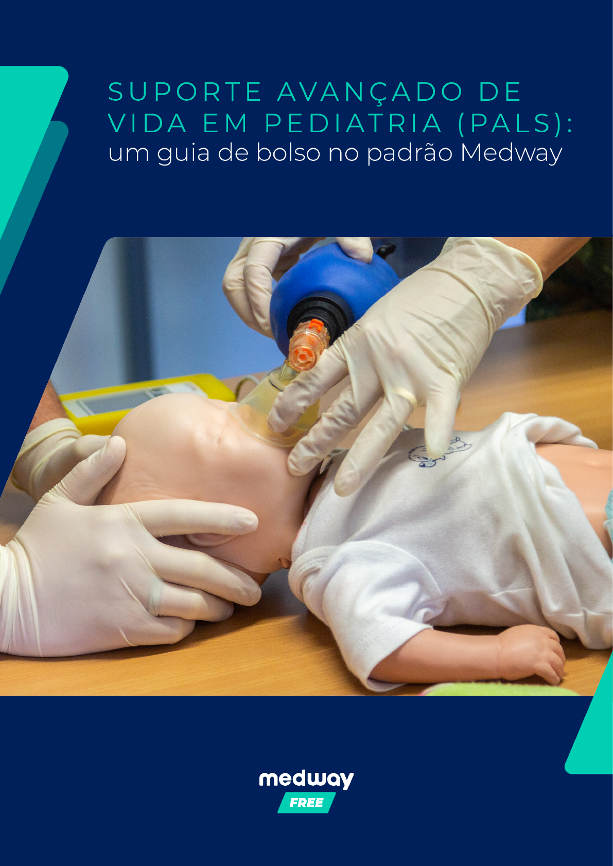OPA, BOM TE VER POR AQUI! Seja muito bem vindo ao nosso material gratuito “Suporte Avançado de Vide em Pediatria (PALS): um guia de bolso no padrão Medway”! Esperamos que ao finalizar este material você se sinta mais seguro ao se deparar com uma emergência pediátrica! Sabemos que o manejo dos pacientes pediátricos pode ser uma baita dor de cabeça pra quem não está habituado, principalmente pelas doses dos medicamentos e cálculos a serem realizados. Por isso, reunimos aqui as principais informações que você precisa saber na hora de manejar uma emergência pediátrica. Esperamos que aproveite! Boa leitura! Equipe Medway ÍNDICE Introdução ......................................................................................................................................................................6 Causas de PCR .............................................................................................................................................................6 Reconhecimento da PCR ......................................................................................................................................7 Compressões torácicas na RCP ..........................................................................................................................9 Ventilações na RCP .................................................................................................................................................. 11 Carrinho de parada chegou, e agora? .......................................................................................................... 13 Ritmo chocável ............................................................................................................................................................... 14 Ritmo não chocável ......................................................................................................................................................17 Via aérea durante a RCP ......................................................................................................................................18 Cuidados pós-parada e retorno da circulação espontânea ............................................................. 19 Referências Bibliográficas .................................................................................................................................20 Conclusão ..................................................................................................................................................................... 21 Anexos ........................................................................................................................................................................... 22 Sobre a Medway ............................................................................................................................................................22 Nossos cursos .................................................................................................................................................................. 24 Acesse gratuitamente ................................................................................................................................................26 Ficou alguma dúvida? ............................................................................................................................................... 28 QUEM SOMOS Boa leitura! Somos um time de médicos formados nas principais instituições de residência do Brasil. Conhecemos bem os obstáculos e as dificuldades que surgem durante a preparação para as provas de residência médica. Justamente por isso, e porque sentimos falta de ter alguém nos orientando lá atrás, tomamos a decisão de criar a Medway. Depois de muito estudo, trabalho duro e dedicação total, desenvolvemos cursos exclusivos e que nos enchem de orgulho. Isso porque, na prática, temos visto esses cursos serem a chave do sucesso na aprovação de milhares de alunos de Medicina em todo o país. Em quatro anos de existência, impactamos 16 mil alunos com uma metodologia diferente da convencional. Leve, objetiva e verdadeira. Sem dúvidas, essa última característica é o nosso maior diferencial. Não te enrolamos e nem falamos o que você quer ouvir. Não generalizamos. Te tratamos com respeito, da forma como gostaríamos de ser tratados. Muitos nos veem como professores ou mentores. Nós gostamos de nos enxergar como aqueles veteranos que você admira pelo conhecimento técnico, mas também pela didática e pelo lado humano. Se você chegou até aqui, saiba que já nos orgulhamos muito de você ter se conectado com a Medway. Estamos e estaremos ao seu lado para sermos parceiros em toda a sua jornada como profissional de Medicina. Até a prova de residência e depois dela. Vamos juntos até o final! https://www.medway.com.br/aprovados/ O QUE NOSSOS ALUNOS ESTÃO FALANDO? 6 Introdução Fala, moçada, prontos para salvar a vida de uma criança? Diariamente somos expostos a diferentes cenários dentro da prática médica, como consultas ambulatoriais, procedimentos e – talvez o mais emblemático – emergências. Dentro de um pronto socorro pediátrico, podemos encontrar diversas situações potencialmente fatais que, se não bem conduzidas, podem levar à parada cardiorrespiratória (PCR). Por mais que desejamos que isso não ocorra, precisamos ter em mente o fluxograma de atendimento dessa condição clínica para que possamos ser capazes de reverter de forma adequada uma parada. Antes de partirmos para o atendimento, é importante termos em mente que a PCR pediátrica é – geralmente – resultado de uma deterioração progressiva, sendo a causa mais comum a hipóxia. Nos adultos, ao contrário, a PCR geralmente instala-se de forma súbita! Causas de PCR Durante uma parada cardiorrespiratória, a causa exata nem sempre é tão evidente. Por i