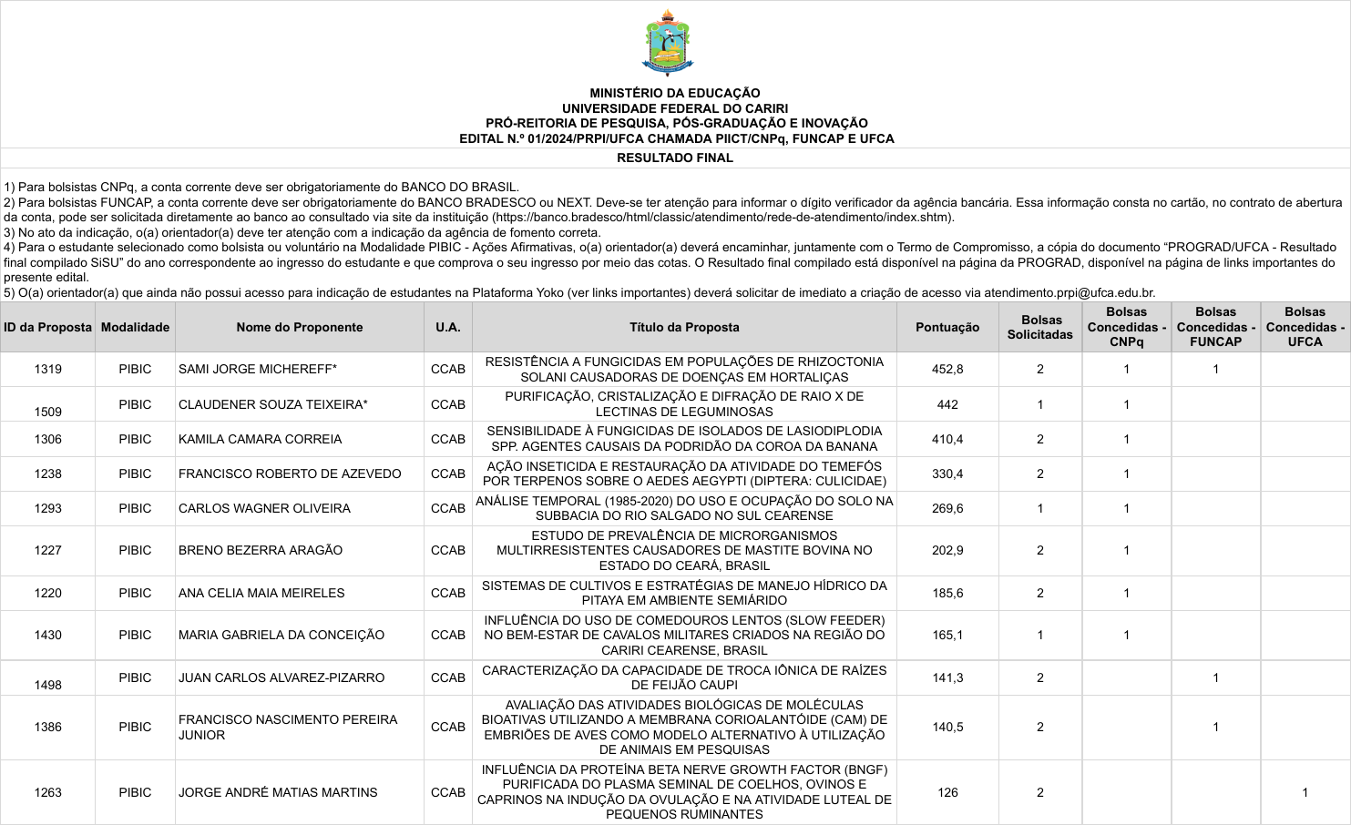 <p>MINISTÉRIO DA EDUCAÇÃO</p><p>UNIVERSIDADE FEDERAL DO CARIRI</p><p>PRÓ-REITORIA DE PESQUISA, PÓS-GRADUAÇÃO E INOVAÇÃO</p><p>EDITAL N.º 01/2024/PRPI/UFCA CHAMADA PIICT/CNPq, FUNCAP E UFCA</p><p>RESULTADO FINAL</p><p>ID da Proposta Modalidade Nome do Proponente U.A. Título da Proposta Pontuação Bolsas</p><p>Solicitadas</p><p>Bolsas</p><p>Concedidas -</p><p>CNPq</p><p>Bolsas</p><p>Concedidas -</p><p>FUNCAP</p><p>Bolsas</p><p>Concedidas -</p><p>UFCA</p><p>1) Para bolsistas CNPq, a conta corrente deve ser obrigatoriamente do BANCO DO BRASIL.</p><p>2) Para bolsistas FUNCAP, a conta corrente deve ser obrigatoriamente do BANCO BRADESCO ou NEXT. Deve-se ter atenção para informar o dígito verificador da agência bancária. Essa informação consta no cartão, no contrato de abertura</p><p>da conta, pode ser solicitada diretamente ao banco ao consultado via site da instituição (https://banco.bradesco/html/classic/atendimento/rede-de-atendimento/index.shtm).</p><p>3) No ato da indicação, o(a) orientador(a) deve ter atenção com a indicação da agência de fomento correta.</p><p>4) Para o estudante selecionado como bolsista ou voluntário na Modalidade PIBIC - Ações Afirmativas, o(a) orientador(a) deverá encaminhar, juntamente com o Termo de Compromisso, a cópia do documento “PROGRAD/UFCA - Resultado</p><p>final compilado SiSU” do ano correspondente ao ingresso do estudante e que comprova o seu ingresso por meio das cotas. O Resultado final compilado está disponível na página da PROGRAD, disponível na página de links importantes do</p><p>presente edital.</p><p>5) O(a) orientador(a) que ainda não possui acesso para indicação de estudantes na Plataforma Yoko (ver links importantes) deverá solicitar de imediato a criação de acesso via atendimento.prpi@ufca.edu.br.</p><p>1319 PIBIC SAMI JORGE MICHEREFF* CCAB RESISTÊNCIA A FUNGICIDAS EM POPULAÇÕES DE RHIZOCTONIA</p><p>SOLANI CAUSADORAS DE DOENÇAS EM HORTALIÇAS 452,8 2 1 1</p><p>1509 PIBIC CLAUDENER SOUZA TEIXEIRA* CCAB PURIFICAÇÃO, CRISTALIZAÇÃO E DIFRAÇÃO DE RAIO X DE</p><p>LECTINAS DE LEGUMINOSAS 442 1 1</p><p>1306 PIBIC KAMILA CAMARA CORREIA CCAB SENSIBILIDADE À FUNGICIDAS DE ISOLADOS DE LASIODIPLODIA</p><p>SPP. AGENTES CAUSAIS DA PODRIDÃO DA COROA DA BANANA 410,4 2 1</p><p>1238 PIBIC FRANCISCO ROBERTO DE AZEVEDO CCAB AÇÃO INSETICIDA E RESTAURAÇÃO DA ATIVIDADE DO TEMEFÓS</p><p>POR TERPENOS SOBRE O AEDES AEGYPTI (DIPTERA: CULICIDAE) 330,4 2 1</p><p>1293 PIBIC CARLOS WAGNER OLIVEIRA CCAB ANÁLISE TEMPORAL (1985-2020) DO USO E OCUPAÇÃO DO SOLO NA</p><p>SUBBACIA DO RIO SALGADO NO SUL CEARENSE 269,6 1 1</p><p>1227 PIBIC BRENO BEZERRA ARAGÃO CCAB</p><p>ESTUDO DE PREVALÊNCIA DE MICRORGANISMOS</p><p>MULTIRRESISTENTES CAUSADORES DE MASTITE BOVINA NO</p><p>ESTADO DO CEARÁ, BRASIL</p><p>202,9 2 1</p><p>1220 PIBIC ANA CELIA MAIA MEIRELES CCAB SISTEMAS DE CULTIVOS E ESTRATÉGIAS DE MANEJO HÍDRICO DA</p><p>PITAYA EM AMBIENTE SEMIÁRIDO 185,6 2 1</p><p>1430 PIBIC MARIA GABRIELA DA CONCEIÇÃO CCAB</p><p>INFLUÊNCIA DO USO DE COMEDOUROS LENTOS (SLOW FEEDER)</p><p>NO BEM-ESTAR DE CAVALOS MILITARES CRIADOS NA REGIÃO DO</p><p>CARIRI CEARENSE, BRASIL</p><p>165,1 1 1</p><p>1498 PIBIC JUAN CARLOS ALVAREZ-PIZARRO CCAB CARACTERIZAÇÃO DA CAPACIDADE DE TROCA IÔNICA DE RAÍZES</p><p>DE FEIJÃO CAUPI 141,3 2 1</p><p>1386 PIBIC FRANCISCO NASCIMENTO PEREIRA</p><p>JUNIOR CCAB</p><p>AVALIAÇÃO DAS ATIVIDADES BIOLÓGICAS DE MOLÉCULAS</p><p>BIOATIVAS UTILIZANDO A MEMBRANA CORIOALANTÓIDE (CAM) DE</p><p>EMBRIÕES DE AVES COMO MODELO ALTERNATIVO À UTILIZAÇÃO</p><p>DE ANIMAIS EM PESQUISAS</p><p>140,5 2 1</p><p>1263 PIBIC JORGE ANDRÉ MATIAS MARTINS CCAB</p><p>INFLUÊNCIA DA PROTEÍNA BETA NERVE GROWTH FACTOR (BNGF)</p><p>PURIFICADA DO PLASMA SEMINAL DE COELHOS, OVINOS E</p><p>CAPRINOS NA INDUÇÃO DA OVULAÇÃO E NA ATIVIDADE LUTEAL DE</p><p>PEQUENOS RUMINANTES</p><p>126 2 1</p><p>MINISTÉRIO DA EDUCAÇÃO</p><p>UNIVERSIDADE FEDERAL DO CARIRI</p><p>PRÓ-REITORIA DE PESQUISA, PÓS-GRADUAÇÃO E INOVAÇÃO</p><p>EDITAL N.º 01/2024/PRPI/UFCA CHAMADA PIICT/CNPq, FUNCAP E UFCA</p><p>RESULTADO FINAL</p><p>ID da Proposta Modalidade Nome do Proponente U.A. Título da Proposta Pontuação Bolsas</p><p>Solicitadas</p><p>Bolsas</p><p>Concedidas -</p><p>CNPq</p><p>Bolsas</p><p>Concedidas -</p><p>FUNCAP</p><p>Bolsas</p><p>Concedidas -</p><p>UFCA</p><p>1) Para bolsistas CNPq, a conta corrente deve ser obrigatoriamente do BANCO DO BRASIL.</p><p>2) Para bolsistas FUNCAP, a conta corrente deve ser obrigatoriamente do BANCO BRADESCO ou NEXT. Deve-se ter atenção para informar o dígito verificador da agência bancária. Essa informação consta no cartão, no contrato de abertura</p><p>da conta, pode ser solicitada diretamente ao banco ao consultado via site da instituição (https://banco.bradesco/html/classic/atendimento/rede-de-atendimento/index.shtm).</p><p>3) No ato da indicação, o(a) orientador(a) deve ter atenção com a indicação da agência de fomento correta.</p><p>4) Para o estudante selecionado como bolsista ou voluntário na Modalidade PIBIC - Ações Afirmativas, o(a) orientador(a) deverá encaminhar, juntamente com o Termo de Compromisso, a cópia do documento “PROGRAD/UFCA - Resultado</p><p>final compilado SiSU” do ano correspondente ao ingresso do estudante e que comprova o seu ingresso por meio das cotas. O Resultado final compilado está disponível na página da PROGRAD, disponível na página de links importantes do</p><p>presente edital.</p><p>5) O(a) orientador(a) que ainda não possui acesso para indicação de estudantes na Plataforma Yoko (ver links importantes) deverá solicitar de imediato a criação de acesso via atendimento.prpi@ufca.edu.br.</p><p>1297 PIBIC LAYZE CILMARA ALVES DA SILVA</p><p>VIEIRA CCAB</p><p>DETERMINAÇÃO DA SUSCETIBILIDADE ANTIMICROBIANA,</p><p>AVALIAÇÃO DA RESISTÊNCIA A METICILINA, PESQUISA DE</p><p>BETALACTAMASES E CARBEPENAMASES EM BACTÉRIAS</p><p>CAUSADORAS DE EN