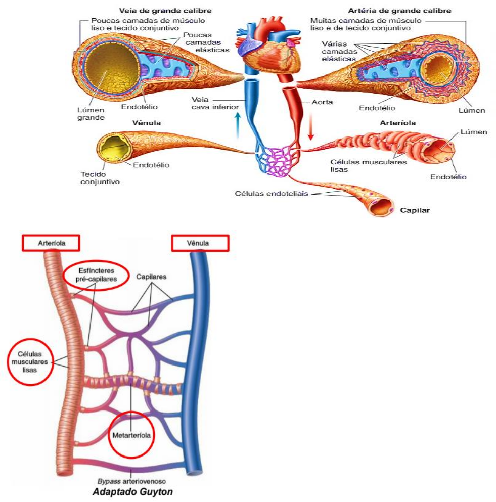<p>Microcirculação</p><p> O sistema arterial ramifica-se para liberar sangue para mais de 40 bilhões de</p><p>capilares no corpo.</p><p> A célula poucas vezes se encontra mais distante que 60 a 80 μm de algum capilar.</p><p> Os músculos capilares proveem uma área superficial total de cerca de 1.609 metros</p><p>quadrados para as trocas entre o sangue e o líquido intersticial.</p><p>Função: A microcirculação é responsável pelo transporte de nutrientes para os tecidos</p><p>e a remoção dos produtos da excreção celular (do metabolismo).</p><p> Rede arterial – é formada por uma grande</p><p>quantidade de músculo liso, são menos elásticas</p><p>que as vênulas.</p><p>Esfíncteres pré-capilares: são como fendas que</p><p>abrem e se fecham aumentando ou diminuindo</p><p>a quantidade de sangue. Quando eles se fecham</p><p>ocorre redução no fluxo sangue-tecido.</p><p>Metarteríolas: é um vasinho, responsável pela</p><p>ligação extra entre a vênula e a arteríola, e</p><p>nessas Metarteríolas que temos a capacidade do</p><p>sangue de passar por ela chegando às vênulas</p><p>sem que tenha chegado sangue nos tecidos.</p><p>Características dos capilares:</p><p> Os capilares são vasos sanguíneos que</p><p>consistem em uma monocamada de células</p><p>endoteliais envolvidas por uma membrana basal e uma fina rede de fibras reticulares de</p><p>colágeno.</p><p> As células endoteliais são extremamente delgadas, o que facilita as trocas de</p><p>nutrientes e gases.</p><p> Capilares são fendas que interligam o interior do capilar com o interstício.</p><p> A resistência pode ser controlada</p><p>constantemente pelo grau de contração ou</p><p>relaxamento das células musculares lisas</p><p>presente nesses vasos sanguíneos</p><p>(arteríolas – tônus vascular)</p><p> Quando as necessidades metabólicas</p><p>aumentam, como por exemplo, a atividade</p><p>física, ocorre vasodilatação das arteríolas</p><p>que irrigam esses territórios ocasionando</p><p>também o aumento do fluxo sanguíneo.</p><p> Em tecidos que não estão</p><p>metabolicamente ativos, naquele instante,</p><p>haverá vasoconstrição e redução do fluxo</p><p>sanguíneo, ocorrendo uma redistribuição do</p><p>fluxo sanguíneo, ou seja, mais sangue para região desejada e menos sangue para a</p><p>região menos desejada.</p><p> A regulação através de neurônios simpáticos acaba</p><p>provocando vasoconstrição venosa, provocando uma</p><p>elevação de pressão no seu interior (Pes).</p><p> Também temos ajuda da regulação pela contração</p><p>da musculatura esquelética.</p><p>Tipos de capilares:</p><p> Capilares contínuos: estão</p><p>presentes na maioria dos</p><p>tecidos do nosso organismo,</p><p>possuem junções</p><p>interendoteliais e não possuem</p><p>fenestras, possui uma grande quantidade de vesículas, e é um</p><p>capilar com uma passagem muito mais seletiva de nutrientes. É</p><p>predominante no cérebro.</p><p> Capilares fenestrados: possuem células endoteliais finas e perfuradas, formando</p><p>orifícios ou fenestrações obstruídas por um diafragma delgado (como se fosse uma</p><p>barreira para identificação). Esta fenestra possibilita a passagem do capilar para o tecido.</p><p>Possuem uma lâmina basal contínua e formam uma rede</p><p>capilar onde ocorre troca rápida de substâncias entre os</p><p>tecidos e o sangue. Está presente no intestino e em</p><p>glândulas exócrinas.</p><p> Capilares sinusóides: possuem fenestras também,</p><p>porém desprovidas de diafragma, as suas células são</p><p>endoteliais, mas não estão completamente unidas, portanto</p><p>sua lâmina basal é descontínua. A parede dos vasos facilita</p><p>a troca de metabólitos entre o sangue e os tecidos. Esses</p><p>capilares possuem uma fluidez mais facilitada. Estão</p><p>presentes no fígado e no baço.</p><p>Obs.: os capilares fenestrados e os capilares sinusóides são</p><p>muito comuns em órgãos que precisam de uma fluidez</p><p>menos seletiva.</p><p>Troca de líquidos através dos capilares:</p><p> É a possibilidade de difusão entre as células</p><p> A membrana da célula endotelial apresenta canais para</p><p>água, chamados Aquaporina, que é a principal via de</p><p>transporte de água pelo meio transcelular.</p><p> As junções interendoteliais, as fenestras ou as fendas</p><p>são o substrato anatômico para que ocorra o movimento</p><p>paracelular dos líquidos.</p><p> Substâncias lipossolúveis (mais fáceis): oxigênio e gás carbônico são substâncias</p><p>que possuem uma difusão livre através da membrana lipídica.</p><p> Substâncias hidrossolúveis (possui ajuda das fenestras): água, eletrólitos, glicose são</p><p>substâncias que precisam de ajuda das fendas intercelulares endoteliais para</p><p>atravessar a membrana.</p><p>Interstício e líquido intersticial:</p><p> Estrutura do interstício: o interstício é formado</p><p>por feixes de fibras de colágeno, filamentos de</p><p>proteoglicanos (sendo 98% de ácido hialurônico e</p><p>2% de proteínas), esses filamentos são espiralados,</p><p>finos e formam uma rede reticular.</p><p> O interstício é o que liga a célula ao capilar.</p><p> Líquido intersticial:</p><p> É um líquido derivado da filtração e difusão do líquido do capilar (plasma).</p><p> Este líquido é retido nos espaços entre os filamentos de proteoglicanos,</p><p>conhecido como um gel intersticial, por ter uma forma mais gelatinosa, porém</p><p>não impede a passagem de substâncias.</p><p> A quantidade de líquido livre é de apenas 1% (no edema, pode-se atingir mais da</p><p>metade do líquido intersticial de líquido livre).</p><p>Os capilares, em vários tecidos, apresentam grandes diferenças de suas permeabilidades,</p><p>de acordo com suas respectivas funções.</p><p>A intensidade ‘’efetiva’’ de difusão de uma substância, através de qualquer membrana,</p><p>é proporcional à sua diferença