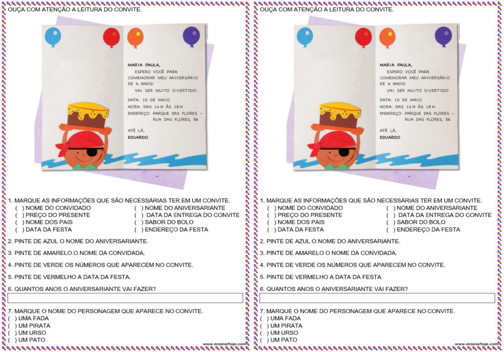 <p>OUÇA COM ATENÇÃO A LEITURA DO CONVITE. COM ATENÇÃO A LEITURA DO CONVITE. MARIA PAULA, MARIA PAULA, ESPERO PARA ESPERO VOCÊ PARA COMEMORAR MEU ANIVERSÁRIO COMEMORAR MEU ANIVERSÁRIO DE 6 ANOS! DE 6 ANOS! VAI SER MUITO DIVERTIDO! VAI SER MUITO DIVERTIDO! DATA: 10 DE MAIO DATA: 10 DE MAIO HORA: DAS ÀS HORA: DAS 14 H ÀS 18 H ENDEREÇO: PARQUE DAS FLORES ENDEREÇO: PARQUE DAS FLORES RUA DAS 56 RUA DAS 56 ATÉ LÁ, ATÉ LÁ, EDUARDO EDUARDO 1. MARQUE AS INFORMAÇÕES QUE SÃO NECESSÁRIAS TER EM UM CONVITE. 1. MARQUE AS INFORMAÇÕES QUE SÃO NECESSÁRIAS TER EM UM CONVITE. NOME DO CONVIDADO ( ) NOME DO ANIVERSARIANTE ( ) NOME DO CONVIDADO ( ) NOME DO ANIVERSARIANTE ( ) PREÇO DO PRESENTE ( ) DATA DA ENTREGA DO CONVITE ( ) PREÇO DO PRESENTE ( ) DATA DA ENTREGA DO CONVITE NOME DOS PAIS ( ) SABOR DO BOLO ( ) NOME DOS PAIS ( ) SABOR DO BOLO ( ) DATA DA FESTA ( ) ENDEREÇO DA FESTA DATA DA FESTA ( ) ENDEREÇO DA FESTA 2. PINTE DE AZUL NOME DO 2. PINTE DE AZUL o NOME DO 3. PINTE DE AMARELO NOME DA 3. PINTE DE AMARELO NOME DA 4. PINTE DE VERDE os NÚMEROS QUE APARECEM NO CONVITE. 4. PINTE DE VERDE os NÚMEROS QUE APARECEM NO 5. PINTE DE VERMELHO A DATA DA 5. PINTE DE VERMELHO A DATA DA FESTA. 6. QUANTOS ANOS ANIVERSARIANTE VAI FAZER? 6. QUANTOS ANOS ANIVERSARIANTE VAI FAZER? 7. MARQUE NOME DO PERSONAGEM QUE APARECE NO CONVITE. 7. MARQUE NOME DO PERSONAGEM QUE APARECE NO CONVITE. UMA FADA UMA FADA UM PIRATA ) UM PIRATA UM URSO ) UM URSO UM PATO ) UM PATO www.ensinarhoje.com www.ensinarhoje.com</p><p>1. LEIA o TEXTO COM ATENÇÃOE RESPONDA: 1. LEIA o TEXTO COM ATENÇÃOE RESPONDA: Venham todos se divertir! Venham todos se divertir! Grande Circo Educar Grande Circo Educar De 21 31 de março de 2020 De 21 31 de março de 2020 das 10h 21h das 10h 21h Praça de Eventos de Fortaleza CE Praça de Eventos de Fortaleza CE Ingressos à venda Ingressos à venda no no 2. FAÇA UM X NO ITEM QUE MOSTRA PARA QUE SERVE ESSE TEXTO: 2. FAÇA UM X NO ITEM QUE MOSTRA PARA QUE SERVE ESSE TEXTO: A PARA VENDER UMA CARTILHA A PARA VENDER UMA CARTILHA PARA FAZER UM CONVITE PARA FAZER UM CONVITE C PARA FNSINAR UMA PARA FNSINAR UMA D PARA PEDIR UM BRINQUEDO D PARA PEDIR UM BRINQUEDO 3. QUAL A FINALIDADE DESSE TEXTO: 3. QUAL A FINALIDADE DESSE TEXTO: A INGRESSAR NUMA FESTA A INGRESSAR NUMA FESTA VENDER BALÕES VENDER BALÕES C CONVIDAR PARA IR AO CIRCO C CONVIDAR PARA IR AO CIRCO D APRESENTAR o PALHAÇO D APRESENTAR o PALHAÇO</p><p>1. LEIA o TEXTO COM RESPONDA: 1. LEIA o TEXTO COM ATENÇÃOE RESPONDA: Venham todos se Venham todos se Grande Circo Educar Grande Circo Educar De 21 a 31 de março de 2020 De 21 a 31 de março de 2020 das 10h às 21h das 10h às 21h Praça de Eventos de Tortaleza Praça de Eventos de Tortaleza CE Ingressos à venda Ingressos à venda no no A) QUAL o NOME DO CIRCO? A) QUAL o NOME DO CIRCO? B) QUAL o PERÍODO DE APRESENTAÇÃO? B) QUAL o PERÍODO DE APRESENTAÇÃO? EM QUE LUGAR ESTÁ o CIRCO? EM QUE LUGAR ESTÁ o CIRCO? D) DIGA o QUE GOSTANO CIRCO? D) DIGA o QUE GOSTA NO CIRCO?</p>