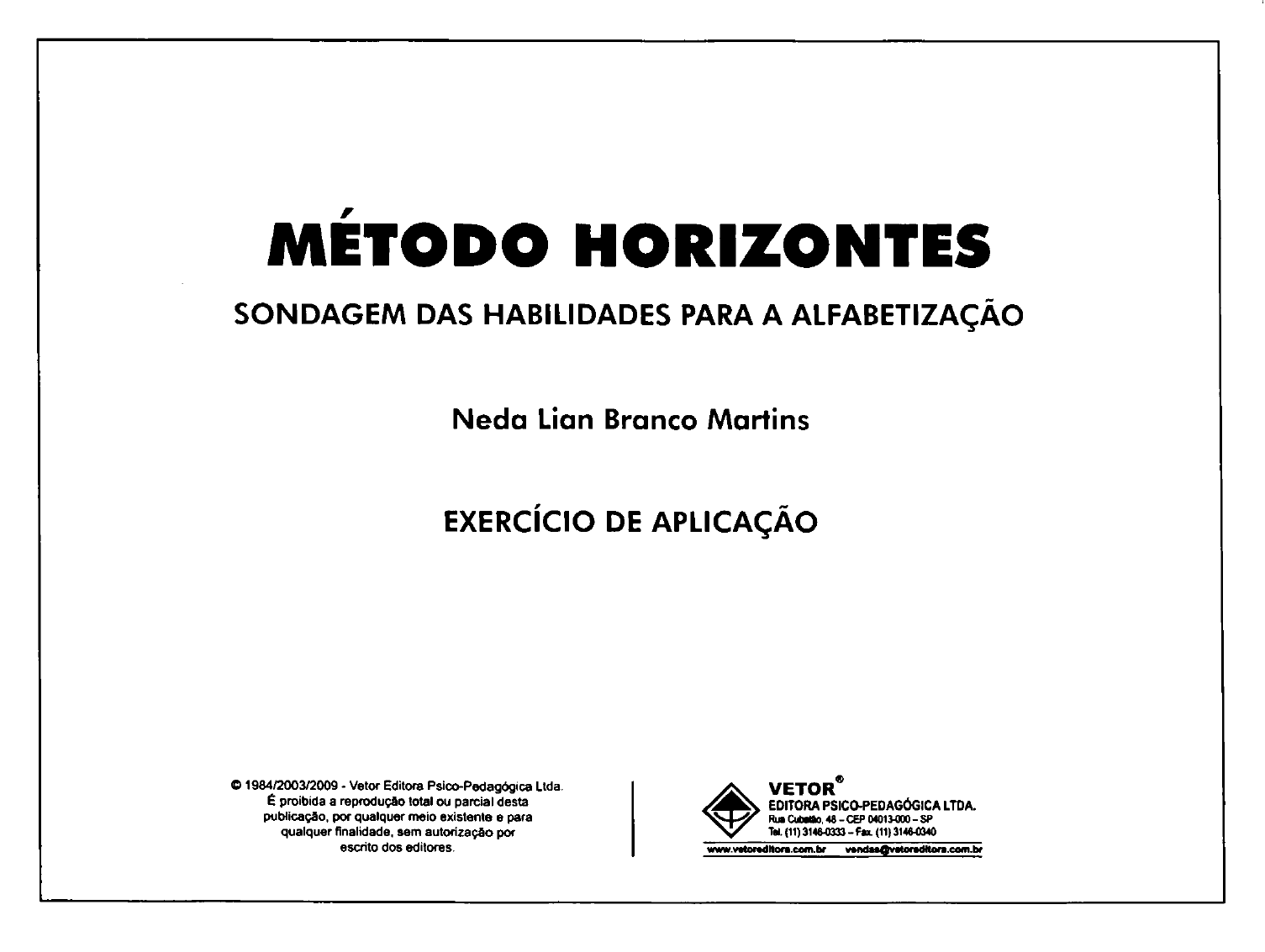 <p>MÉTODO HORIZONTES SONDAGEM DAS HABILIDADES PARA A ALFABETIZAÇÃO Neda Lian Branco Martins EXERCÍCIO DE APLICAÇÃO 1984/2003/2009 - Vetor Editora Psico-Pedagógica Ltda. VETOR® É proibida a reprodução total ou parcial desta EDITORA PSICO-PEDAGÓGICA LTDA. publicação, por qualquer meio existente e para 48 CEP 04013-000 SP qualquer finalidade, sem autorização por Tel. (11) 3146-0333 - Fax (11) 3146-0340 escrito dos editores.</p><p>MÉTODO HORIZONTES Neda Lian Branco Martins Nome: Idade: Sexo: M F Escolaridade: Local de nasc.: Data de aplic.: / / Data de nasc.: / / Escola: Classe: Instruções para aplicação a) Circundar com cores o número de pontos obtido pelo aluno em cada questão. b) Colocar abaixo de cada questão o seu total. c) número de aspas indica quantos itens devem ser avaliados.</p><p>A - MOTRICIDADE FINA 1) Encaixar peças: 5) Abotoa: - "com facilidade 6 - "com facilidade 6 - com dificuldade 3 - com dificuldade 3 - não consegue 0 - - não consegue 0 Total: Total: 2) Desencaixar peças: 6) - "com facilidade 6 - "um a um 6 - com dificuldade 3 - de uma vez 3 - não consegue 0 - não consegue 0 Total: Total: 3) Enfiar contas: 7) Vestir blusa: - "com precisão 6 - "com facilidade 6 - com dificuldade 4 - com dificuldade 3 - com movimento inverso 3 - não consegue 0 - algumas 2 Total: - não consegue 0 Total: 4) Desenfiar contas: 8) Despir blusa: - "uma a uma e guarda 6 - "com facilidade 6 - todas de uma vez e guarda 4 - com dificuldade 3 - uma a uma e deixa cair 2 - não consegue 0 - todas sem controle 0 Total: - Total:</p><p>9) Vestir 13) Amarrar: - "com facilidade 6 - "dá a laçada completa 6 - com dificuldade 3 - dá o primeiro nó 4 - não consegue 0 - tenta 2 Total: - não consegue nada 0 Total: 10) Despir calça: 14) Abrir e fechar a mão: - "com facilidade 6 - "com movimentos corretos 8 - com dificuldade 3 - com movimentos incorretos 4 - não consegue 0 - com movimentos lentos 4 Total: - "com movimentos rápidos 8 Total: 11) Calcar: 15) Pingar: - "com facilidade 6 - uma a uma 4 - com dificuldade 3 - tudo de uma vez 2 - - não consegue 0 Total: Total: 12) 16) Pinçar: - "desamarra 6 - "de um a um 6 - não desamarra 2 - vários de uma vez 4 - "com facilidade 6 - - deixa 0 - com dificuldade 4 - completa todo o movimento 6 - não consegue 0 Total: Total:</p><p>B - MOTRICIDADE GERAL 17) Andar na linha: 21) Saltar (do plinto): - "com firmeza 6 - não consegue - ziguezagueando 4 - "consegue 4 - desiquilibra-se 2 Total: - não consegue 0 Total: - 18) Andar de costas: 22) Saltitar: - "segue uma linha reta 6 - "acompanhando o ritmo 6 - perde a direção 4 - consegue sem ritmo 3 - consegue voltando a cabeça para trás 2 - não consegue 0 - não consegue 0 Total: - Total: - 19) Correr: 23) Marchar: - "com segurança 6 - "segue a cadência 6 - - cai 0 - não segue a cadência 2 - tropeça 3 - "com movimento correto 6 Total: - tenta acertar 4 - Total: 20) Saltar: (distância) 24) Girar: - "com segurança 6 - "faz o movimento completo 6 - cai 3 - não completa a volta 3 - não consegue 0 - desequilibra-se 0 Total: Total:</p><p>25) Pular (com os pés juntos): 28) Arremessar: - "com facilidade 6 - consegue 2 - com dificuldade 3 - não consegue 0 - não consegue 0 Total: - Total: - 26) Andar contornando objetos 29) Puxar corda: (ziguezagueando): - "segura com firmeza "com facilidade 6 (usando as duas mãos) 6 - esbarra 3 - segura com firmeza - pula obstáculos 2 (usando uma só) 3 - não consegue 0 - não tem firmeza Total: Total: - 27) Subir e descer espaldar: 30) Transporta objetos na linha: - "com facilidade 6 - copo com água: - com dificuldade 3 - "pela linha 2 - não consegue 0 - "pela água não derramada 2 Total: - na colher: - "pela linha 2 - "pela bola não derrubada 2 Total:</p><p>AVALIAÇÃO DA MOTRICIDADE FINA E GERAL Nome: Idade: Sexo: M F Escolaridade: Local de nasc.: Data de aplic.: / / Data de nasc.: / / Endereço: Telefone: Conceito N° de Valor Idade mental pontos numérico Hors 202 10 8 anos Observações: Concours 201 Excelente 9,5 7 anos 181 180 Ótimo 9 6 1/2 anos 161 160 Muito bom 8 6 anos 141 140 Bom 7 5 1/2 anos 121 120 Regular 6 5 anos 101 100 Fraco 5 4 1/2 anos 80 abaixo de Insuficiente 4 80 Número de pontos obtido pelo 2003/2009 - Vetor Editora Psico-Pedagógica Ltda. aluno EDITORA LTDA É proibida a reprodução total ou parcial desta publicação. 48 CEP 04013-000 SP (11) por qualquer meio existente e para qualquer sem autorização por escrito dos editores.</p><p>1. a) Faça uma cruz no lápis mais grosso. 1 2. a) Faça uma cruz no rolo de tecido largo. 1 1 b) Faça um círculo no lápis mais fino. 1 b) Faça um círculo no rolo de tecido estreito. 1 E X E R S 3. a) Faça uma cruz na mulher gorda. 1 4. a) Faça uma cruz na casinha mais alta. 1 1 b) Faça um círculo na casinha mais baixa. 1 b) Faça um círculo na mulher magra. G R S Total:</p><p>5. a) Faça uma cruz na menina que está atrás da casa. 1 6. a) Faça uma cruz no menino que está em cima 1 2 b) Faça um círculo na menina que está na frente 1 do trepa-trepa. da casa. b) Faça um círculo no menino que está embaixo 1 do trepa-trepa. 8 7. a) Faça um círculo nos patos que estão dentro da lagoa. 1 8. a) Faça uma cruz no animal que está à sua esquerda. 1 b) Faça uma cruz nos patos que estão fora da lagoa. 1 b) Faça um círculo no animal que está à sua direita. 1 Total:</p><p>3 Total:</p><p>4 11. a) Faça uma cruz na boneca maior. 1 12. a) Faça uma cruz no animal de rabo mais comprido. 1 1 1 b) Faça um risco no animal de rabo médio. b) Faça um na boneca nenor. 1 c) Faça um risco na boneca do meio. 1 c) Faça um círculo no animal de rabo curto. BABY Total:</p><p>5 13. a) Faça uma cruz na figura igual a que está em destaque. 1 b) Faça um círculo na figura diferente da que está em destaque. 1 Total:</p><p>6 menina Total: 2 dúvida trasado com</p><p>15. Pinte o elefante. 16. Complete o que falta em cada figura. 7 preenchimento - pressão do lápis 1 completament