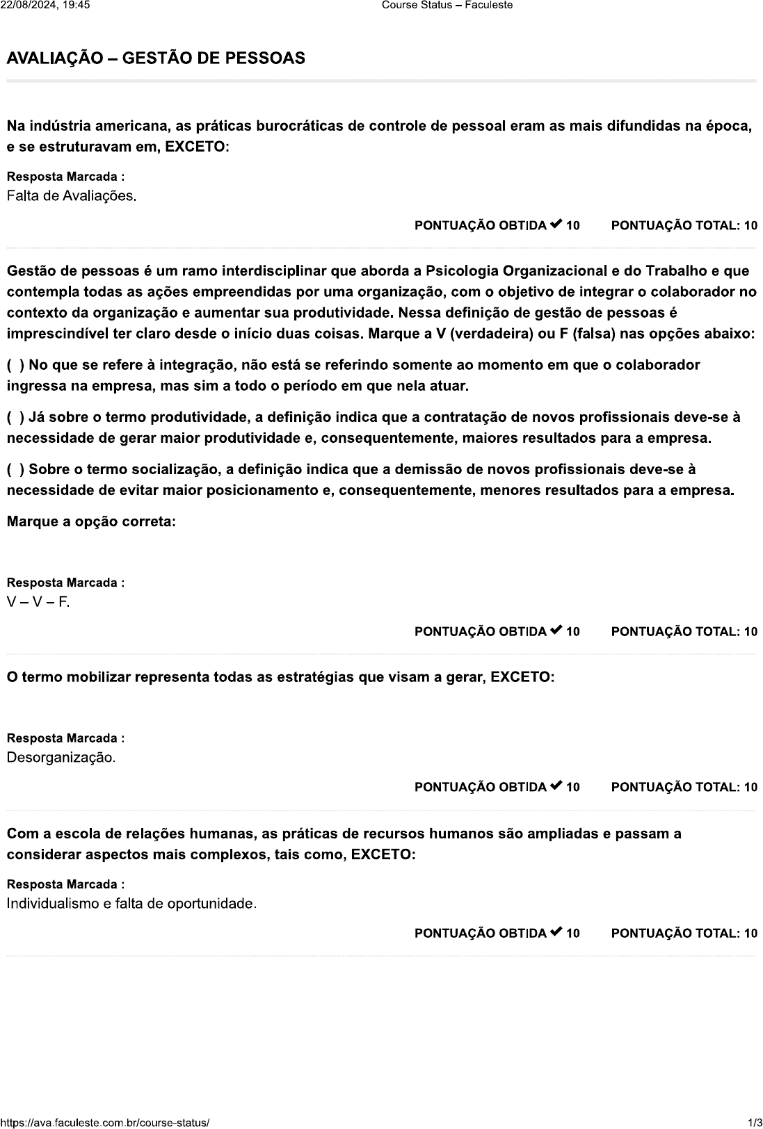 <p>22/08/2024, 19:45 Course Status - Faculeste AVALIAÇÃO - GESTÃO DE PESSOAS Na indústria americana, as práticas burocráticas de controle de pessoal eram as mais difundidas na época, e se estruturavam em, EXCETO: Resposta Marcada : Falta de Avaliações. PONTUAÇÃO OBTIDA 10 PONTUAÇÃO TOTAL: 10 Gestão de pessoas é um ramo interdisciplinar que aborda a Psicologia Organizacional e do Trabalho e que contempla todas as ações empreendidas por uma organização, com o objetivo de integrar o colaborador no contexto da organização e aumentar sua produtividade. Nessa definição de gestão de pessoas é imprescindível ter claro desde o início duas coisas. Marque a V (verdadeira) ou F (falsa) nas opções abaixo: ( ) No que se refere à integração, não está se referindo somente ao momento em que o colaborador ingressa na empresa, mas sim a todo o período em que nela atuar. ( ) Já sobre o termo produtividade, a definição indica que a contratação de novos profissionais deve-se à necessidade de gerar maior produtividade e, consequentemente, maiores resultados para a empresa. ( ) Sobre o termo socialização, a definição indica que a demissão de novos profissionais deve-se à necessidade de evitar maior posicionamento e, consequentemente, menores resultados para a empresa. Marque a opção correta: Resposta Marcada : V-V-F PONTUAÇÃO OBTIDA 10 PONTUAÇÃO TOTAL: 10 o termo mobilizar representa todas as estratégias que visam a gerar, EXCETO: Resposta Marcada : Desorganização. PONTUAÇÃO OBTIDA 10 PONTUAÇÃO TOTAL: 10 Com a escola de relações humanas, as práticas de recursos humanos são ampliadas e passam a considerar aspectos mais complexos, tais como, EXCETO: Resposta Marcada : Individualismo e falta de oportunidade. PONTUAÇÃO OBTIDA 10 PONTUAÇÃO TOTAL: 10 https://ava.faculeste.com.br/course-status/ 1/3</p><p>22/08/2024, 19:45 Course Status - Faculeste o processo de parceria, para ter êxito, requer dos parceiros alguns atributos básicos, tais como. Marque a V (verdadeira) ou F (falsa) nas opções abaixo: ( ) Confiança mútua. ( ) Insegurança. ( ) Transparência nas informações. ( ) Respeito. Marque a opção correta: Resposta Marcada : PONTUAÇÃO OBTIDA 10 PONTUAÇÃO TOTAL: 10 De acordo com Tonelli (2002), foram vários os fatores que contribuíram para essa evolução. Acompanhe a seguir tais fatores, EXCETO: Resposta Marcada : Forte desenvolvimento econômico e tecnológico. PONTUAÇÃO OBTIDA 0 PONTUAÇÃO TOTAL: 10 Pioneira da gestão de pessoal, também chamada de fase pré-histórica por alguns autores, caracterizava-se pela preocupação existente com os custos da organização. Os trabalhadores eram vistos exclusivamente sob o enfoque contábil: comprava-se a mão de obra e, portanto, as entradas e saídas provenientes dessa conta deveriam ser registradas contabilmente. Nesse período, é importante você considerar que aconteciam as seguintes situações em nosso país: I- No início do século XIX, cerca de 50% da população brasileira habitava o campo. II- Apesar da reduzida industrialização, esse período conheceu momentos de notável efervescência trabalhista, o que contribuiu para a presença significativa de trabalhadores europeus, dotados de elevado grau de conscientização política, que se instalaram sobretudo em São Paulo e em cidades do sul do País. III- Nas primeiras três décadas do século XX, costuma-se lembrar o significativo número de jornais operários que circularam em SP e RJ, bem como a eclosão de movimentos grevistas, que exigiam medidas de proteção ao trabalhador. Marque a alternativa correta: Resposta Marcada : Apenas e III. PONTUAÇÃO OBTIDA 10 PONTUAÇÃO TOTAL: 10 https://ava.faculeste.com.br/course-status/ 2/3</p><p>22/08/2024. 19:45 Course Status - Faculeste As pessoas dependem das organizações para alcançarem seus objetivos e, por sua vez, as organizações também precisam das pessoas para crescer e terem sucesso, numa espécie de dependência mútua. Há profissionais que buscam no ambiente organizacional: I- Realização pessoal. II- Oportunidades de crescimento. III- Melhores salários e benefícios. IV- Segurança no trabalho. Marque a opção correta: Resposta Marcada : Todas as opções estão corretas. PONTUAÇÃO OBTIDA 10 PONTUAÇÃO TOTAL: 10 Já a empresa, por meio de seus acionistas, proprietários, dirigentes, também possui determinados objetivos que são organizacionais. Tais objetivos podem ser, EXCETO: Resposta Marcada : Menor produtividade e lucratividade. PONTUAÇÃO OBTIDA 10 PONTUAÇÃO TOTAL: 10 As organizações vêm passando por grandes transformações em função de pressões que recebem tanto do contexto organizacional externo como do contexto interno. As mudanças pelas quais passam as organizações não estão limitadas às suas estruturas organizacionais formais, aos seus produtos ou serviços e seus mercados. Tais mudanças afetam, principalmente, seus padrões comportamentais ou culturais e seus padrões políticos ou relações internas e externas de poder. Com relação ao contexto externo, são destacados como pressões que impactam as organizações os seguintes aspectos, EXCETO: Resposta Marcada : Produtos e serviços de baixo valor agregado. PONTUAÇÃO OBTIDA 10 PONTUAÇÃO TOTAL: 10 Total 90 / 100 https://ava.faculeste.com.br/course-status/ 3/3</p>