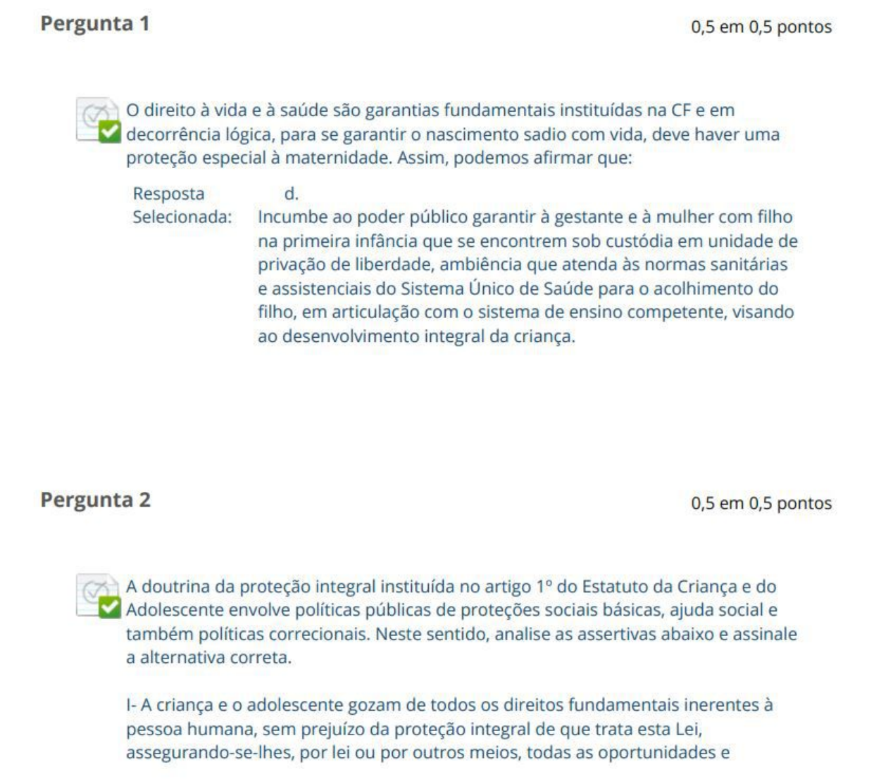 <p>Pergunta 1 0,5 em 0,5 pontos direito à vida e à saúde são garantias fundamentais instituídas na CF e em decorrência lógica, para se garantir nascimento sadio com vida, deve haver uma proteção especial à maternidade. Assim, podemos afirmar que: Resposta d. Selecionada: Incumbe ao poder público garantir à gestante e à mulher com filho na primeira infância que se encontrem sob custódia em unidade de privação de liberdade, ambiência que atenda às normas sanitárias e assistenciais do Sistema Único de Saúde para o acolhimento do filho, em articulação com o sistema de ensino competente, visando ao desenvolvimento integral da criança. Pergunta 2 0,5 em 0,5 pontos A doutrina da proteção integral instituída no artigo 1° do Estatuto da Criança e do Adolescente envolve políticas públicas de proteções sociais básicas, ajuda social e também políticas correcionais. Neste sentido, analise as assertivas abaixo e assinale a alternativa correta. A criança e adolescente gozam de todos os direitos fundamentais inerentes à pessoa humana, sem prejuízo da proteção integral de que trata esta Lei, assegurando-se-lhes, por lei ou por outros meios, todas as oportunidades e</p><p>facilidades, a fim de lhes facultar desenvolvimento físico, mental, moral, espiritual e social, em condições de liberdade e de dignidade. II- É dever da família, da comunidade, da sociedade em geral e do poder público assegurar, com absoluta prioridade, a efetivação dos direitos referentes à vida, à saúde, à alimentação, à educação, ao esporte, ao lazer, à profissionalização, à cultura, à dignidade, ao respeito, à liberdade e à convivência familiar e comunitária. III- Na interpretação desta Lei levar-se-ão em conta os fins sociais a que ela se dirige, as exigências do bem comum, os direitos e deveres individuais e coletivos, e a condição peculiar da criança e do adolescente como pessoas em desenvolvimento. Resposta Selecionada: d. Todas as assertivas estão corretas. Pergunta 3 0,5 em 0,5 pontos É direito da criança e do adolescente ser criado e educado no seio de sua família e, excepcionalmente, em família substituta, assegurada a convivência familiar e comunitária, em ambiente que garanta seu desenvolvimento integral. Com base no exposto, tratando-se de colocação de crianças e adolescentes em família substituta, assinale a alternativa correta: Resposta C. Selecionada: Tratando-se de maior de 12 anos de idade, será necessário seu consentimento, colhido em audiência.</p><p>Pergunta 4 0,5 em 0,5 pontos No tocante ao direito à educação, assinale a alternativa correta. Resposta e. Selecionada: É direito dos pais ou responsáveis ter ciência do processo pedagógico, bem como participar da definição das propostas educacionais. Pergunta 5 0,5 em 0,5 pontos Dentre as formas de colocação de criança e adolescente, podemos afirmar que:</p><p>Resposta C. Selecionada: A adoção é medida excepcional e dadas suas particularidades e tentativa de definitividade, é irrevogável. Pergunta 6 0,5 em 0,5 pontos No tocante à profissionalização e à proteção ao trabalho, analise as assertivas abaixo e assinale a alternativa correta. É proibido qualquer trabalho a menores de 18 anos, salvo na condição de aprendiz a partir de 14 anos. II- A CF autoriza expressamente qualquer trabalho a maiores de 16 anos. III- Menores de 14 anos podem exercer trabalho artístico, desde que autorizado por meio de alvará judicial pelo Juízo da Infância e Juventude. Resposta Selecionada: Somente a assertiva III está correta. C.</p><p>Pergunta 7 0 em 0,5 pontos No tocante à aprendizagem, assinale a alternativa correta. x Resposta C. Selecionada: A formação técnico-profissional faculta a frequência ao ensino regular. Pergunta 8 0,5 em 0,5 pontos É dever de todos velar pela dignidade da criança e do adolescente, pondo-os a salvo de qualquer tratamento desumano, violento, aterrorizante, vexatório ou constrangedor. Nesse contexto, a ação de natureza disciplinar ou punitiva aplicada com o uso da força física sobre a criança ou o adolescente que resulte em sofrimento físico ou lesão, é definida pelo ECA como: Resposta Selecionada: b. Castigo</p><p>Pergunta 9 0,5 em 0,5 pontos Quanto aos direitos fundamentais das crianças e adolescentes, previstos na Lei n. 8069/90 - Estatuto da Criança e do Adolescente (ECA), é correto afirmar que a criança e adolescente têm direito a, exceto: Resposta Selecionada: d. Prisão especial do Código de Processo Penal. Pergunta 10 0,5 em 0,5 pontos direito à educação se caracteriza como sendo um processo político, objetivando o pleno desenvolvimento da criança e do adolescente, seu preparo para o pleno exercício da cidadania, bem como o processo para sua qualificação para trabalho. Nesse sentido, com relação aos direitos à educação instituídos no Estatuto da Criança e do Adolescente, analise as assertivas e assinale a alternativa correta: Há o direito de ser respeitado por outras crianças em sua classe escolar. II- Há o direito de organização e participação em entidades estudantis. III- Há direito de contestar critérios avaliativos, podendo recorrer às instâncias escolares superiores. Resposta Selecionada: Estão corretas as assertivas e III.</p>