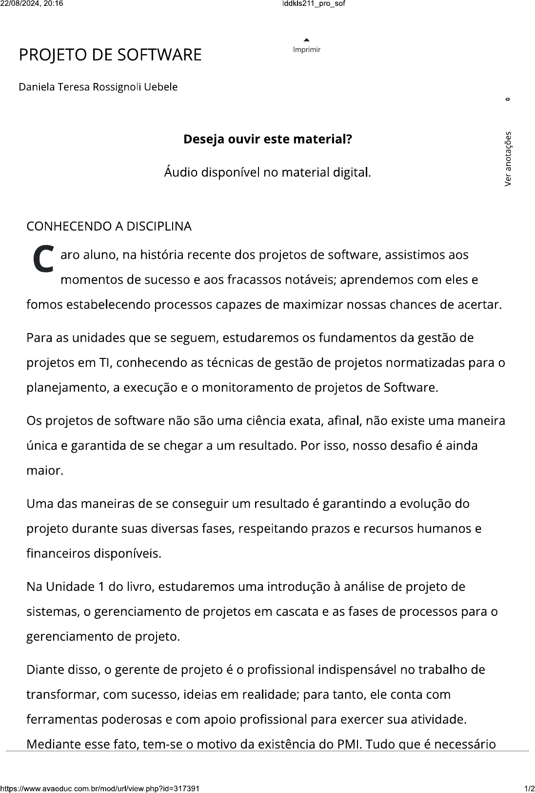 <p>22/08/2024, 20:16 PROJETO DE SOFTWARE Imprimir Daniela Teresa Rossignoli Uebele Deseja ouvir este material? Áudio disponível no material digital. CONHECENDO A DISCIPLINA aro aluno, na história recente dos projetos de software, assistimos aos momentos de sucesso e aos fracassos notáveis; aprendemos com eles e fomos estabelecendo processos capazes de maximizar nossas chances de acertar. Para as unidades que se seguem, estudaremos os fundamentos da gestão de projetos em TI, conhecendo as técnicas de gestão de projetos normatizadas para planejamento, a execução e monitoramento de projetos de Software. Os projetos de software não são uma ciência exata, afinal, não existe uma maneira única e garantida de se chegar a um resultado. Por isso, nosso desafio é ainda maior. Uma das maneiras de se conseguir um resultado é garantindo a evolução do projeto durante suas diversas fases, respeitando prazos e recursos humanos e financeiros disponíveis. Na Unidade 1 do livro, estudaremos uma introdução à análise de projeto de sistemas, o gerenciamento de projetos em cascata e as fases de processos para gerenciamento de projeto. Diante disso, o gerente de projeto é o profissional indispensável no trabalho de transformar, com sucesso, ideias em realidade; para tanto, ele conta com ferramentas poderosas e com apoio profissional para exercer sua atividade. Mediante esse fato, tem-se o motivo da existência do PMI. Tudo que é necessário 1/2</p><p>22/08/2024, 20:16 para realizar a gerência de um projeto, buscando resultados positivos, está no principal documento de referência do PMI, o PMBOK (Project Management Body of Knowledge). Em seguida, na Unidade 2, continuaremos falando dos gerenciamentos ágeis, das definições e dos valores ágeis, dos tipos de metodologia e empiricismo, bem como estudaremos o Scrum, abordando a técnica de Design Thinking em projetos de TI, o Minimum Viable Product (MVP) e os conceitos de pivotagem. Já na Unidade 3, prosseguiremos discutindo a respeito das gestões de risco e de qualidade, bem como das questões referentes à documentação. Finalizaremos, então, com a Unidade 4, tratando do modelo sequencial e ágil, verificando as diferenças e semelhanças na concepção e no desenvolvimento de projetos, conhecendo ferramentas viáveis tanto para a gestão do modelo ágil como sequencial e os seus respectivos ciclos de vida. E se tratando de ciclo de vida, você conhecerá importantes atividades da manutenção, do planejamento de releases e do pós- entrega. Os desafios de adquirir e dominar tanto conhecimento são realmente vastos, mas, com certeza, a prática lhe oferecerá todo o conhecimento que precisa para evoluir e ter sucesso profissional. PERSISTA! 2/2</p>