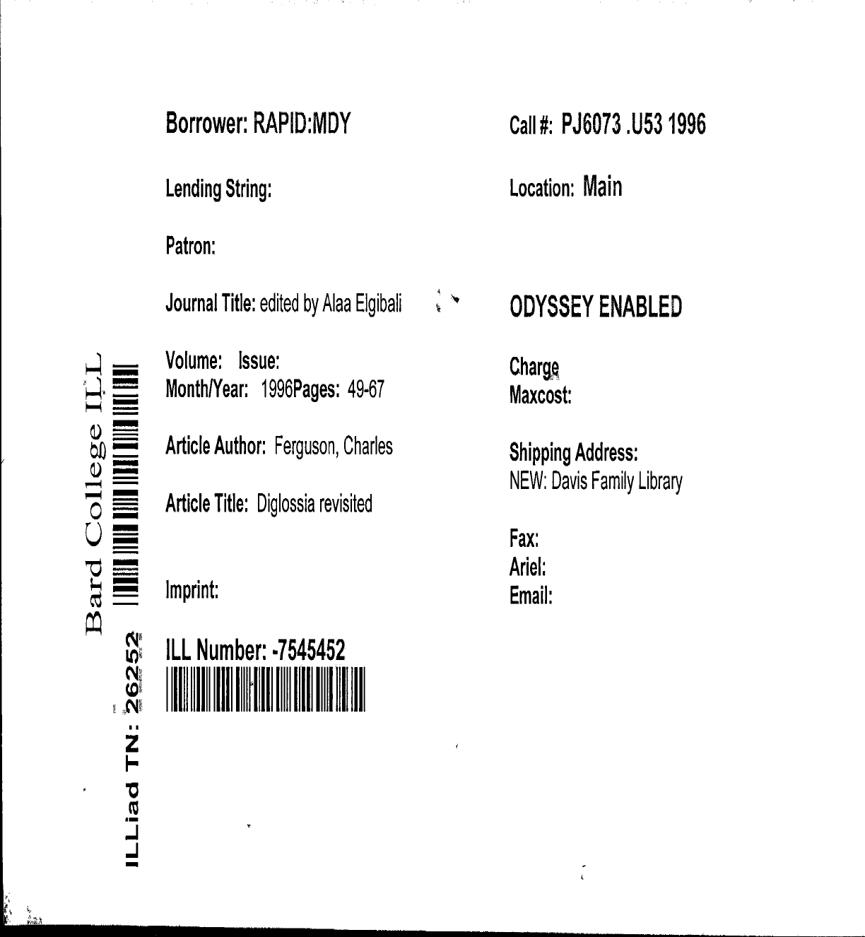 <p>Borrower: RAPID:MDY Call #: PJ6073 U53 1996 Lending String: Location: Main Patron: Journal Title: edited by Alaa Elgibali ODYSSEY ENABLED Volume: Issue: Charge Month/Year: 1996Pages: 49-67 Maxcost: Article Author: Ferguson, Charles Shipping Address: NEW: Davis Family Library Article Title: Diglossia revisited Fax: Ariel: Imprint: Email: ILL Number: -7545452</p><p>3 EPILOGUE: DIGLOSSIA REVISITED Charles A. Ferguson* 1. In 1959 I published an article called "Diglossia" in the journal Word in which I tried to characterize a certain type of language situation. Since that time hundreds of articles and a score of books have been published on the topic of diglossia, most of them referring directly to the 1959 pa- per, which itself has been reprinted in various anthologies and translated into a number of languages. And the production of diglossia articles shows no sign of slowing down (examples of recent ones: Berger 1990; Khubchandani 1989; Kremnitz 1987). An author may feel a certain amount of gratification when a piece of writing is widely read and cited and seems to have contributed to a field of inquiry. The gratification may, however, be mixed with other feelings when the author finds that his message is often misunderstood, his terminology is extended in direc- tions he does not always approve, and-most of all-he finds weaknesses in his own original conceptualization and presentation. On several occasions between 1980 and 1990, I have been able to air some of these authorial feelings by being invited to speak on 'diglossia revisited, 2 and this volume gives me a chance to put some of these feelings in print. For my contribution to the volume, I want first to indicate briefly what I believe I was trying to do in that 1959 article, then note several issues that were neglected or mishandled in that article- points sometimes realized on my own, sometimes painfully called to my attention by critics-and finally to point out directions I would hope to see future research take to strengthen and establish this whole field of inquiry. 49</p><p>50 Charles A. Ferguson DIGLOSSIA REVISITED 51 2. Original Intention Swiss French, like any language, has register variations: it is possible to What was I trying to do? I wanted to characterize a particular kind of lan- do sports announcing in this French as well as to write chemical ab- guage situation, taking a clear case that was relatively easy and uncontro- stracts. versial to characterize. However, the idea of doing that was to make the Italian is the third largest language in Switzerland. People speak a kind clear case just one slot in a taxonomy of some sort. I hoped other people of local Swiss Italian, Ticinese, which varies from village to village, would write articles on other clear cases in order to develop a fairly elabo- with, however, sufficient commonality so that it can be readily under- rate taxonomy of language situations. Ultimately, that taxonomy would stood throughout the entire area of Italian-speaking Switzerland. But there be replaced by some set of principles or frame of reference in terms of is another variety of the language, sometimes called Friulian, a variety of which this kind of thinking about language and this kind of research north Italian used for a range of circumstances, and of course there is should be done. My goals, in ascending order, were: clear case, taxon- school Italian, the language of books, newspapers, broadcasting, and edu- omy, principles, theory. cated speech. These variations exist on top of and alongside one another, I felt it was reasonable to start by describing a clear case. Languages and but not layered the way the German dialects are and of considerably more linguistic communities come in many forms. A language may be rela- variety than the French situation. tively homogeneous or dialectally highly diverse; its users may be nonlit- Finally, there is Romansch, the fourth national language of Switzer- erate, literate, literate in a divergent, specialized variety of the language or land. It has no standard variety, though it is written and is used as a in another language altogether. A linguistic community may be essen- medium of instruction for reading and writing in the early grades of tially monolingual or pervasively multilingual; a bilingual community school. It is written in four different spelling systems, because it is used may delimit its use of the respective languages by social strata, ethnic in four different dialect areas; no one of them is supreme, and there is no groups, communicative functions, or a combination of these. And so on. sign that any one of them will emerge as standard. All these differences, it may reasonably be assumed, will be reflected to These are four different situations in a nation that has faced language some degree in details of linguistic structure and in the paths of language variation for centuries without the emergence of any striking similarity or change. Out of this welter of possibilities I wanted to pick a type that was parallelism of patterns of use across the languages. That is the kind of dif- clearly identifiable, but not unique, i.e. that had many examples around ference in language situations in which I was interested, and which the world. seemed to have implications for the writing of grammars and for theories For those linguists who do not give much thought to the diversity of of language and language Though there could be an indefinitely forms of language and linguistic community, a convenient example is large number of different language situations, I felt that if we looked at Switzerland, a nation with four languages and four different linguistic sit- the language situations of the world, there would be a limited number of First, there is German-speaking Switzerland. It has very diver- identifiable major types. Of course individual instances of a type would gent dialect variation from one canton to the next; there is some indica- differ in detai