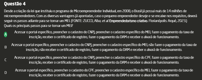 <p>Questão 4 Desde a criação da lei que instituiu programa de Microempreendedor Individual, em 2008, Brasil já possui mais de 14 milhões de microempreendedores. Com as diversas vantagens já apontadas, caso pequeno empreendedor deseje e se encaixe nos requisitos, deverá seguir passos adiante para se tornar um MEI. (FONTE: ZUCCO, Alba: et al Empreendedorismo criativo. Florianópolis: 2023.) Quais principais passos para se um MEI? Acessar portal específico, preencher cadastro do CNPJ, preencher cadastro específico do MEI, fazer pagamento da taxa de inscrição, receber certificado de registro, fazer pagamento da DAM e receber alvará de funcionamento. Acessar portal específico, preencher cadastro do CNPJ, preencher cadastro específico do MEI, não fazer pagamento da taxa de B inscrição, não receber certificado de registro, fazer pagamento da DAM e receber alvará de funcionamento. Acessar portal específico, preencher cadastro do CNPI, preencher cadastro específico do CPF, fazer pagamento da taxa de inscrição, receber certificado de registro, fazer pagamento da DAM e receber alvará de funcionamento. Acessar portal específico, preencher cadastro do CPF, preencher cadastro específico do MEI, fazer pagamento da taxa de D inscrição, receber certificado de registro, fazer 0 pagamento da DAM e receber alvará de</p>