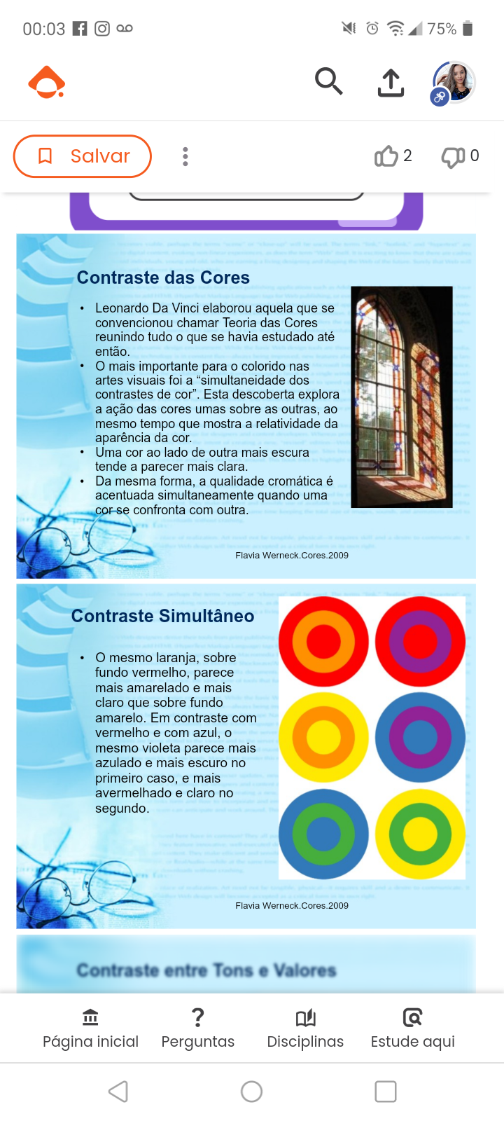 <p>00:03 f 75% Salvar 2 0 Contraste das Cores Leonardo Da Vinci elaborou aquela que se convencionou chamar Teoria das Cores reunindo tudo o que se havia estudado até então. o mais importante para o colorido nas artes visuais foi a "simultaneidade dos contrastes de Esta descoberta explora a ação das cores umas sobre as outras, ao mesmo tempo que mostra a relatividade da aparência da cor. Uma con ao lado de outra mais escura tende a parecer mais clara. Da mesma forma, a qualidade cromática é acentuada simultaneamente quando uma confronta com outra. Flavia Contraste Simultâneo o mesmo laranja, sobre fundo vermelho, parece mais amarelado e mais claro que sobre fundo Em contraste com vermelho e com o mesmo violeta parece mais azulado e mais escuro no primeiro caso, e mais avermelhado e claro no segundo. Flavia Werneck.Cores.2009 Contraste entre Tons Valores ? Q Página inicial Perguntas Disciplinas Estude aqui</p>