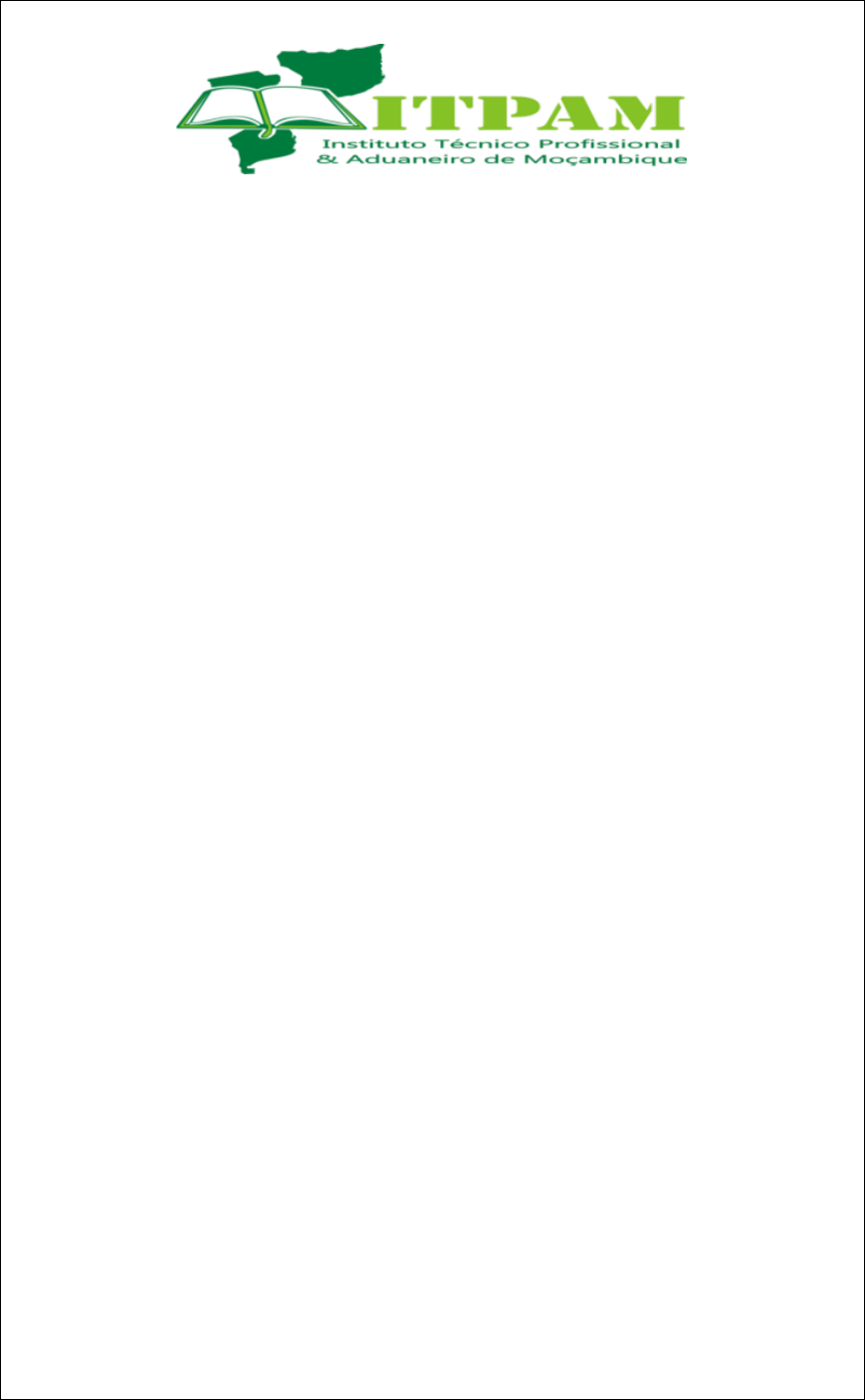 <p>Instituto Técnico Profissional & Aduaneiro de Moçambique</p><p>Curso de Gestão Aduaneira</p><p>Relatório de Estágio Profissional</p><p>Nampula</p><p>2024</p><p>Instituto Técnico Profissional e Aduaneiro de Moçambique</p><p>Estudante:</p><p>Sérgio da Felecidade Germano Alfenete</p><p>Relatório de Estágio Profissional</p><p>Nampula</p><p>2024</p><p>Relatorio de Estagio Profissional que</p><p>culmina com o fim do curso e para</p><p>obtenção do Grau de Técnico</p><p>Adunaeiro a ser entregue e apresentado</p><p>no Instituto Técnico Profissional e</p><p>Aduaneiro de Moçambique</p><p>Índice</p><p>Declaração ....................................................................................................................... iv</p><p>Dedicatória........................................................................................................................ v</p><p>Agradecimentos ............................................................................................................... vi</p><p>Lista de abreveiaturas ..................................................................................................... vii</p><p>Capitulo I. Introdução ....................................................................................................... 8</p><p>1.1. Objectivos .................................................................................................................. 8</p><p>1.1.1. Objectivos Gerais ................................................................................................... 8</p><p>1.1.2. Objectivos Específico ............................................................................................. 8</p><p>1.1.3. Metodologias .......................................................................................................... 8</p><p>1.1.4. Hipóteses ................................................................................................................ 8</p><p>Capitulo II: Descricação da Instituição de Estágio ........................................................... 9</p><p>2.1. Localização Geográfica ............................................................................................. 9</p><p>2.2. Historial da Patida Paulino Timana ........................................................................... 9</p><p>2.3. Política Empresarial ................................................................................................... 9</p><p>2.4. Características da Empresa ...................................................................................... 10</p><p>2.5. Características do Sector Técnico ........................................................................... 11</p><p>2.6. Técnico do Sector de Despacho de Mercadoria ...................................................... 11</p><p>2.8. Material Didáctico nas actividades do Sector de Despacho de Mercadoria ............ 11</p><p>2.9. Gestão de espaço, e do tempo no Sector do Despacho de Mercadoria ................... 11</p><p>2.10. Metodologia de Trabalho no Sector Técnico Aduaneiro....................................... 12</p><p>2.11. Actividades Realizadas Pelo Estagiario ................................................................ 12</p><p>3. Importação .................................................................................................................. 15</p><p>3.3. Actividades realizadas na área Operacional Importação ......................................... 17</p><p>3.4. Exportação ............................................................................................................... 19</p><p>3.5. Documentos que acompanham o processo de exportação ...................................... 19</p><p>3.6. Terminal Especial de Exportação de Nacala ........................................................... 20</p><p>4. Sucessos Obtidos durante o Estagio ........................................................................... 21</p><p>4.1. Dificuldades ............................................................................................................. 21</p><p>5. Conclusão ................................................................................................................... 22</p><p>6. Referências Bibliográficas .......................................................................................... 23</p><p>iv</p><p>Declaração</p><p>Eu, Sérgio da Felecidade Germano Alfenete que este relatório é o resultado do meu</p><p>próprio trabalho e está ser submetida para a obtenção do grau de técnico médio no</p><p>Instituto Técnico Profissional e Aduaneiro de Moçambique, foi submetido antes para</p><p>obtenção de nenhum grau ou para avaliação em nenhum instituto.</p><p>v</p><p>Dedicatória</p><p>Dedico, a minha família em especial a minha mãe e ao meu pai pela inspiração e</p><p>motivação que me foi dada de forma directa e indirecta e aos meus companheiros do dia-</p><p>a-dia e dos meus colegas de turma e aos formadores que sempre se fizeram presente nos</p><p>momentos de muita dúvida e ansiedade, dizer que sem todos esses elementos combinados</p><p>eu não teria a noção e a capacidade que tenho agora, palavras não chegam para descrever</p><p>o quão só grato pelas experiências de vida que junto tive das pessoas incríveis que</p><p>estiveram ao meu lado sempre que precisei, dedico este trabalho a todos que fizeram parte</p><p>dessa longa jornada.</p><p>vi</p><p>Agradecimentos</p><p>Depois de tanto desafio em primeiro lugar agradecer a Deus. Agradecer a todos que</p><p>directa ou indirectamente ajudaram me durante a formação, desde o Instituto até ao</p><p>estagio pré-profissional. Agradecer a meus Formadores (Jaime Mineses, Artur</p><p>Vilanculo,, Jackson Gil, Erasmo Nacuto, João Barata) e a minha Familia (Jacinta Sousa</p><p>Inácio, Nelson Januário Alson da Pena e minha mãe Felecidade Januário da Pena) p