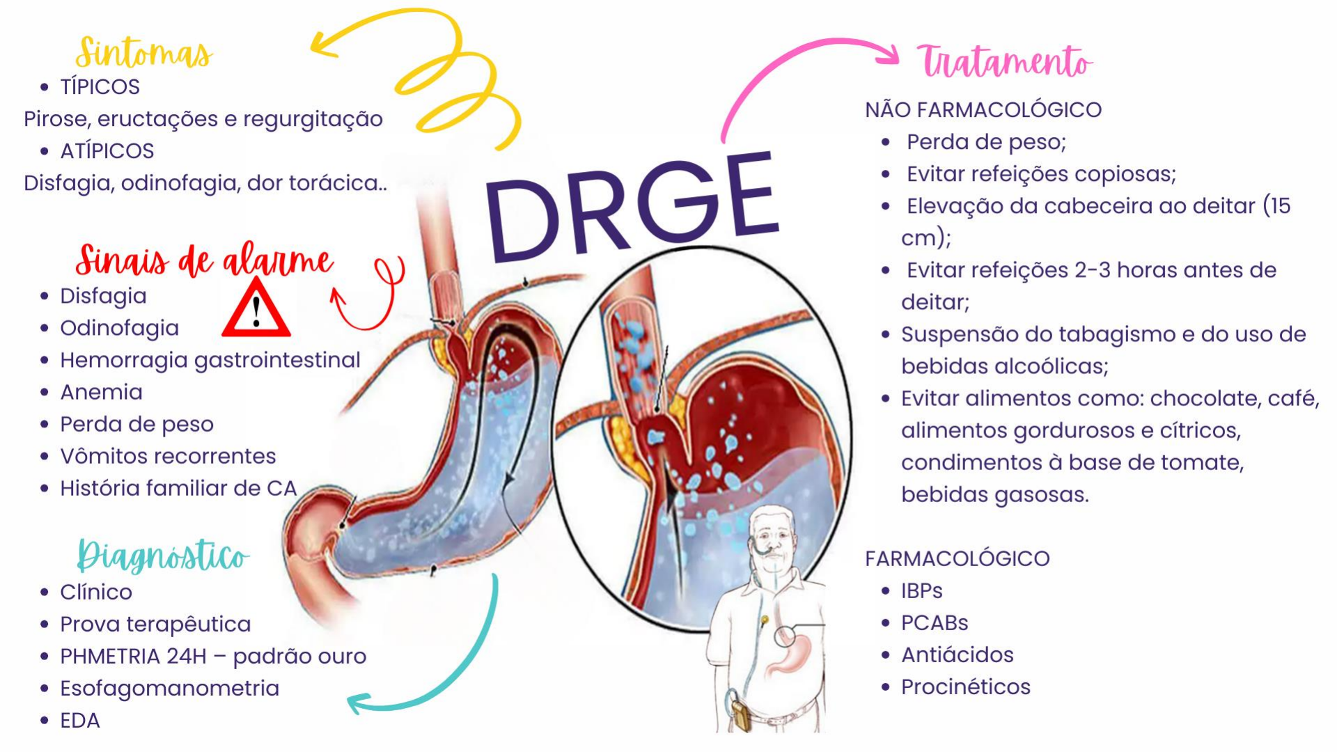 <p>HAM 4</p><p>HAM 4</p><p>HAM 4</p><p>HAM 4</p><p>A: uma ou mais erosões até 5mm.</p><p>B: uma ou mais erosões >5mm em sua</p><p>maior extensão, não contínuas entre os</p><p>ápices de duas pregas esofágicas.</p><p>C: Erosões contínuas (ou convergentes) entre</p><p>os ápices de pelo menos duas pregas,</p><p>envolvendo menos que 75% do órgão).</p><p>D: Erosões ocupando pelo menos 75%</p><p>da circunferência do órgão.</p><p>DRGE - CLASSIFICAÇÃO DE LOS ANGELES (EDA)</p><p>HAM 4</p><p>HAM 4</p><p>HAM 4</p><p>HAM 4</p><p>1. PORTO, Celmo Celeno. Exame Clínico. 8.ed. Guanabara Koogan, 2019, PARTE 11, Seção 2; Sistema digestório</p><p>– Esôfago</p><p>2. Drossman DA. Functional gastrointestinal disorders: history, pathophysiology, clinical features and Rome IV.</p><p>Gastroenterology. 2016; 50(6):1262-1279.</p><p>3. Aziz Q, Fass R, Gyawali P, et al. Esophagel disorders. A2. Functional Heartburn. Gastroenterol. 2016;150:1368-</p><p>1379.</p><p>4. Coelho LGV, Marinho JR, Genta R, et al. IV Brazilian consensus conference on Helicobacter pylori infection. Arq</p><p>Gastroenterol. 2018; 55(2):97-121.</p><p>5. Kahrilas PJ, Shaheen NJ, Vaezi MF, American Gastroenterological Association Institute; ClinicalPractice and</p><p>Quality Management Committee. American Gastroenterological Association Institutetechnical review on the</p><p>management of gastroesophageal reflux disease. Gastroenterology 2008;135:1392-3.</p><p>6. Brazilian clinical guideline for the therapeutic management of Gastroesophageal Reflux Disease (Brazilian</p><p>Federation of Gastroenterology, FBG) Joaquim Prado P MORAES-FILHO1 , Gerson DOMINGUES2*, Decio</p><p>CHINZON1 and Brazilian GERD Counselors* Arq Gastroenterol • 2024. v. 61:e23154</p><p>7. British Society of Gastroenterology guidelines on the management of functional dyspepsia Christopher J Black</p><p>,1,2 Peter A Paine,3,4 Anurag Agrawal,5 Imran Aziz ,6,7 Maria P Eugenicos,8 Lesley A Houghton ,2 Pali</p><p>Hungin,9 Ross Overshott,10 Dipesh H Vasant,3,11 Sheryl Rudd,12,13 Richard C Winning,12,13 Maura</p><p>Corsetti,12,13 Alexander C Ford 1,2Black CJ, et al. Gut 2022;0:1–27. doi:10.1136/gutjnl-2022-327737</p><p>BIBLIOGRAFIA</p><p>Slide 1</p><p>Slide 2</p><p>Slide 3</p><p>Slide 4</p><p>Slide 5</p>