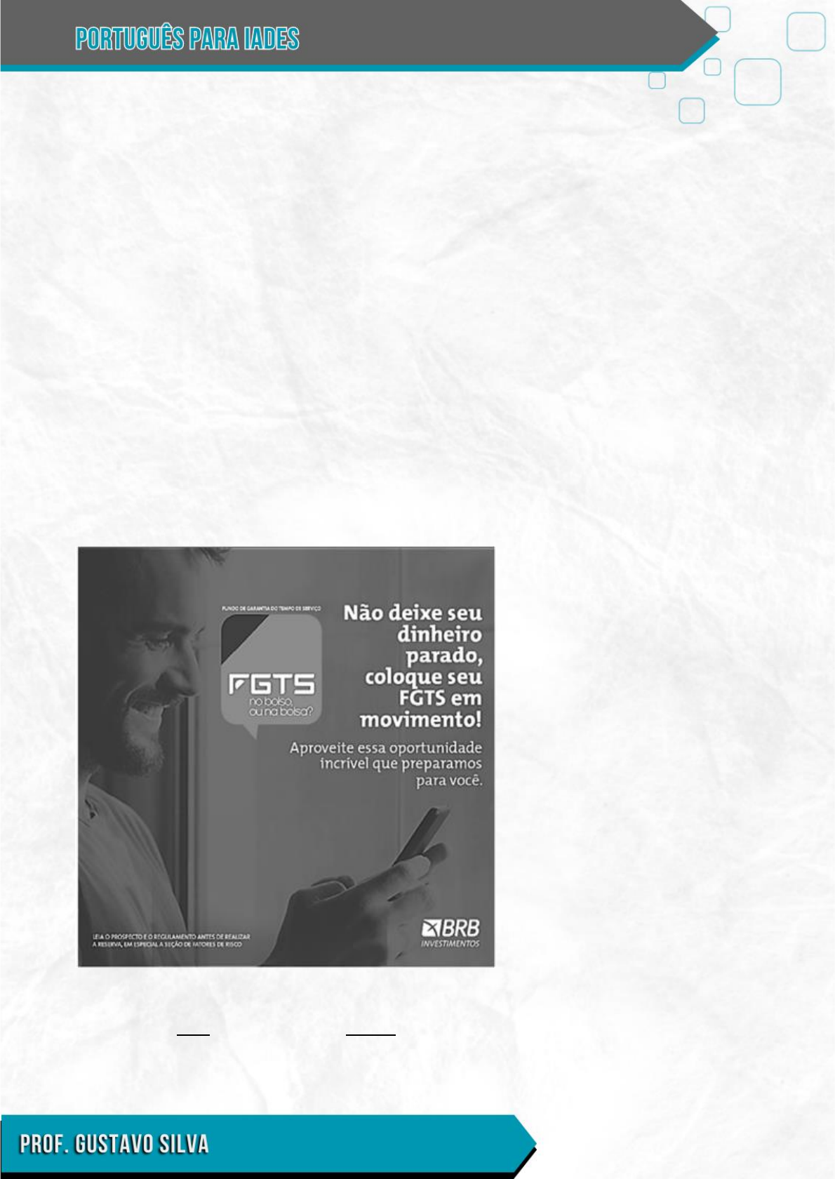 <p>BANCO DE Questão 1 - BRASÍLIA - IADES – 2022</p><p>“No mundo moderno, quase tudo tem um preço. Se você quer, por exemplo, um chocolate, deve pagar o</p><p>valor que o vendedor pede. A mesma coisa acontece com os outros alimentos que você come, com a roupa</p><p>que você usa, com a luz que ilumina a sua casa à noite, com a água que você usa para tomar banho e com o</p><p>telefone que você usa para conversar com seus amigos. Como você pode ver, cada coisa tem um preço que</p><p>se mede com dinheiro. E sendo o preço uma medida comum, expressa por cédulas e moedas, pode-se</p><p>comparar o valor dos diferentes bens e serviços.”</p><p>BANCO CENTRAL DO BRASIL. O que é o dinheiro?</p><p>Brasília: Banco Central do Brasil, 2002, p. 18.</p><p>Com base nas informações do texto, assinale a alternativa correta.</p><p>A) O texto se refere à importância do preço e a sua qualidade de medida comum para a comparação de valor</p><p>de diferentes bens e serviços.</p><p>B) O texto remete especificamente à ideia do preço referido em mercadorias e em bens de consumo.</p><p>C) O texto se refere à atemporalidade e à universalidade do preço como categoria de comparação financeira.</p><p>D) A falta de exemplos no texto limita seu alcance didático e informativo.</p><p>E) O texto se dirige, a partir dos pronomes empregados, a um coletivo de possíveis leitores.</p><p>Questão 2 - BANCO DE BRASÍLIA - IADES - 2022</p><p>Imagem para responder à questão.</p><p>Disponível em: <https://www.instagram.com/p/CeeAkqzsCMy/>. Acesso em: 15 out. 2022.</p><p>No trecho “Não deixe seu dinheiro parado, coloque seu FGTS em movimento!”, as palavras sublinhadas</p><p>correspondem ao modo</p><p>A) indicativo.</p><p>B) imperativo.</p><p>C) subjuntivo.</p><p>D) optativo.</p><p>E) infinitivo.</p><p>Questão 3 - BANCO DE BRASÍLIA - IADES - 2022</p><p>Imagem para responder à questão.</p><p>Disponível em: <https://www.instagram.com/p/CeeAkqzsCMy/>. Acesso em: 15 out. 2022.</p><p>Em “Aproveite essa oportunidade incrível que preparamos para você”, a palavra sublinhada pode ser</p><p>substituída, sem que se altere o sentido original da frase, por</p><p>A) genial.</p><p>B) inédita.</p><p>C) terrível.</p><p>D) inacreditável.</p><p>E) admirável.</p><p>Questão 4 - BANCO DE BRASÍLIA - IADES - 2022</p><p>Imagem para responder à questão.</p><p>Disponível em: <https://www.instagram.com/p/CeeAkqzsCMy/>. Acesso em: 15 out. 2022.</p><p>De acordo com as informações da imagem, assinale a alternativa correta.</p><p>A) A frase “FGTS no bolso, ou na bolsa?”, pela proximidade fônica das palavras, reforça uma reflexão que</p><p>pode fazer com que o cliente dos serviços do BRB Investimentos aporte o próprio dinheiro, não o deixando</p><p>parado.</p><p>B) As formas verbais mobilizadas na publicidade do BRB Investimentos não incentivam o possível cliente a se</p><p>indagar acerca de alternativas de investimento.</p><p>C) Essa peça publicitária desobedece ao requisito da objetividade, caro à publicidade, uma vez que há</p><p>excesso de texto grafado.</p><p>D) A referida peça publicitária dissuade o cliente de ler o regulamento formulado pelo BRB Investimentos.</p><p>E) O uso da forma verbal “preparamos” não sugere a ideia de coletivo.</p><p>Questão 5 - BANCO DE BRASÍLIA - IADES- 2022</p><p>Texto 1 para responder à questão.</p><p>Disponível em: <https://novo.brb.com.br/sobre-o-brb/>. Acesso em: 15 out. 2022.</p><p>Quanto aos aspectos de função da linguagem, assinale a alternativa correta.</p><p>A) O texto elucida, dirigindo-se a potenciais clientes, o histórico de surgimento e de desenvolvimento do</p><p>BRB. Nele, predomina a função apelativa da linguagem.</p><p>B) As informações apresentadas no texto por meio de números e de estatísticas não servem ao propósito de</p><p>contextualização da história do BRB, apesar do predomínio da função referencial da linguagem.</p><p>C) O texto explica o histórico de surgimento do BRB, contextualizando a criação, a atuação e a estrutura.</p><p>Nele, predomina a função referencial da linguagem.</p><p>D) A informação no texto acerca da mudança de nome do banco é um aspecto típico da função da linguagem</p><p>denominada metalinguística.</p><p>E) O texto explica o histórico de surgimento do BRB, contextualizando a criação, a atuação e a estrutura.</p><p>Nele, predomina a função apelativa da linguagem.</p><p>Questão 6 - CONSELHO DE ARQUITETURA E URBANISMO DO MATO GROSSO DO SUL – IADES - 2021</p><p>Ocupação urbana e degradação ambiental em Campo Grande/MS</p><p>Disponível em: <https://repositorio.ufsc.br/handle/>.Acesso em: 29 ago. 2021, com adaptações.</p><p>Com base na leitura compreensiva do texto, é correto afirmar que o autor</p><p>A) considera que a forma moderna como Campo Grande foi pensada e projetada evitou os impactos</p><p>negativos da modernidade.</p><p>B) apresenta contradição entre o fato de a cidade ter sido projetada para ser moderna e o seu crescimento</p><p>desordenado.</p><p>C) discorda de que o progresso deva considerar mais questões relativas às bases naturais da cidade e menos</p><p>as relacionadas à economia.</p><p>D) dirige-se especificamente aos profissionais de arquitetura e urbanismo.</p><p>E) propõe medidas benéficas em contraposição aos impactos negativos que afetam toda a população e as</p><p>riquezas naturais de Campo Grande.</p><p>Questão 7 - CONSELHO DE ARQUITETURA E URBANISMO DO MATO GROSSO DO SUL – IADES - 2021</p><p>O Mato Grosso do Sul e sua arquitetura</p><p>Disponível em: <https://revistacontinente.com.br/edicoes>.Acesso em: 27 ago. 2021, com adaptações.</p><p>Em “Foram, entretanto, os ciclos do gado e da ferrovia Noroeste do Brasil que trouxeram o desenvolvimento</p><p>e a integração para Mato Grosso do Sul (MS).” (linhas de 13 a 16), “entretanto” poderia ser substituído, sem</p><p>que isso acarretasse incorreção gramat