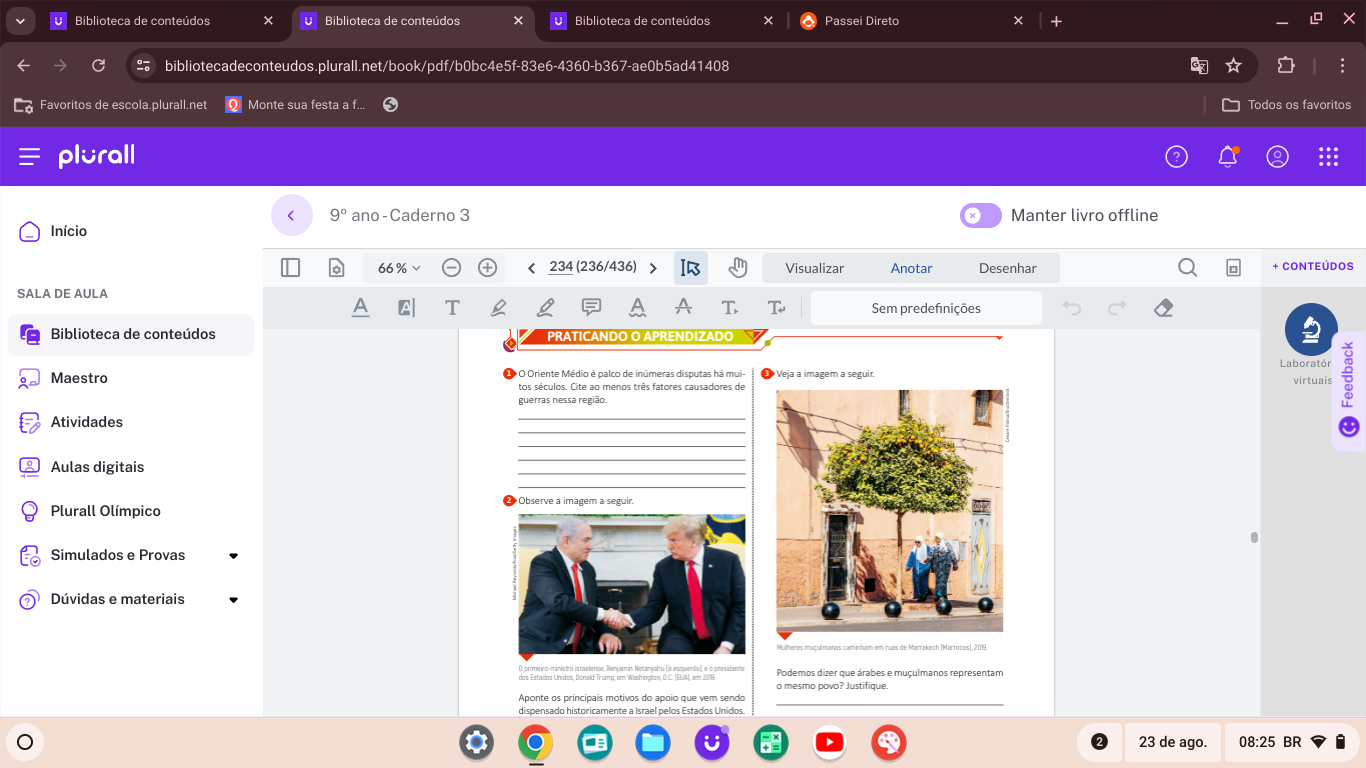 <p>Biblioteca de conteúdos x U Biblioteca de conteúdos x U Biblioteca de conteúdos Passei Direto + - C bibliotecadeconteudos.plurall.net/book/pdf/b0bc4e5f-83e6-4360-b367-ae0b5ad41408 Favoritos de escola plurall.net Monte sua festa a f.. Todos os favoritos plurall < 9° ano-Caderno 3 Manter livro offline Início 66% + < 234 (236/436) > Visualizar Anotar Q SALA DE AULA A A T A A T Sem predefinições Biblioteca de conteúdos PRATICANDO o APRENDIZADO Laborator Maestro Oriente Médio é palco de disputas mui Veja imagem seguir. virtuais tos Cite ao menos três fatores de guerras nessa região. Atividades Aulas digitais 2 Observe imagem seguir. Plurall Olímpico Simulados e Provas Dúvidas e materiais Mulheres - Marrakech 0 primeiro-ministro israelense Benjamin Netanyahu la presidente dos Estados Unidos Donald Trump em Podemos dizer que árabes e muculmanos representam mesmo povo? Aponte os principais motivos do apoio que vem sendo dispensado historicamente a Israel pelos Estados Unidos 2 23 de ago. 08:25 BR</p>