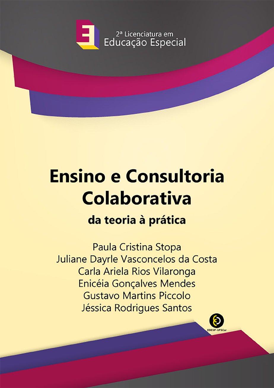 <p>ENSINO E CONSULTORIA</p><p>COLABORATIVA:</p><p>da teoria à prática</p><p>UFSCar – Universidade Federal de São Carlos</p><p>Reitora</p><p>Profa. Dra. Ana Beatriz de Oliveira</p><p>Vice-Reitora</p><p>Maria de Jesus Dutra dos Reis</p><p>EDESP - Editora da Educação Especial e Acessibilidade da UFSCar</p><p>Diretor</p><p>Nassim Chamel Elias</p><p>Editores executivos</p><p>Adriana Garcia Gonçalves</p><p>Clarissa Bengtson</p><p>Douglas Pino</p><p>Rosimeire Maria Orlando</p><p>Conselho editorial</p><p>Adriana Garcia Gonçalves</p><p>Carolina Severino Lopes da Costa</p><p>Clarissa Bengtson</p><p>Gerusa Ferreira Lourenço</p><p>Juliane Ap. de Paula Perez Campos</p><p>Marcia Duarte Galvani</p><p>Mariana Cristina Pedrino</p><p>Nassim Chamel Elias (Presidente)</p><p>Rosimeire Maria Orlando</p><p>Vanessa Cristina Paulino</p><p>Vanessa Regina de Oliveira Martins</p><p>CAPES - Coordenação de Aperfeiçoamento de Pessoal de Nível Superior</p><p>Universidade Aberta do Brasil</p><p>Coleção: Segunda Licenciatura em Educação Especial</p><p>Coordenação: Rosimeire Maria Orlando</p><p>ENSINO E CONSULTORIA</p><p>COLABORATIVA:</p><p>da teoria à prática</p><p>Paula Cristina Stopa</p><p>Juliane Dayrle Vasconcelos da Costa</p><p>Carla Ariela Rios Vilaronga</p><p>Enicéia Gonçalves Mendes</p><p>Gustavo Martins Piccolo</p><p>Jéssica Rodrigues Santos</p><p>São Carlos, 2021</p><p>© 2021, dos autores</p><p>Projeto gráfico e capa</p><p>Clarissa Bengtson</p><p>Bruno Prado Santos</p><p>Preparação e revisão de texto</p><p>Paula Sayuri Yanagiwara</p><p>Editoração eletrônica</p><p>Bruno Prado Santos</p><p>SUMÁRIO</p><p>Mensagem aos estudantes . . . . . . . . . . . . . . . . . . . . . . . . . . . . . . . . . . . . . . . . . . . . . . . . . . . . . . . . . . . . . . . . . . 7</p><p>Introdução às unidades . . . . . . . . . . . . . . . . . . . . . . . . . . . . . . . . . . . . . . . . . . . . . . . . . . . . . . . . . . . . . . . . . . . . . . . 9</p><p>1 Colaboração como ponto-chave para inclusão escolar . . . . . . . . . . . . . . . . . . . . . . . . .15</p><p>2 Ensino Colaborativo: um novo modelo de prestação de serviços de apoio à</p><p>inclusão escolar . . . . . . . . . . . . . . . . . . . . . . . . . . . . . . . . . . . . . . . . . . . . . . . . . . . . . . . . . . . . . . . . . . . . . . . . . . .19</p><p>3 O Ensino Colaborativo na prática . . . . . . . . . . . . . . . . . . . . . . . . . . . . . . . . . . . . . . . . . . . . . . . . . . . .25</p><p>4 A formação de redes de apoio à inclusão escolar de estudantes PAEE como</p><p>ponto essencial para ações colaborativas . . . . . . . . . . . . . . . . . . . . . . . . . . . . . . . . . . . . . . . . . . .43</p><p>Síntese final . . . . . . . . . . . . . . . . . . . . . . . . . . . . . . . . . . . . . . . . . . . . . . . . . . . . . . . . . . . . . . . . . . . . . . . . . . . . . . . . . . . . .49</p><p>Indicação de materiais para estudos complementares . . . . . . . . . . . . . . . . . . . . . . . . . . . . . . .51</p><p>Referências . . . . . . . . . . . . . . . . . . . . . . . . . . . . . . . . . . . . . . . . . . . . . . . . . . . . . . . . . . . . . . . . . . . . . . . . . . . . . . . . . . . . . .55</p><p>Mensagem aos estudantes</p><p>Neste texto apresentaremos os fundamentos do Ensino e da Consultoria</p><p>Colaborativa como prática educacional capaz de promover contínuas e im-</p><p>portantes transformações educacionais geradoras de impacto positivo em</p><p>todas as relações que compreendem o universo escolar, desde a estrutura</p><p>física até as relações sociais e didáticas propriamente ditas. Trata-se de ver-</p><p>tente pouco desenvolvida em terras brasileiras, ainda que com experiências</p><p>já exitosas, que parte do princípio da cooperação como ordenador das rela-</p><p>ções laboriosas, permitindo a melhoria da atividade docente e fornecendo</p><p>apoio e suporte às dificuldades atinentes a essa tarefa demasiado complexa.</p><p>Esperamos que o caminhar por essa vertente seja prazeroso, gerador de</p><p>dúvidas e questionamentos e que promova a transformação e um repensar</p><p>das práticas pedagógicas.</p><p>Introdução às unidades</p><p>A área de Ensino e Consultoria Colaborativa seguramente é um dos campos</p><p>de intervenção educacional mais promissores no que diz respeito à recon-</p><p>figuração das relações pedagógicas e sociais em sala de aula. Ancorada no</p><p>suposto ontológico da inclusão, materializa uma crítica flagrante a práticas</p><p>ainda colonizadas que promovem uma incorporação paralela dos alunos e</p><p>alunas com deficiência nos espaços escolares, fato que acaba por limitar</p><p>suas possibilidades de desenvolvimento e popularizar uma equivocada e</p><p>perniciosa ideia de inclusão como o puro e simples ato de estar junto.</p><p>Mesmo considerando os avanços promovidos pelos marcos legais deri-</p><p>vados da pressão dos movimentos sociais das pessoas com deficiência e da</p><p>assunção como esteio normativo de convenções internacionais pactuadas</p><p>que estabeleceram a imperiosa e necessária transformação das estruturas</p><p>físicas e atitudinais como fundantes no relacionamento com as pessoas com</p><p>deficiência, ainda se mostra persistente uma distância significativa entre</p><p>o propalado e o efetivado no terreno da prática consubstanciada naquilo</p><p>que poderíamos nominar como inclusão por segregação, díade aparente-</p><p>mente contraditória, mas que reverbera algumas situações presenciadas</p><p>hodiernamente.</p><p>No ambiente escolar a citada discrepância, inadvertidamente, tam-</p><p>bém tem se mostrado presente. Não é raro observar alunos e alunas com</p><p>deficiência absolutamente apartados do restante da sala de aula, seja</p><p>pela criação de espaços físicos separados a eles ou pela formatação de um</p><p>currículo e exigências escolares totalmente distintas daquelas esperadas</p><p