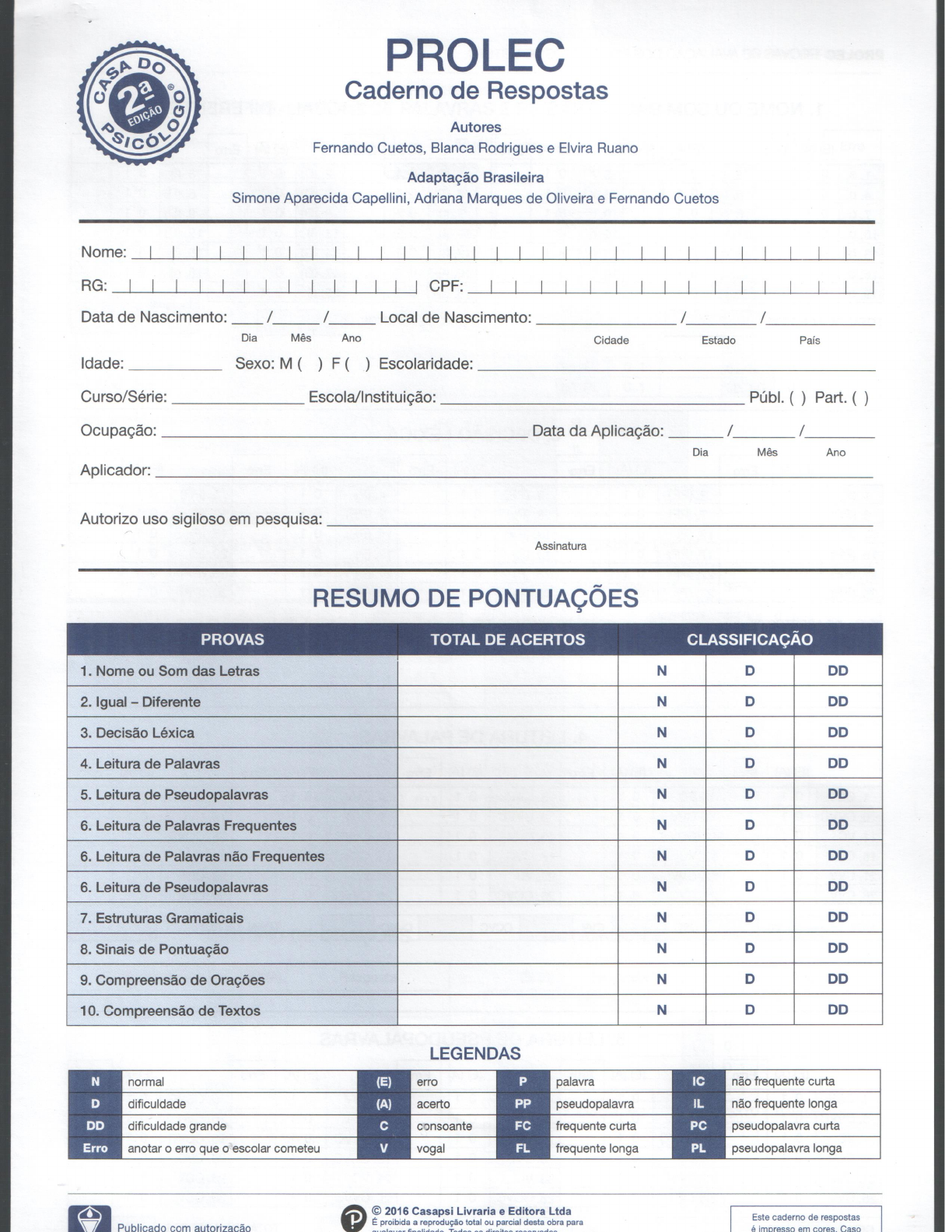 <p>DO PROLEC Caderno de Respostas EDICAO s Autores SICOL Fernando Cuetos, Blanca Rodrigues e Elvira Ruano Adaptação Brasileira Simone Aparecida Capellini, Adriana Marques de Oliveira e Fernando Cuetos Nome: RG: CPF: Data de Nascimento: / / Local de Nascimento: / / Dia Mês Ano Cidade Estado País Idade: Sexo: M ( ) F ( ) Escolaridade: Curso/Série: Escola/Instituição: Públ. ( ) Part. ( ) Ocupação: Data da Aplicação: / / Dia Mês Ano Aplicador: Autorizo uso sigiloso em pesquisa: Assinatura RESUMO DE PONTUAÇÕES PROVAS TOTAL DE ACERTOS CLASSIFICAÇÃO 1. Nome ou Som das Letras N D DD 2. Igual - Diferente N D DD 3. Decisão Léxica N D DD 4. Leitura de Palavras N D DD 5. Leitura de Pseudopalavras N D DD 6. Leitura de Palavras Frequentes N D DD 6. Leitura de Palavras não Frequentes N D DD 6. Leitura de Pseudopalavras N D DD 7. Estruturas Gramaticais N D DD 8. Sinais de Pontuação N D DD 9. Compreensão de Orações N D DD 10. Compreensão de Textos N D DD LEGENDAS N normal (E) erro P palavra IC não frequente curta D dificuldade (A) acerto PP pseudopalavra IL não frequente longa DD dificuldade grande C consoante FC frequente curta PC pseudopalavra curta Erro anotar o erro que cometeu V vogal FL frequente longa PL pseudopalavra longa P 2016 Casapsi Livraria e Editora Ltda É proibida a reprodução total ou parcial desta obra para Este caderno de respostas Publicado com autorização qualquer direitos é impresso em cores Caso</p><p>PROLEC PROVAS DE AVALIAÇÃO DOS PROCESSOS DE LEITURA 1. NOME OU SOM DAS LETRAS 2. IGUAL DIFERENTE (E) (A) Erro Erro (E) (A) Erro (E) (A) Erro Erro (E) (A) Erro 1. S 2. e 01 3. r 01 1. (I) 0 2. (D) 01 3. (I) 01 4. n 01 5. t 01 6. a 01 4. (D) 0 1 5. (D) 6. (D) 01 7. 8. 01 9. u 01 7. (I) 0 1 8. (D) 01 9. (D) 01 10. p 11. V 01 12. g 10. (I) 0 1 11. (I) 01 12. (D) 01 13. h 01 14. q 01 01 13. (I) 0 1 14. (D) 01 15. (I) 01 16. b 01 17. f 01 16. (I) 0 1 17. (D) 01 18. (I) 01 19. 20.j 19. (D) 20. (I) I = Igual TOTAL DE ACERTOS TOTAL DE ACERTOS D = Diferente 3. DECISÃO LÉXICA Erro (E) (A) Erro (E) (A) Erro (E) (A) Erro (E) (A) Erro 1. (P) 01 2. (PP) 01 3. (PP) 01 4. (P) 5. (PP) 01 6. (PP) 0 1 7. (PP) 0 1 8. (P) 01 9. (PP) 10. (P) 01 11. (P) 0 1 01 13. (PP) 01 14. (PP) 15. (P) 01 16. (PP) 01 17. (PP) 01 18. (P) 01 19. (P) 20. (P) 01 21. (PP) 0 22. (PP) 01 23. (P) 01 24. (P) 01 25. (PP) 01 26. (PP) 01 27. (P) 01 28. (P) 1 29. (P) 30. (PP) 01 TOTAL DE ACERTOS (P) TOTAL DE ACERTOS (PP) TOTAL DE ACERTOS PP) 4. LEITURA DE PALAVRAS (E) (A) Erro Erro Erro Erro (E) (A) Erro 1. CCV 0 1 2. VC 3. CVC 4. CVV 01 5. CCVC 01 6. CVVC 0 1 7. CVV 01 8. CVVC 9. CCV 01 10. CVC 01 11. VC 01 12. CCVC 01 13. CVV 14. CVVC 0 1 15. CCVC 01 16. CCV 01 17. VC 01 18. CVC 01 19. CCVC 01 20. CVC 01 21. CVV 01 22. CVVC 01 23. VC 01 24. VC 25. CCV 01 26. CVV 01 27. CVC 01 28. CCVC 0 1 29. CVVC 01 30. CCV 01 CCV VC CVC CVV CCVC CVVC TOTAL DE ACERTOS 5. LEITURA DE PSEUDOPALAVRAS (E) (A) Erro (E) (A) Erro (E) (A) Erro (E) (A) Erro (E) (A) Erro 1. CCV 0 1 2. VC 01 3. CVC 01 4. CVV 01 5. CCVC 01 6. CVVC 0 1 7. CVV 0 1 8. CVVC 0 1 9. CCV 0 1 10. CVC 01 11. VC 12. CCVC 13. CVV 01 14. CVVC 0 1 15. CCVC 01 16. CCV 17. VC 01 18. CVC 01 19. CCVC 01 20. CVC 01 21. CVV 22. CVVC 01 23. VC 01 24. VC 01 25. CCV 01 26. CVV 01 27. CVC 01 28. CCVC 0 1 29. CVVC 30. CCV CCV VC CVC CVV CCVC CVVC TOTAL DE ACERTOS</p><p>Caderno de Respostas 6. LEITURA DE PALAVRAS E PSEUDOPALAVRAS (E) (A) Erro (E) (A) Erro (E) (A) Erro (E) (A) Erro (E) (A) Erro 1. FC 01 2. FL 3. PC 01 4. IL 01 5. FL 6. IC 7. PL 01 8. FC 9. IC 10. IL 1 11. PC 01 12. PL 01 13. FC 14. IL 15. PC 01 16. FL 01 17. PL 01 18. IC 01 19. PL 20. FL 01 21. IC 01 22. IL 23. IC 01 24. FC 25. FL 26. IL 27. PC 01 28. PL 01 29. PC 30. FC 31. FL 32. IL 01 33. PC 01 34. PL 35. IC 36. PL 01 37. FL 01 38. FL 39. PC 40. IC 41. FC 01 42. PL 01 43. IC 01 44. IL 01 45. PC 01 46. FL 47. PC 48. IL 49. FC 50. FC 51. IC 01 52. PL 01 53. PC 01 54. FL 55. IL 01 56. IL 01 57. IC 01 58. FC 01 59. PL 60. FC 01 TOTAL DE PALAVRAS FREQUENTES FC FL TOTAL DE PALAVRAS NÃO FREQUENTES IC IL TOTAL DE PSEUDOPALAVRAS PC PL 7. ESTRUTURAS GRAMATICAIS 8. SINAIS DE PONTUAÇÃO Resposta (E) (A) Resposta (E) (A) Sinal (E) (A) Resposta Sinal (E) (A) Resposta 1. A 1 2 3 01 2. CF 1 2 3 01 1. (,) 2. 3. P 1 2 3 01 4. CF 1 2 3 01 3. 01 4. (,) 0 5. CF 1 2 3 01 6. P 1 2 3 01 5. 6. ( 0 1 7. P 1 2 3 01 8. CF 1 2 3 7. (.) 01 8. 0 1 9. P 1 2 3 10. P 1 2 3 9. 01 10. (,) 11. A 1 2 3 01 12. A 1 2 3 11. 01 12. (,) 13. CF 1 2 3 01 14. A 1 2 3 01 13. (,) 01 14. (,) 15. A 1 2 3 01 A = Ativa 15. (,) 01 16. 01 P = Passiva TOTAL DE ACERTOS CF = Completamente focado TOTAL DE ACERTOS 9. COMPREENSÃO DE ORAÇÕES 10. COMPREENSÃO DE TEXTOS (E) (A) Resposta (E) (A) Resposta (E) (A) Resposta (E) (A) Resposta 1. 7. TEXTO 1. EXPOSITIVO TEXTO 3. NARRATIVO 1. 0 9. 2. 0 1 8. 01 2. 0 1 10. 3. 1 9. 01 3. 11. 4. 10. 01 1 2 3 4. 12. 5. 11. 01 1 2 3 TEXTO 2. EXPOSITIVO TEXTO 4. NARRATIVO 6. 01 12. 01 1 2 3 5. 0 1 13. 6. 14. TOTAL DE ACERTOS 7. 15. 8. 16.</p><p>PROLEC PROVAS DE AVALIAÇÃO DOS PROCESSOS DE LEITURA 4. Desenhe uma árvore e três maçãs. 5. Desenhe duas nuvens e um sol. 6. Desenhe um quadrado dentro de um círculo. 7. Desenhe um guarda-chuva na mão do palhaço. 8. Marque o nariz do cachorro. 9. Desenhe um bigode no rato. P 2016 Casapsi Livraria e Editora Ltda É proibida a reprodução total ou parcial desta obra para qualquer Todos os direitos reservados. Av. Francisco 1500 cj. 51. York</p><p>PROLEC PROVAS DE AVALIAÇÃO DOS PROCESSOS DE LEITURA MANUAL Autores Fernando Cuetos, Blanca Rodrigues e Elvira Ruano Adaptação Brasileira Simone Aparecida Capellini, Adriana Marques de Oliveira e Fernando Cuetos DO Casa do Psicólogo R uma empresa PEARSON PSICOL</p><p>PROLEC PROVAS DE AVALIAÇÃO DOS PROCESSOS DE LEITURA MANUAL Autores Fernando Cuetos, Blanca Rodrigues e Elvira Ruano Adaptação para o português Autores: Simone Aparecida Capellini, Adriana Marques de Oliveira e Fernando Cuetos São Paulo Publicado com autoriz