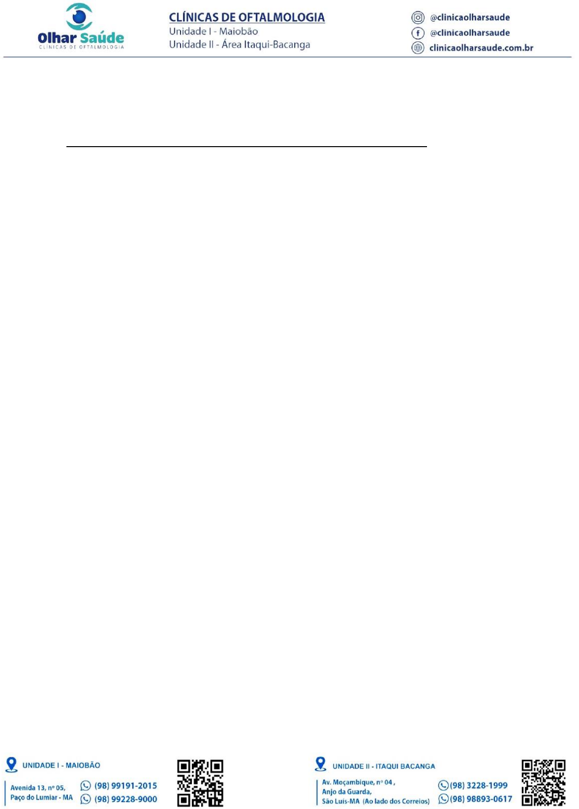 <p>TERMO DE CIÊNCIA E CONSENTIMENTO PARA REALIZAÇÃO</p><p>DE CIRURGIA DE FACECTOMIA</p><p>NOME: PAULO FERREIRA DA LUZ</p><p>CIRURGIA: FACECTOMIA+IMPLANTE DE LIO MONOFOCAL EM OLHO ESQUERDO</p><p>CIRURGIÃO: DR. ALVARO BOTENTUIT</p><p>Por meio deste documento, declaro, para todos os fins legais, que dou plena autorização ao médico acima indicado</p><p>e a sua equipe, para executar o tratamento cirúrgico especificado e todos os procedimentos oftalmológicos que o</p><p>integram e que se fizerem necessários, além da anestesia, e outras condutas médico-cirúrgicas que tal tratamento</p><p>venha a exigir.</p><p>Afirmo estar plenamente consciente de que a cirurgia visa, com a remoção da catarata, a melhorar a minha visão,</p><p>mas que o resultado esperado pode não ser alcançado devido à existência de outras alterações oculares</p><p>associadas à catarata (da córnea, da retina ou do nervo óptico) e igualmente à possibilidade de ocorrência de</p><p>complicações ligadas ao próprio ato cirúrgico.</p><p>Para que não ficasse nenhuma dúvida quanto à cirurgia proposta e para que eu pudesse autorizá-la plenamente</p><p>conhecedor dos seus princípios, indicações, riscos e resultados, declaro ainda, livre de qualquer coação ou</p><p>constrangimento, que o cirurgião e sua equipe forneceu-me, e aos meus familiares e acompanhantes, as</p><p>informações que se seguem referente a cada um desses itens.</p><p>Igualmente declaro estar ciente de que a cirurgia a ser realizada, em face da possibilidade de ocorrência de riscos e</p><p>complicações, não permite ao cirurgião e sua equipe assegurar-me a garantia expressa ou implícita da recuperação</p><p>visual.</p><p>Princípios e indicações:</p><p>A cirurgia de remoção da catarata (facectomia) é realizada com vistas à recuperação total ou parcial da visão do</p><p>olho afetado. A extensão da recuperação visual vai depender da existência ou não de doenças ou alterações de</p><p>outras estruturas oculares associadas à catarata (doenças da córnea, doenças da retina e do nervo óptico,</p><p>principalmente) e, igualmente, da magnitude dos riscos e complicações que podem ocorrer durante e após a</p><p>cirurgia.</p><p>Riscos e Complicações:</p><p>A cirurgia de catarata (facectomia) necessita da abertura do globo ocular e isso expõe o olho a riscos de</p><p>hemorragias e infecções. O trauma cirúrgico, mesmo sem intercorrências, pode precipitar, em olhos predispostos,</p><p>complicações retinianas (edema, hemorragias e descolamento de retina), corneanas (lesões endoteliais, edemas) e</p><p>processos inflamatórios (uveite). A implantação da lente intraocular, procedimento padrão, pode não ser possível ou</p><p>aconselhável, sempre que isso possa ocorrer para aumentar as chances de complicações que venham a</p><p>comprometer o olho e diminuir a possibilidade de recuperação da visão.</p><p> CIRURGIA DE RETINA: É ciente que será feita a remoção de óleo de silicone, entretanto poderá haver</p><p>necessidade de implantar um novo óleo de silicone, isso geralmente ocorre quando há redescolamento de</p><p>retina ou quando há risco de atrofia do globo ocular.</p><p> CIRURGIA DE CATARATA: No caso da cirurgia de catarata poderá ser utilizado a lente monofocal, onde o</p><p>paciente precisará do uso de óculos ou será usada as lentes bifocais ou trifocais no qual vai reduzir a</p><p>dependência de óculos, mas não garante que o paciente consiga ler totalmente sem óculos.</p><p>Por fim, volto a declarar que estou plenamente satisfeito quanto ao esclarecimento de minhas dúvidas e questões,</p><p>o que foi feito em linguagem clara, acessível e precisa pelo cirurgião e sua equipe. E assim sendo, tendo ouvido,</p><p>lido e aceito as explicações sobre os objetivos, bem como sobre os riscos e complicações mais comuns da</p><p>facectomia e das chances de insucesso, parcial ou total da mesma, eu declaro, o meu pleno e irrestrito</p><p>consentimento para a sua realização.</p><p>Paço do Lumiar, (MA), ____________/____________/________________</p><p>__________________________________________ __________________________________________</p><p>(Assinatura do Paciente) (Assinatura do Responsável)</p><p>__________________________________________ __________________________________________</p><p>Testemunha Testemunha</p>