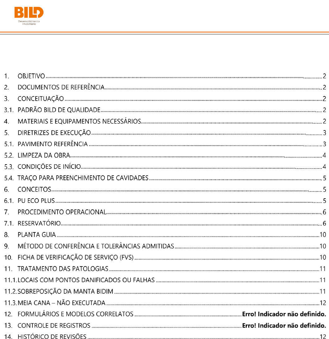 <p>SISTEMA DE GESTÃO DA QUALIDADE – ESPECIFICAÇÃO TÉCNICA</p><p>IMPERMEABILIZAÇÃO – RESERVATÓRIO SUPERIOR</p><p>IDENTIFICAÇÃO/ REVISÃO FOLHA</p><p>ET.B.04–2.00</p><p>01/04/2020</p><p>1 / 12</p><p>Elaborado por: Revisado e aprovado por:</p><p>BOPE Gestor da Qualidade</p><p>SISTEMA DE GESTÃO DA QUALIDADE – ESPECIFICAÇÃO TÉCNICA</p><p>IMPERMEABILIZAÇÃO – RESERVATÓRIO SUPERIOR</p><p>IDENTIFICAÇÃO/ REVISÃO FOLHA</p><p>ET.B.04–2.00</p><p>01/04/2020</p><p>2 / 12</p><p>OBJETIVO</p><p>Definir o Padrão Bild de Qualidade para a execução de impermeabilização e estabelecer as condições, os</p><p>Procedimentos operacionais e os métodos de conferência para atingi-lo e eventuais correções de acordo com</p><p>o GUIA.B.23 - Pavimento referência execução de serviço</p><p>Orientar a compra de materiais e contratação dos serviços necessários para a execução da impermeabilização.</p><p>DOCUMENTOS DE REFERÊNCIA</p><p>• Projetos de Impermeabilização e seus respectivos cadernos</p><p>• ABNT - NBR 9754 – Execução de Impermeabilização</p><p>• ABNT - NBR 9575 – Impermeabilização - Seleção e projeto</p><p>• ABNT – NBR 15575 – Norma de Desempenho</p><p>• Projetos de hidráulica</p><p>CONCEITUAÇÃO</p><p>3.1. Padrão Bild de Qualidade</p><p>É o conjunto de condições e características mínimas exigidas para o recebimento final pela engenharia Bild</p><p>de um determinado serviço executado.</p><p>Essas condições e características mínimas provêm de:</p><p>a) Exigências e satisfação dos nossos Clientes</p><p>b) Conhecimento adquirido:</p><p>• Melhores práticas</p><p>• Eliminação de patologias</p><p>• Melhoria contínua dos processos e qualidade do produto</p><p>c) Redução de custo e prazo</p><p>d) Incremento de qualidade e sensação de segurança</p><p>MATERIAIS E EQUIPAMENTOS NECESSÁRIOS</p><p>RESPONSABILIDADES BILD</p><p>Instrumentos</p><p>de medida e</p><p>conferência</p><p>* Trena Metálica</p><p>Execução</p><p>*</p><p>*</p><p>*</p><p>*</p><p>Grout</p><p>Adesivo PVA</p><p>Fita Adesiva</p><p>Argamassa colante</p><p>*</p><p>Areia Média</p><p>* Cimento CP II - E 32/ CP II - Z 32 / Cimento CP III</p><p>* Selante PU para tratamento de fissuras</p><p>SISTEMA DE GESTÃO DA QUALIDADE – ESPECIFICAÇÃO TÉCNICA</p><p>IMPERMEABILIZAÇÃO – RESERVATÓRIO SUPERIOR</p><p>IDENTIFICAÇÃO/ REVISÃO FOLHA</p><p>ET.B.04–2.00</p><p>01/04/2020</p><p>3 / 12</p><p>RESPONSABILIDADES FORNECEDOR</p><p>Instrumentos</p><p>de medida e</p><p>conferência</p><p>* Trena metálica</p><p>Execução</p><p>* PU ECO PLUS</p><p>*</p><p>Tinta à base de epóxi (100% sólidos) com espessura mínima de</p><p>300 micrômetros.</p><p>*</p><p>Tinta à base de epóxi (100% sólidos) com espessura mínima de</p><p>300 micrômetros.</p><p>* Colher de pedreiro</p><p>* Escova de cerda metálica</p><p>* Rolo de lã</p><p>* Manta Bidim Branca</p><p>* Selante Pu para vedação das tubulações</p><p>* Vassoura de Piaçava</p><p>* Lanterna ou lâmpada</p><p>* Misturador elétrico</p><p>* Brocha</p><p>* Masseira plástica</p><p>* Aspirador industrial</p><p>DIRETRIZES DE EXECUÇÃO</p><p>5.1. PAVIMENTO REFERÊNCIA</p><p>Para todas as etapas iniciadas no reservatório, deverá ser realizada a validação destas etapas, conforme</p><p>padrão normativo GUIA.B.23 Pavimento referência de execução de serviço. O objetivo é compatibilizar</p><p>os projetos e definir as características mínimas exigíveis para o serviço atingir o Padrão BILD de Qualidade.</p><p>O reservatório a validação acontecerá em 3 etapas, conforme descrito na planilha F.QLD.B.16 - Validação</p><p>de Pavimento Referência:</p><p>1º ETAPA</p><p>• Após realizado o teste de carga + o preparo da superfície e pintura do teto</p><p>2º ETAPA</p><p>SISTEMA DE GESTÃO DA QUALIDADE – ESPECIFICAÇÃO TÉCNICA</p><p>IMPERMEABILIZAÇÃO – RESERVATÓRIO SUPERIOR</p><p>IDENTIFICAÇÃO/ REVISÃO FOLHA</p><p>ET.B.04–2.00</p><p>01/04/2020</p><p>4 / 12</p><p>• Após a instalação da manta bidim</p><p>3º ETAPA</p><p>• Após a finalização da aplicação do produto.</p><p>Deverão ser verificados:</p><p>• Aderência da execução ao projeto – Quando aplicável</p><p>• Incompatibilidades de projeto e/ou interferência com demais serviços;</p><p>• Oportunidades de melhoria na execução;</p><p>• Atendimento aos critérios estabelecidos em FVS;</p><p>• Substrato sem pontas de madeiras, ferros ou qualquer outro elemento que possa danificar o sistema</p><p>• Verificação da qualidade da pintura do teto especificação da tinta</p><p>• Verificação da meia cana</p><p>• Sobreposição entre mantas</p><p>• Sobreposição da manta vertical sobre horizontal</p><p>• Verificar limite máximo de água</p><p>• Tubulações reforçadas</p><p>• Reforço nos encontros (Piso x Parede e Parede x Parede)</p><p>• Sem falhas de pintura</p><p>• Terminabilidade;</p><p>5.2. LIMPEZA DA OBRA</p><p>O fornecedor é responsável pelo descarte de todos os resíduos gerados durante a execução do serviço,</p><p>seguindo as orientações da equipe de obra BILD.</p><p>O fornecedor deverá manter o local limpo para entrega a equipe BILD, caso contrário pode ser mérito de</p><p>paralização de medição.</p><p>5.3. CONDIÇÕES DE INÍCIO</p><p>• Checar se as instalações (hidráulicas, elétricas e outras) já estão realizadas de forma correta na etapa que</p><p>precede a impermeabilização (conferência dos projetos).</p><p>• Todas fixações como ralos, Tubulações emergentes FINALIZADAS antes da execução da</p><p>impermeabilização;</p><p>• Pontas de ferros cortadas</p><p>• Para toda mistura, deve-se sempre utilizar água limpa, isenta de óleos ou outros materiais contaminantes</p><p>e masseira plástica;</p><p>• Verificar se os produtos para a realização da impermeabilização estão de acordo com o especificado</p><p>para área a ser impermeabilizad