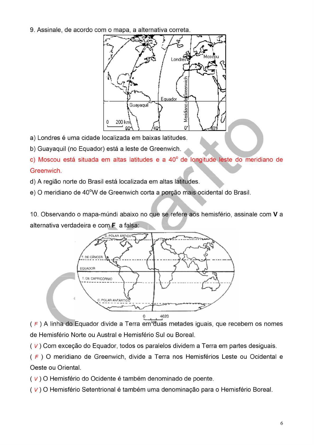 <p>9. Assinale, de acordo com o mapa, a alternativa correta. Moscou Londres Equador Guayaquil 0 200 kml 80 a) Londres é uma cidade localizada em baixas latitudes. b) Guayaquil (no Equador) está a leste de Greenwich. c) Moscou está situada em altas latitudes e a 40° de longitude leste do meridiano de d) A região norte do Brasil está localizada em altas latitudes. e) O meridiano de 40°W de Greenwich corta a porção mais ocidental do Brasil. 10. Observando o mapa-múndi abaixo no que se refere aos hemisfério, assinale com V a alternativa verdadeira e com F a falsa: ÁRTICO T DE CÂNCER EQUADOR T. DE C. POLAR ANTÁRTICO 0 4620 (F) A linha do Equador divide a Terra em metades iguais, que recebem os nomes de Hemisfério Norte ou Austral e Hemisfério Sul ou Boreal. ( (V) Com exceção do Equador, todos os paralelos dividem a Terra em partes desiguais. (F) O meridiano de Greenwich, divide a Terra nos Hemisférios Leste ou Ocidental e Oeste ou Oriental. ( O Hemisfério do Ocidente é também denominado de poente. ( O Hemisfério Setentrional é também uma denominação para o Hemisfério Boreal. 6</p>